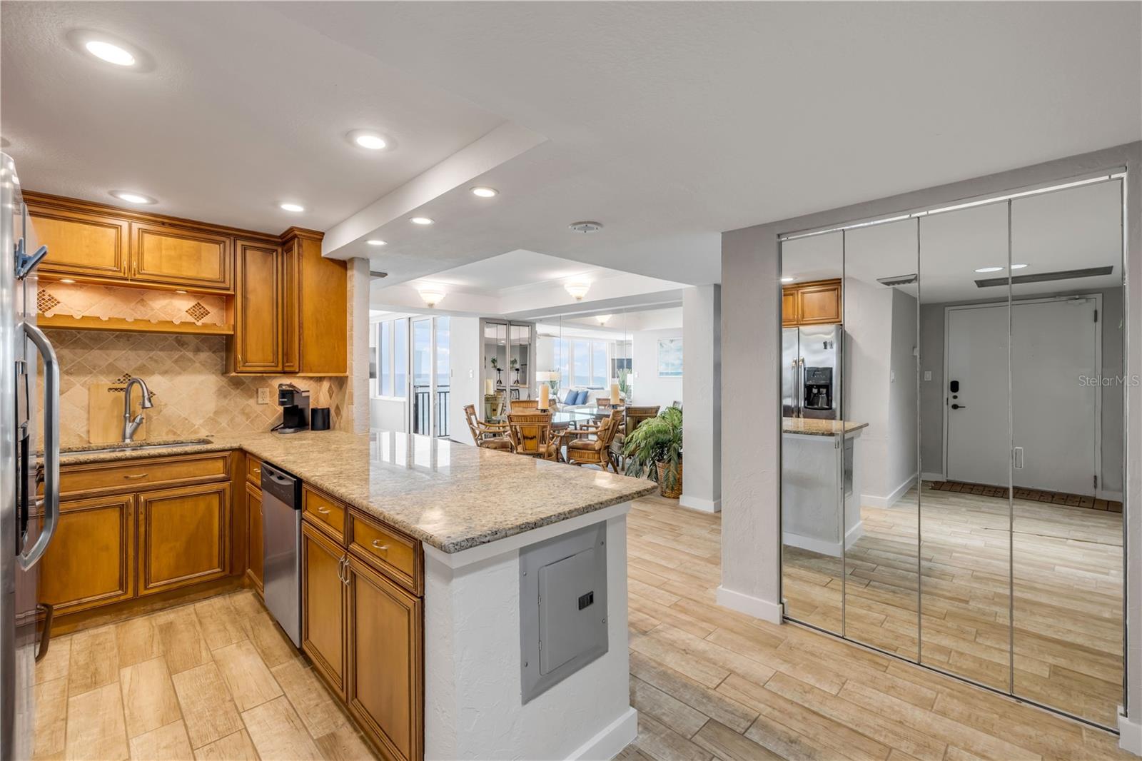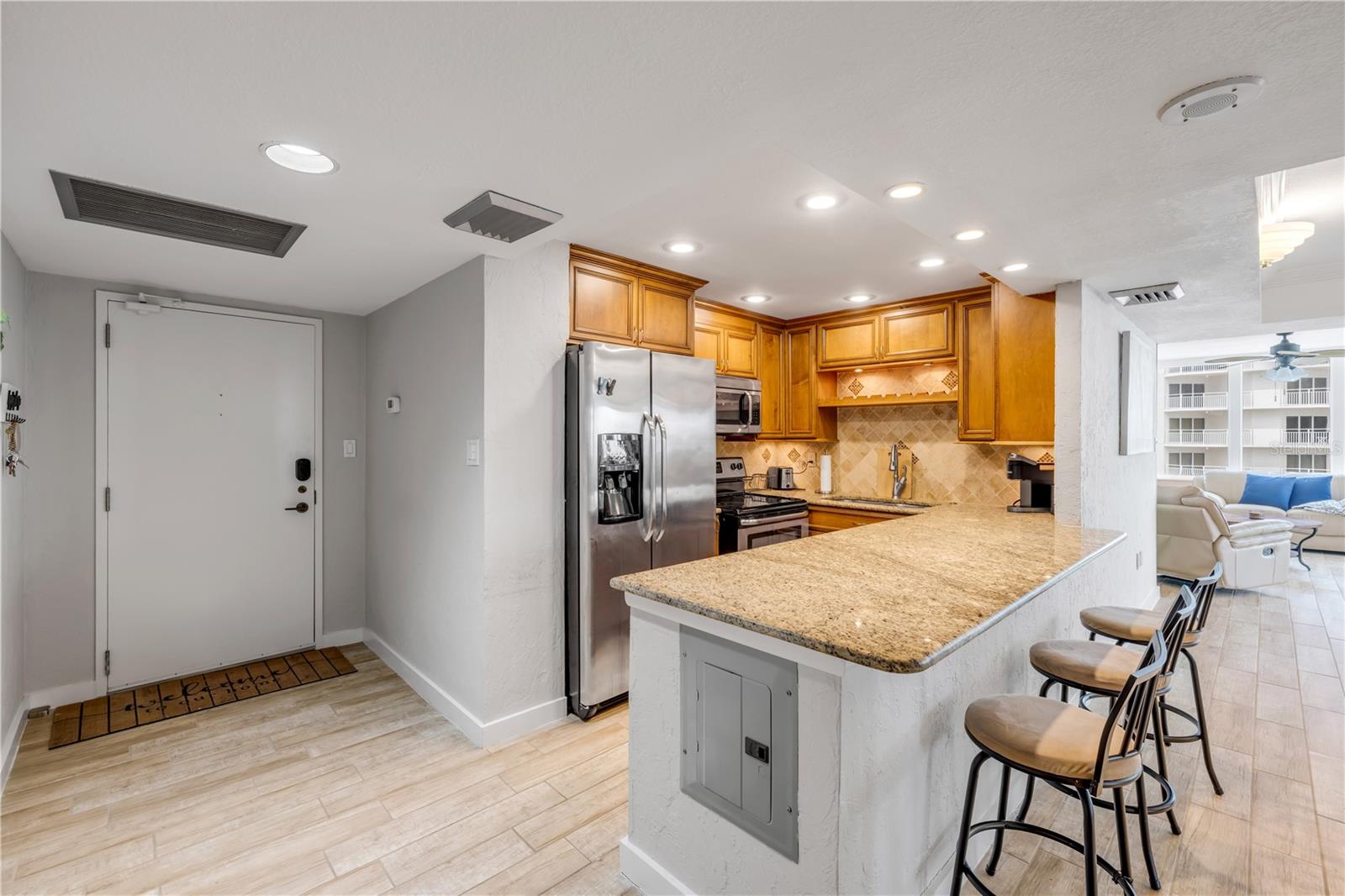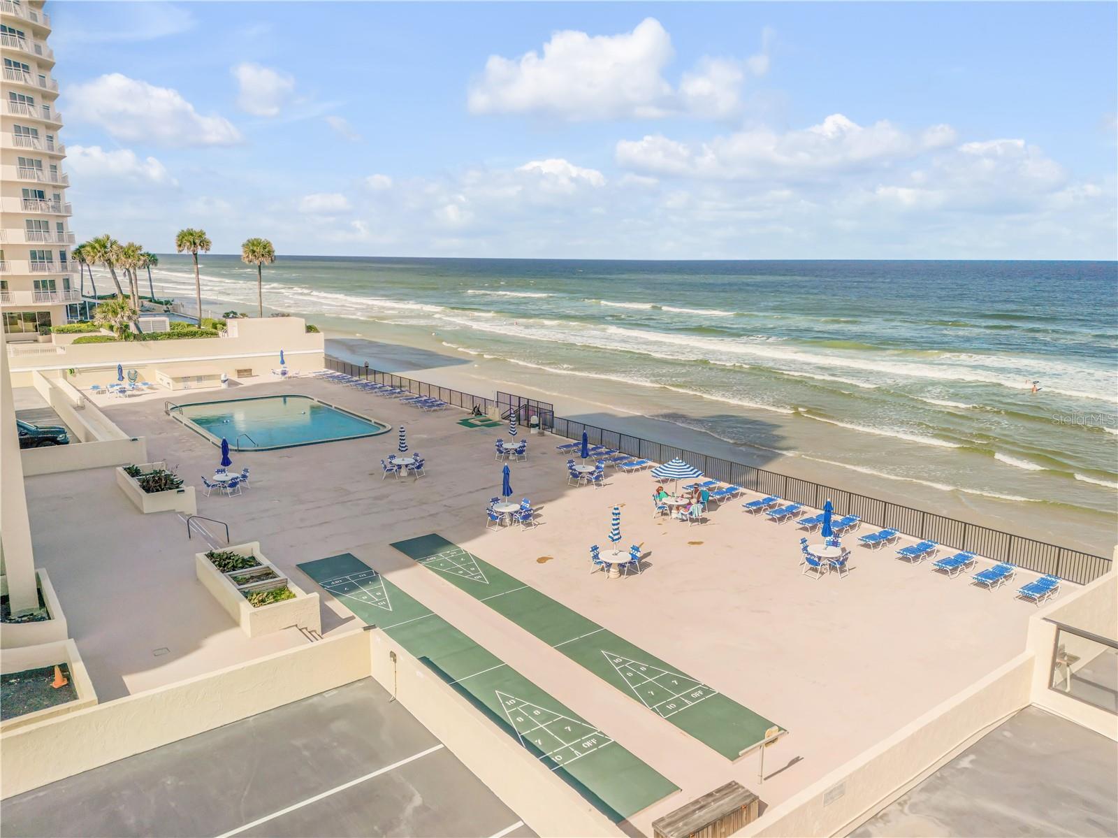 Direct oceanfront condo home with breathtaking ocean views can be yours! This fully furnished, upgraded home on the 11th-floor sits on the pristine white sands of Daytona Beach Shores. This showstopping 2-bedroom, 2-bathroom residence spans 1,200 square feet and comes fully furnished with high-end finishes throughout. Recent updates include kitchen and bathrooms, $40,000 worth of hurricane-rated windows and sliders in 2023, remote-control blinds, 2021 hot water heater, and luxury vinyl flooring throughout - every detail carefully designed to enhance both style and comfort. The gourmet kitchen is a true centerpiece, featuring cabinetry with elegant rope detailing, granite countertops, stainless steel appliances, a gooseneck faucet, recessed lighting, and a spacious island that opens to the living area making it perfect for entertaining or family gatherings. Both bedrooms offer uninterrupted ocean views, while the master suite includes a fully tiled bathroom with wood cabinetry, granite counters, and a sleek glass-enclosed shower. This pet-friendly condo (1 pet up to 25 lbs) is part of the highly desirable Oceans Five community, offering premium amenities such as a heated outdoor pool with an expansive sun deck, BBQ area, shuffleboard courts, saunas, social room, fitness center, beautifully appointed library, pool table lounge, private storage, underground parking, and direct beach access. Ideally located near shopping and restaurants and within minutes from the iconic Ponce Inlet Lighthouse, this is coastal living at its finest. This rare opportunity will not last long, schedule your showing today!