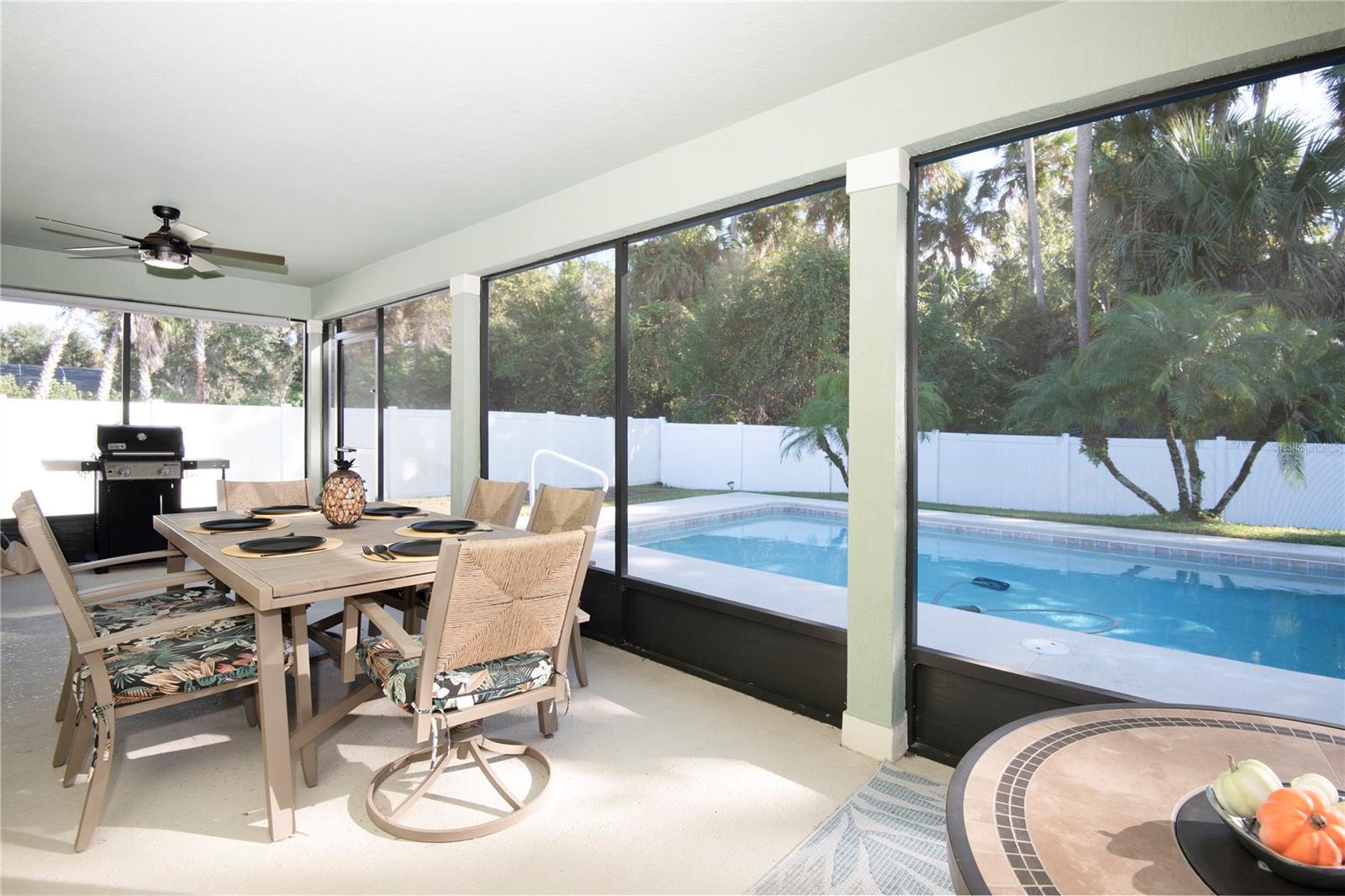 Move-in ready 3BR/2BA pool home in the centrally located neighborhood of Tuscany Woods. This well-maintained home features elegant tile flooring throughout, a screened lanai, and a private fenced backyard with lush landscaping and fruit-bearing trees. Just imagine picking your own bananas for breakfast! Enjoy a refreshing pool, a welcoming open layout, and easy access to shopping, dining, and major medical facilities. New Trader Joes and Sprouts opening soon. Halifax Health (3.1 mi), AdventHealth (1.5 mi), VA Clinic (1.1 mi) Newer roof from 2021 and easy to use storm shutters.