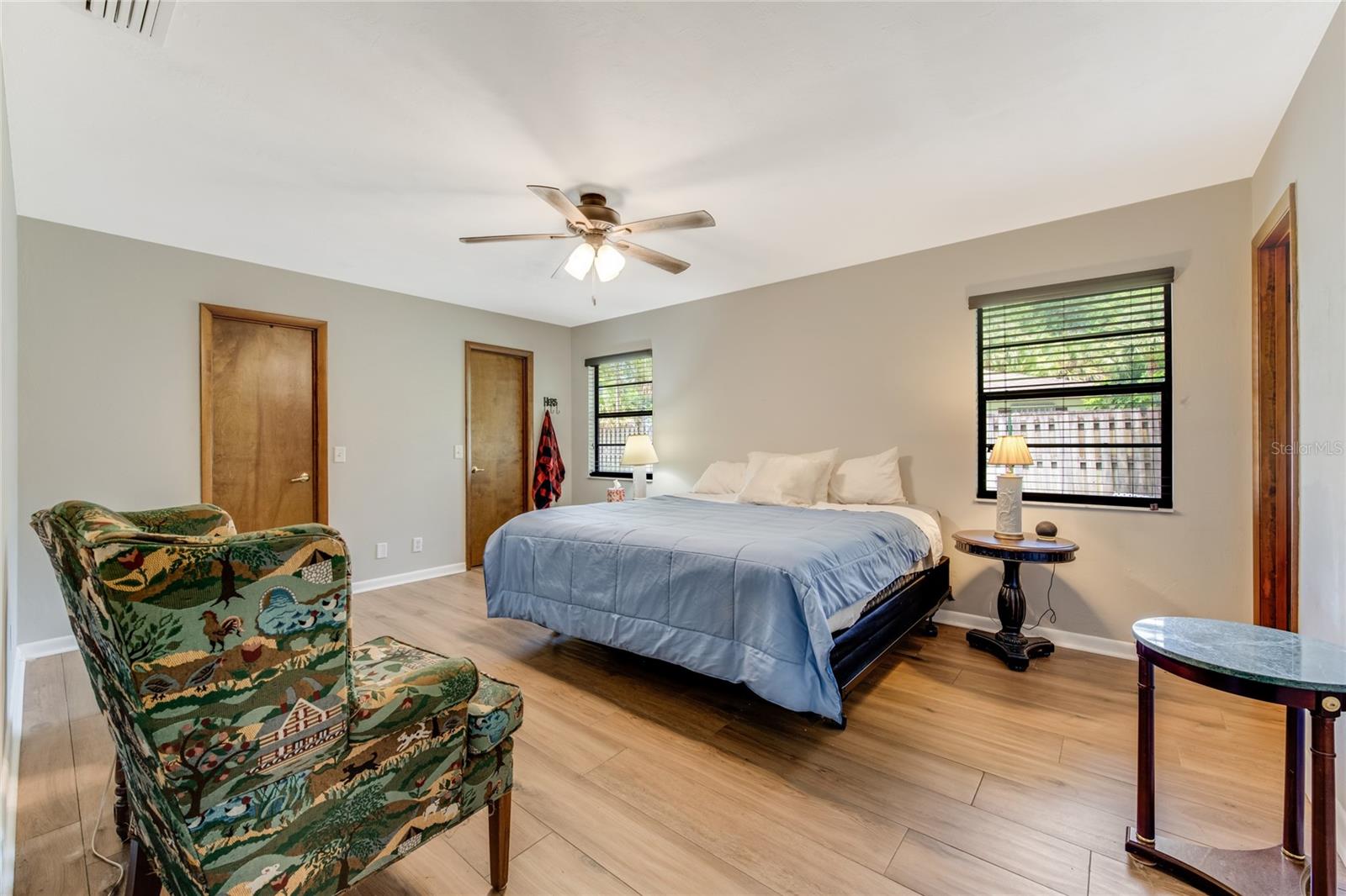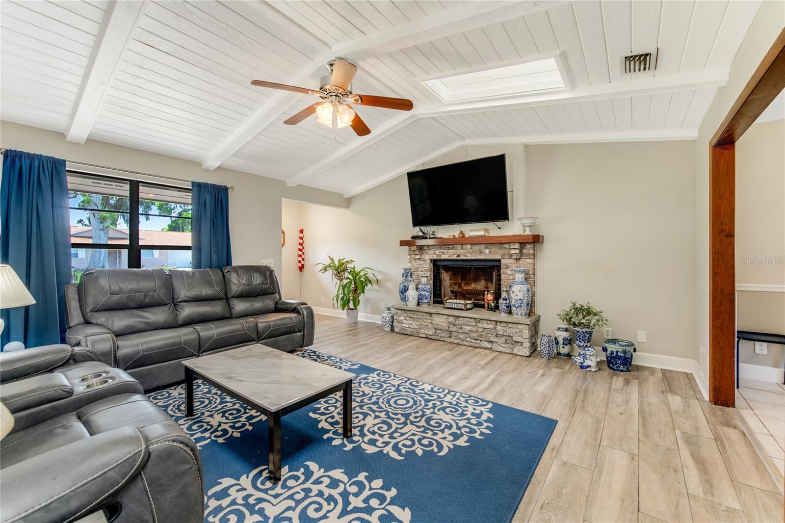 $13,000 BUYER CONCESSIONS. This home features three bedrooms, two bathrooms, and a two-car garage with 1483 living square feet. The open kitchen offers light cabinets, butcher block countertops, and stainless steel appliances. The living room has light & bright skylights, a wood-burning fireplace, and the entire home has tile floors. The fenced-in backyard includes vehicle access gates and a patio, which is excellent for relaxing, listening to the birds, and having a BBQ. The primary bedroom is a vast 17x12, easily fitting a king-size bed with more space than you'll use. The garage has a mini-split AC system and a second refrigerator to keep you cool for your projects. ROOF 2019, AC 2016. Furnishings are available separately.
