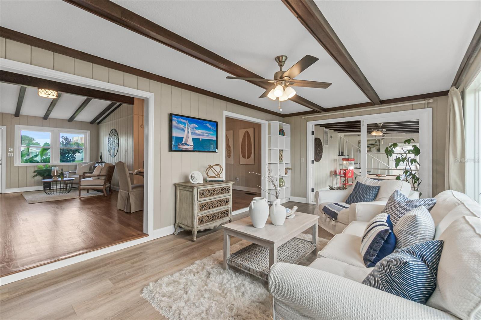 DIRECT WATERFRONT. Welcome to your charming getaway or permanent home, where old Florida style meets modern comfort. A few of the original features are the beautiful beamed ceilings, classic tiled bathrooms and gleaming hardwood floors. Two master suites - one on the main level and one on the upper. Just minutes from the beach, famous dining spots, unique shopping locations, and the State's tallest lighthouse and museum. This spacious family home offers the perfect balance of relaxation and adventure. With plenty of room for family and friends, the home features expansive living areas and cozy nooks, ideal for gathering together or enjoying quiet moments by the water. Whether fishing off the dock, lounging on the deck, or exploring the nearby attractions, this home is the perfect setting for making unforgettable memories. Some of the updates include: roof in 2022, new electric panel, PEX plumbing, one newer A/C unit, sprinklers & granite in the kitchen. Termite Bond included. Survey in hand.