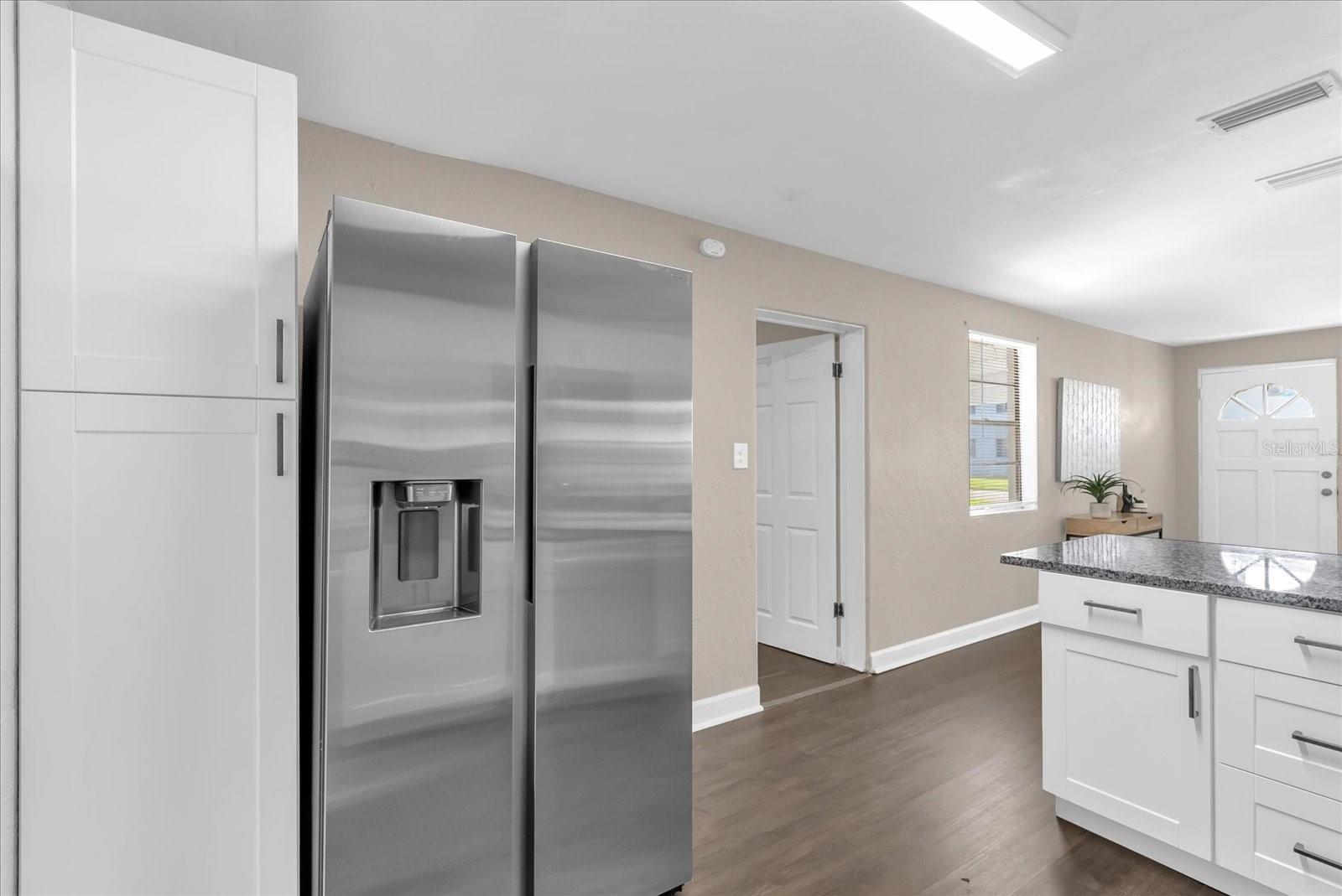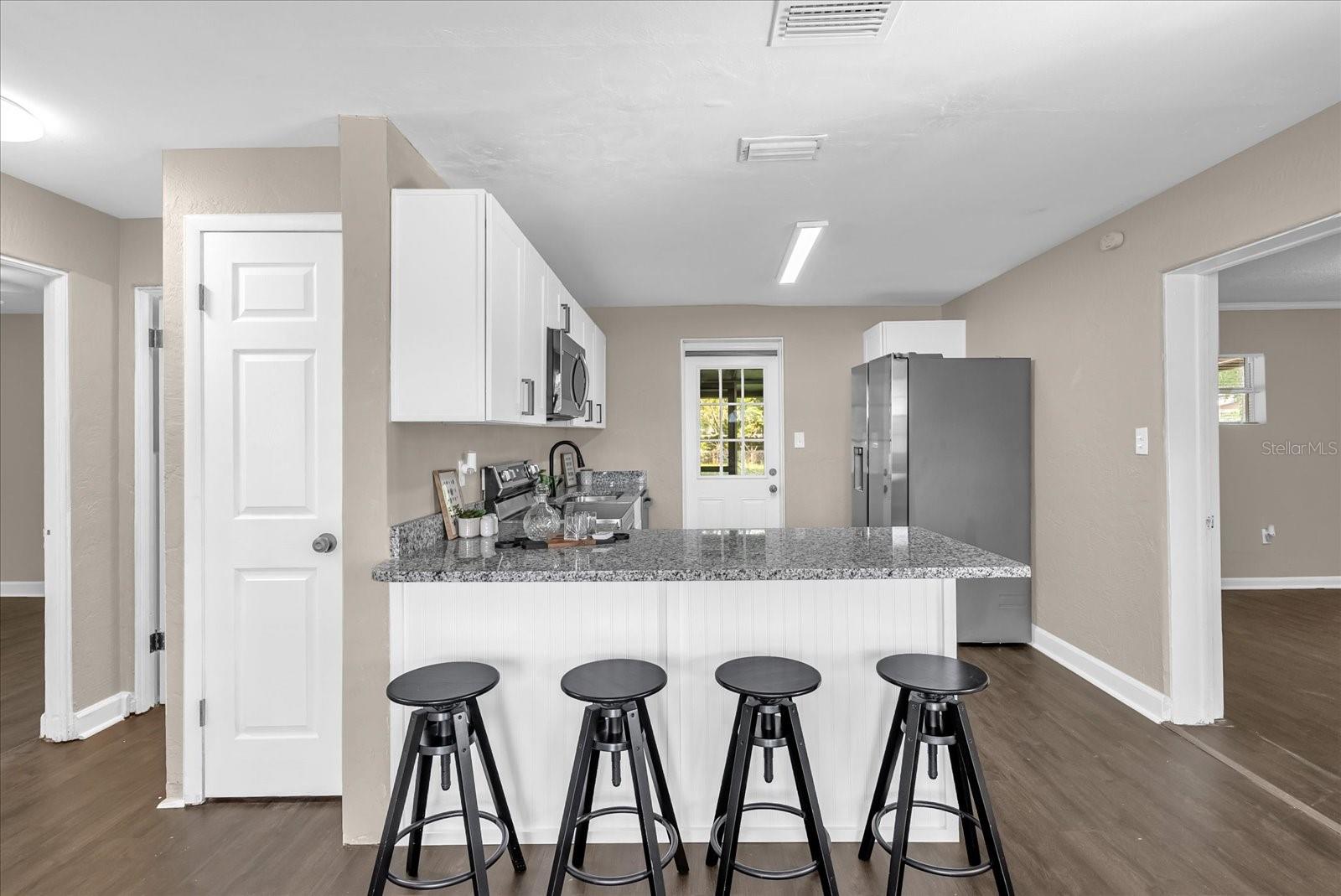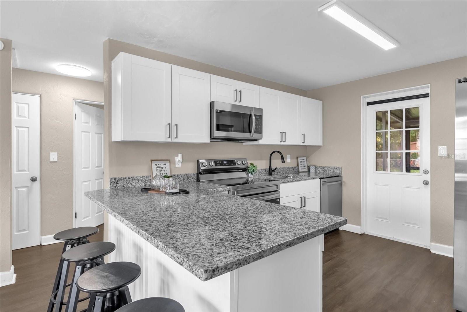 Fresh Farm Style...3 bed/1 bath. Split floor plan, New wht shaker cabinets with 'Luna Pearl' Granite in kitchen & baths w/ under mount sinks; All NEW Samsung gourmet stainless steel appliances; Large breakfast bar with TONS of cabinetry; All new luxury vinyl plank flooring thru-out entire home (no carpet); All new faucets, fixtures, fans & LED lighting; New 3 tone paint inside and out; Brand NEW roof; Extra large, screened-in back patio; RV parking; Fully fenced in backyard for pets and privacy.