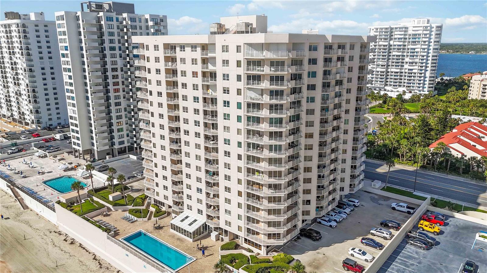 This stunning condo is the lifestyle you've been dreaming of your entire life! This Oceans Six tenth floor condo sits diagonally perfectly on the North side of the building which gives the main forward view of the unit facing the Atlantic Ocean, but because it's a corner unit, the rear side bedroom balcony also has an amazing view of the Halifax River. So enjoy the peaceful Atlantic Ocean sunrises in the morning with your coffee on the balcony or in your living room facing the Ocean or enjoy a glass of wine on the rear facing balcony in the evening for the most amazing sunset over the Halifax River. The Primary bedroom also faces the Atlantic Ocean with a slider and balcony that will make your days ease by. The kitchen has top notch stainless appliances and granite counter tops. The bathrooms are also stunningly upgraded with granite counters and decorative designs. The dining room has a built in display cabinet with a wine fridge. All the windows are elegant with plantation shutters for blinds just in case you need some rest from the warm Florida sun! The building has an indoor pool, a heated whirlpool, and an outdoor pool! There is a clubhouse area, a fitness center, and of course a world renowned beach to spend your days! Included is a dedicated parking spot in the garage, and a dedicated storage locker so you won't have to lug your beach toys back and forth to your unit. There is a grocery store, drug store, Par 3 golf course, Urgent care center, City and County parks that are all just minutes away on foot or by car. Don't miss the video tour showing this unit. Set up an appointment to view it right away before it becomes someone's dream home!