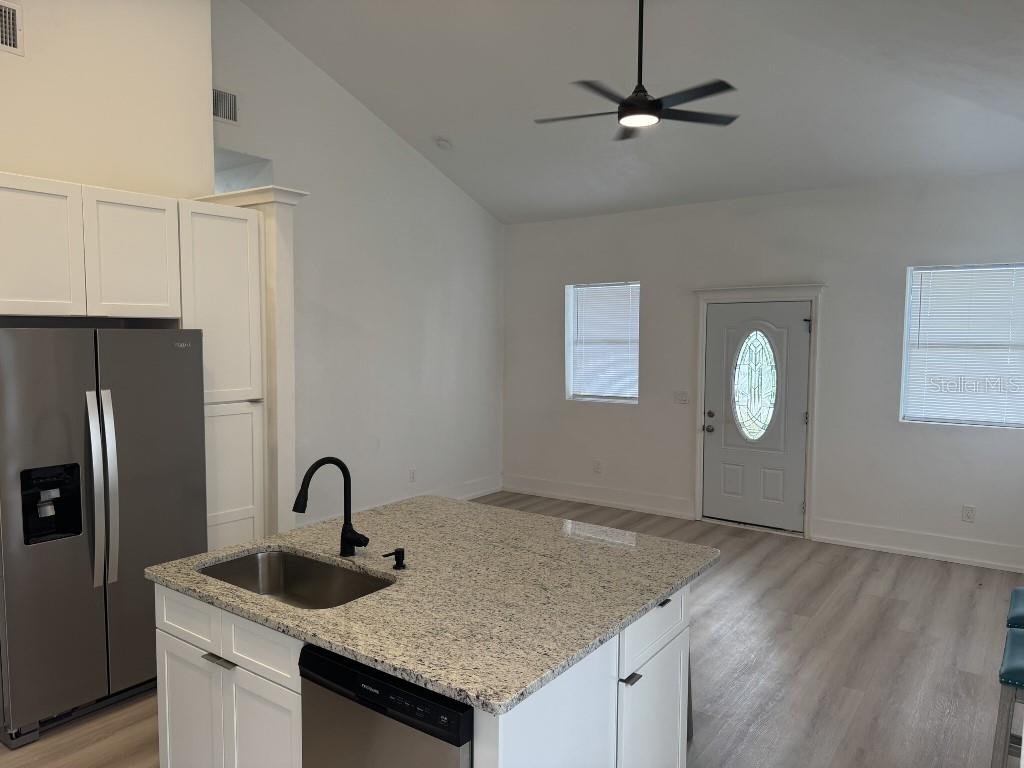 COMPLETELY REMODELED 3 BEDROOM 2 BATH HOME. HIGH AND DRY - NOT IN FLOOD ZONE. LVP FLOORING, NEW CABINETS, GRANITE TOPS, NEW APPLIANCES, VAULTED CEILINGS, NEW ROOF, NEW PLUMBING, INCLUDING UNDERGROUND, ALL NEW WIRING AND PANEL, NEW HVAC SYSTEM. ALL WORK WAS PERMITTED WITH CITY OF HOLLY HILL. GREAT LOCATION !! 4 BLOCKS FROM SUNRISE PARK AND BOAT RAMP ON THE HALIFAX RIVER INTERCOASTAL WATERWAY. ROOM FOR BOAT AND RV IN YARD. $8000 Buyer concession Possible Owner Financing-Lease Purchase”