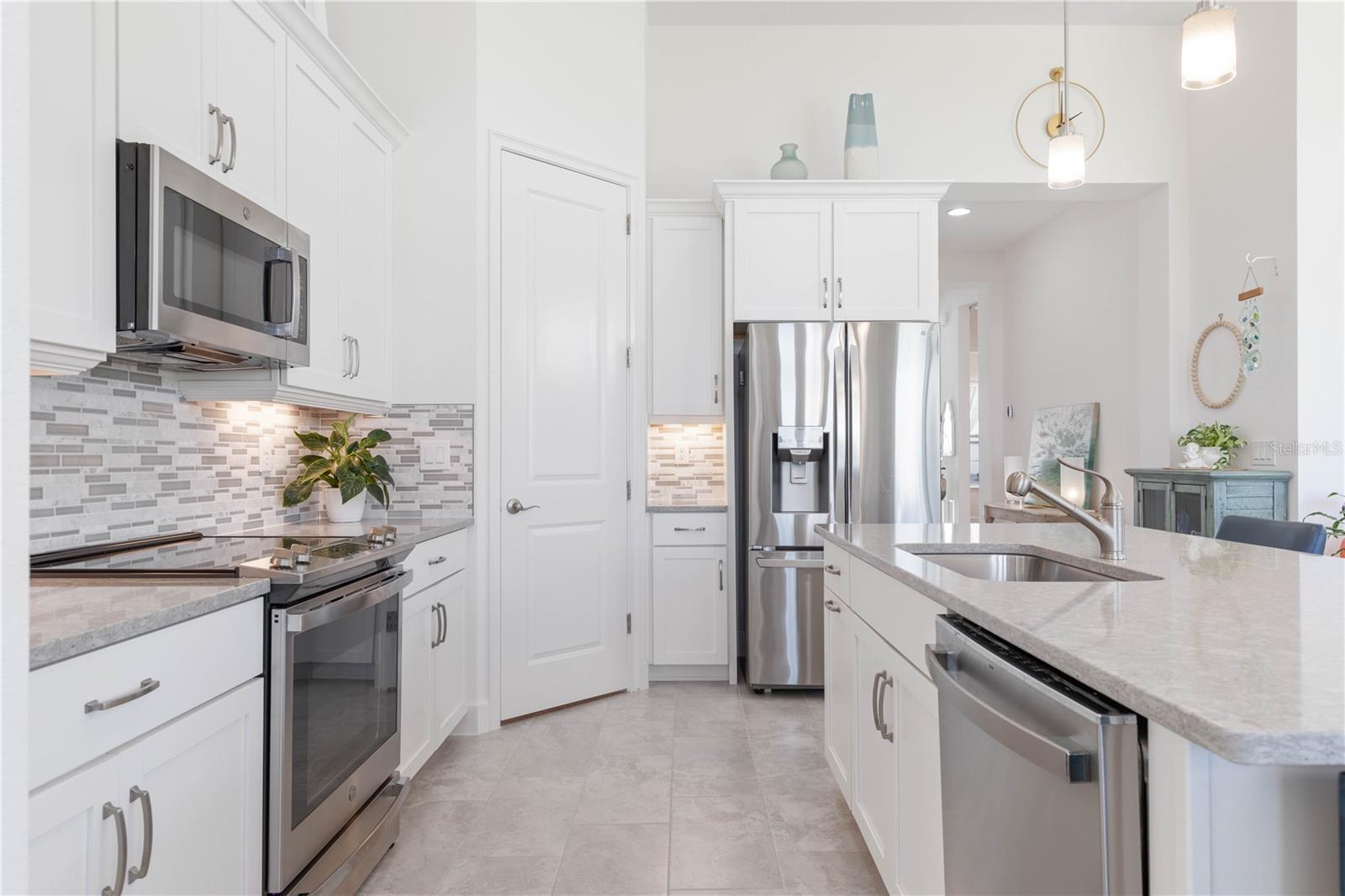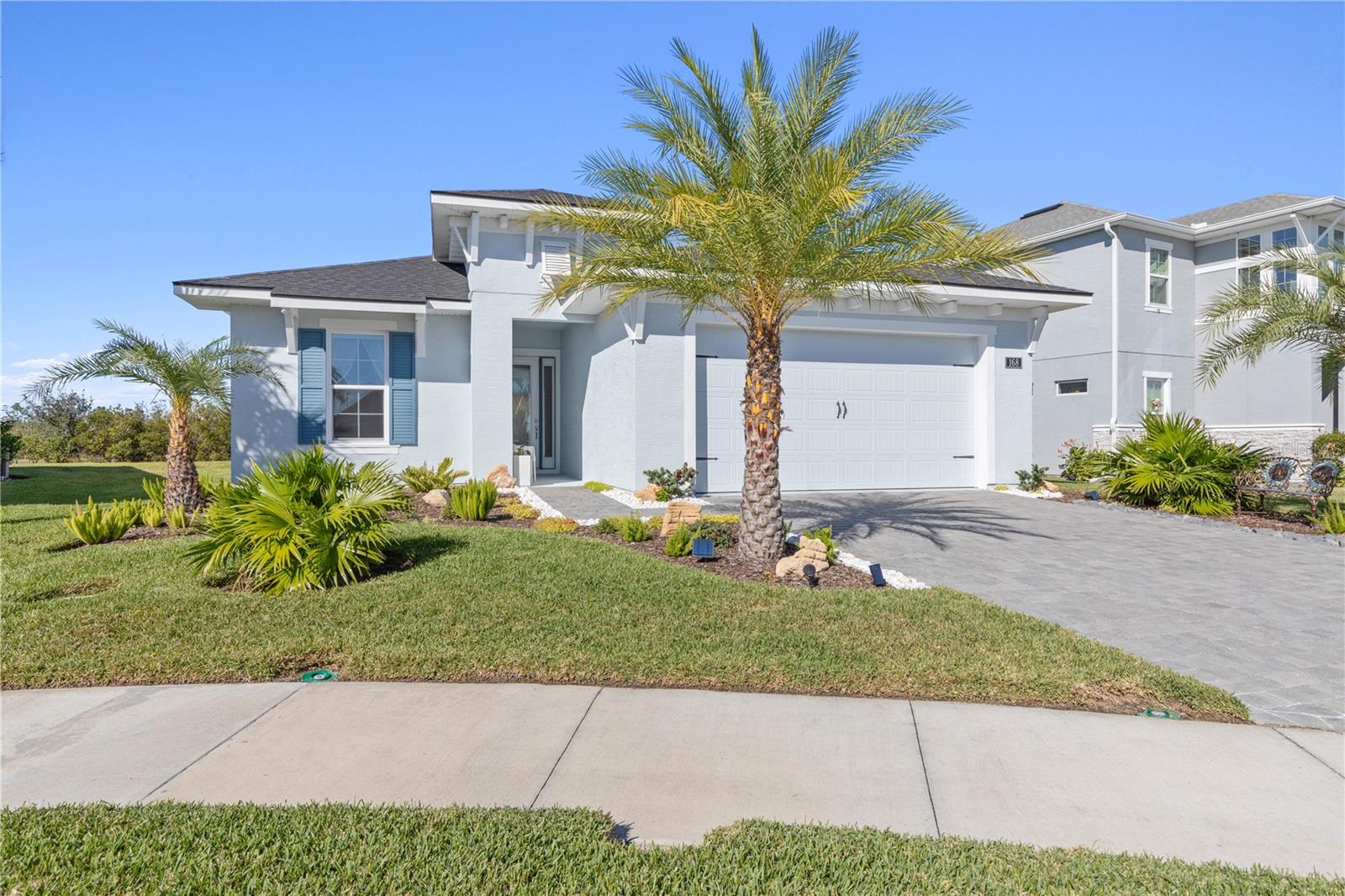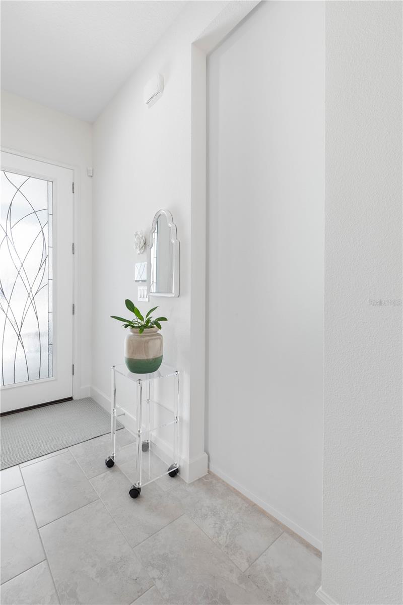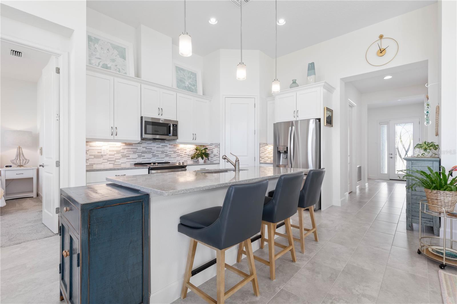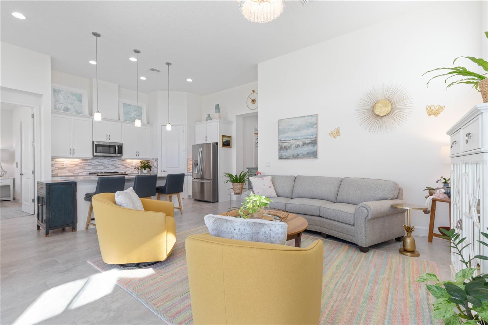 Custom ICI Avery II Home in the Mosaic Community with 12ft Ceiling Located in the desirable Mosaic neighborhood, this 2022 built ICI Avery II home offers a spacious layout with extensive custom upgrades. Positioned on a quiet cul-de-sac, the property features a larger yard and added privacy. Upon entering the open foyer, you’ll find a versatile study/den to the right, complete with large double doors. To the left of the foyer, a separate corridor leads to the second and third bedrooms and a full guest bathroom. For added privacy, a Hunter Douglas motorized roller shade can close off this guest area, making it ideal for hosting visitors. The open floor plan features soaring 12-foot ceilings in the kitchen, living room, dining room, and lanai. The kitchen is equipped with upgraded Ingalis purestyle white cabinets with crown molding and quartz countertops with eased edges and an LG Smart wi-fi french door refrigerator with a dual ice maker. A large island provides ample seating and workspace, while Cambridge Gray tile flooring extends through the main living areas. The living room features a three-panel sliding glass door leading to the lanai, complete with a Hunter Douglas pull-down shade that spans all three panels. Floor outlets with brass covers enhance the room’s functionality, and the dining area is surrounded by windows that let in abundant natural light. The primary suite, located off the kitchen, features large windows overlooking the backyard. The en-suite bathroom includes dual vanities with Ingalis purestyle white cabinets, quartz countertops, a walk-in shower with three safety grab bars, and a separate toilet closet with an added electrical outlet, and a Toto Drake Tornado Flush toilet. The bathroom connects to a spacious walk-in closet, which offers convenient direct access to the laundry room. The covered lanai provides additional outdoor living space. The front and back yard are enhanced by custom landscaping featuring Chinese fan palms, Sylvester palms, Japanese magnolias, 20 Foxtail ferns, butterfly bushes, and more, all accented with Coquina stones. Additional features include Hunter Douglas blinds throughout the home, with top-down/bottom-up blinds on standard windows and a sheer shade for the living room’s transom window. The bathrooms are upgraded with safety grab bars, and the garage features deluxe epoxy flooring. The home’s HVAC system includes a surge protector, dual UV Fresh Aire system, and a hot water heater expansion tank added in 2024. For peace of mind, Massey termite protection is in place and transferable, with bait traps around the home and attic treatments already completed. The front door was upgraded to a JELD-WEN fiberglass front door, as well as having a retractible screen door system perfect for those beautiful Florida days. This thoughtfully designed home combines comfort, style, and practicality, making it a standout property in the Mosaic community. Don’t miss this wonderful home! Schedule a showing today.