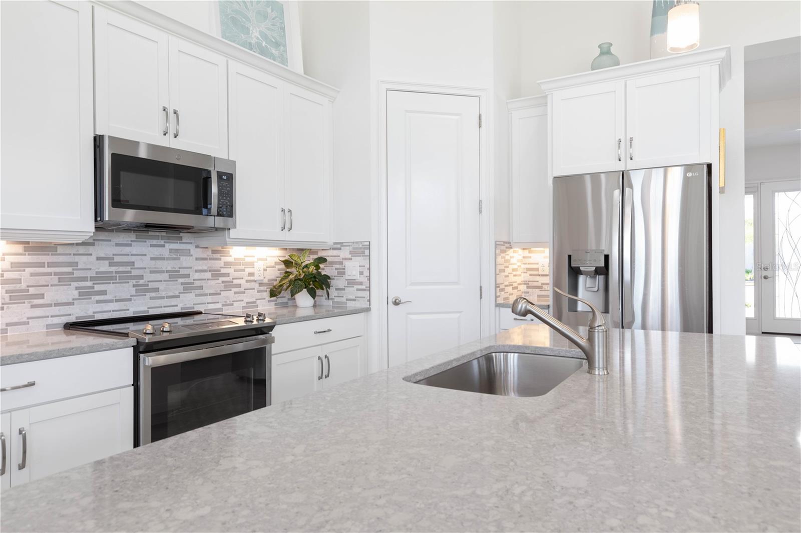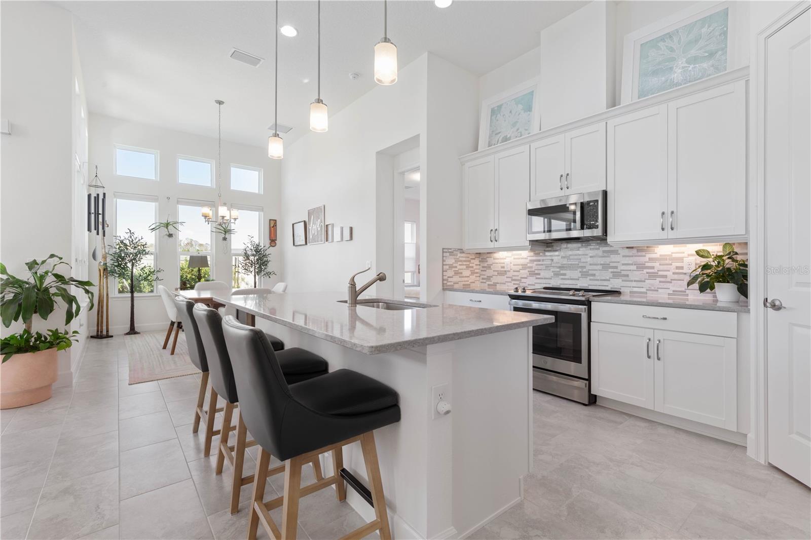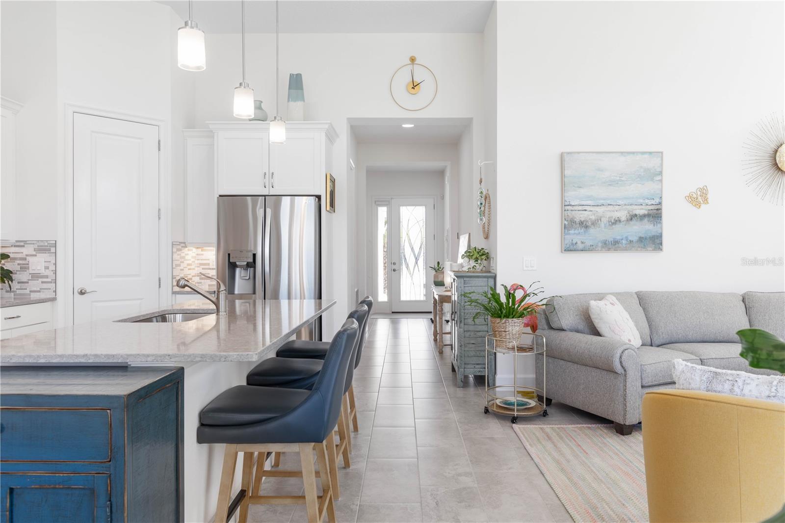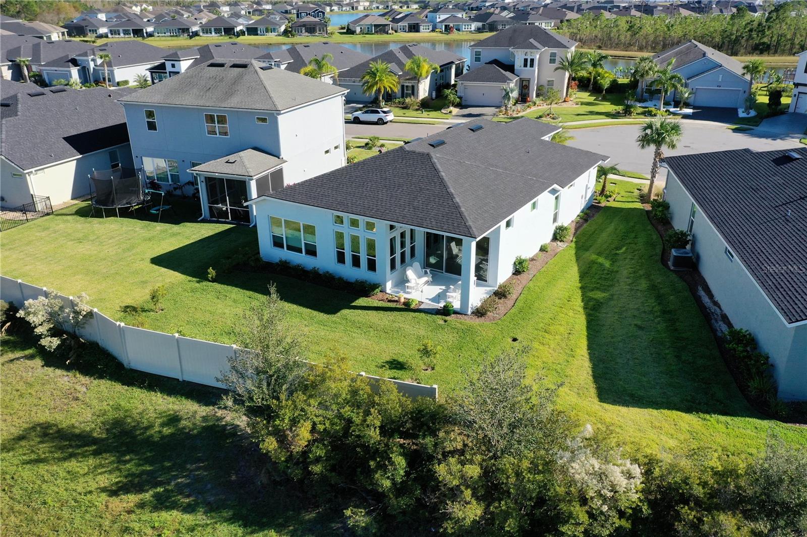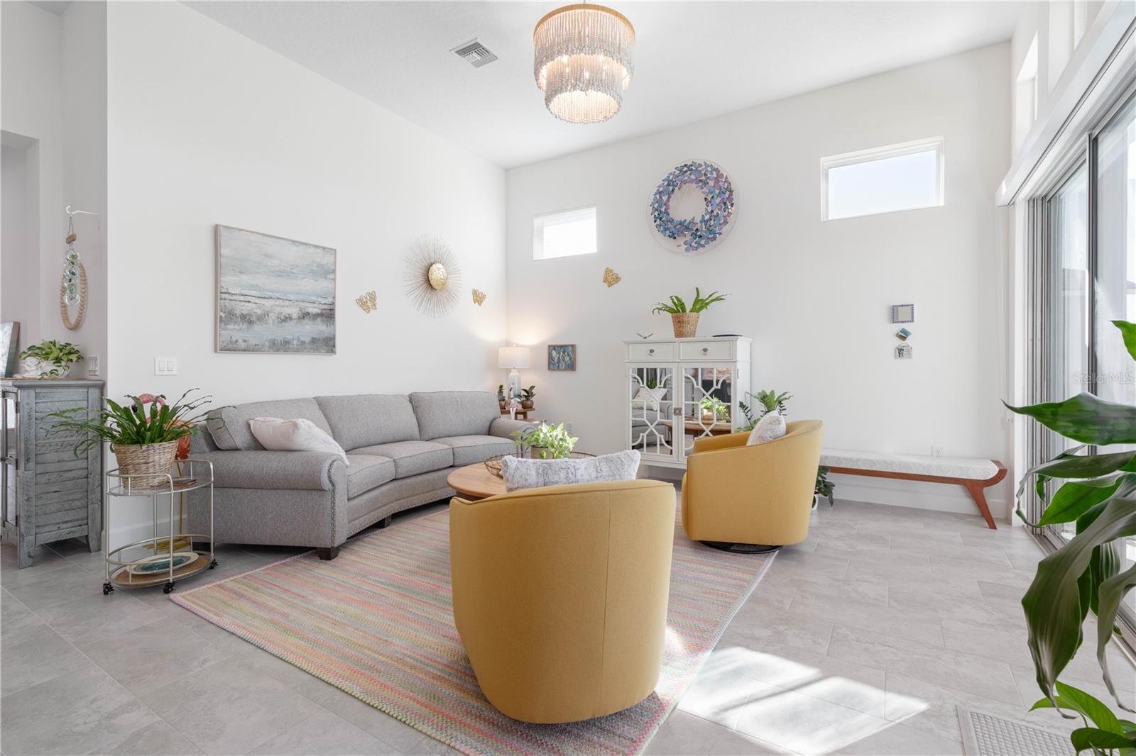 Custom ICI Avery II Home in the Mosaic Community with 12ft Ceiling Located in the desirable Mosaic neighborhood, this 2022 built ICI Avery II home offers a spacious layout with extensive custom upgrades. Positioned on a quiet cul-de-sac, the property features a larger yard and added privacy. Upon entering the open foyer, you’ll find a versatile study/den to the right, complete with large double doors. To the left of the foyer, a separate corridor leads to the second and third bedrooms and a full guest bathroom. For added privacy, a Hunter Douglas motorized roller shade can close off this guest area, making it ideal for hosting visitors. The open floor plan features soaring 12-foot ceilings in the kitchen, living room, dining room, and lanai. The kitchen is equipped with upgraded Ingalis purestyle white cabinets with crown molding and quartz countertops with eased edges and an LG Smart wi-fi french door refrigerator with a dual ice maker. A large island provides ample seating and workspace, while Cambridge Gray tile flooring extends through the main living areas. The living room features a three-panel sliding glass door leading to the lanai, complete with a Hunter Douglas pull-down shade that spans all three panels. Floor outlets with brass covers enhance the room’s functionality, and the dining area is surrounded by windows that let in abundant natural light. The primary suite, located off the kitchen, features large windows overlooking the backyard. The en-suite bathroom includes dual vanities with Ingalis purestyle white cabinets, quartz countertops, a walk-in shower with three safety grab bars, and a separate toilet closet with an added electrical outlet, and a Toto Drake Tornado Flush toilet. The bathroom connects to a spacious walk-in closet, which offers convenient direct access to the laundry room. The covered lanai provides additional outdoor living space. The front and back yard are enhanced by custom landscaping featuring Chinese fan palms, Sylvester palms, Japanese magnolias, 20 Foxtail ferns, butterfly bushes, and more, all accented with Coquina stones. Additional features include Hunter Douglas blinds throughout the home, with top-down/bottom-up blinds on standard windows and a sheer shade for the living room’s transom window. The bathrooms are upgraded with safety grab bars, and the garage features deluxe epoxy flooring. The home’s HVAC system includes a surge protector, dual UV Fresh Aire system, and a hot water heater expansion tank added in 2024. For peace of mind, Massey termite protection is in place and transferable, with bait traps around the home and attic treatments already completed. The front door was upgraded to a JELD-WEN fiberglass front door, as well as having a retractible screen door system perfect for those beautiful Florida days. This thoughtfully designed home combines comfort, style, and practicality, making it a standout property in the Mosaic community. Don’t miss this wonderful home! Schedule a showing today.