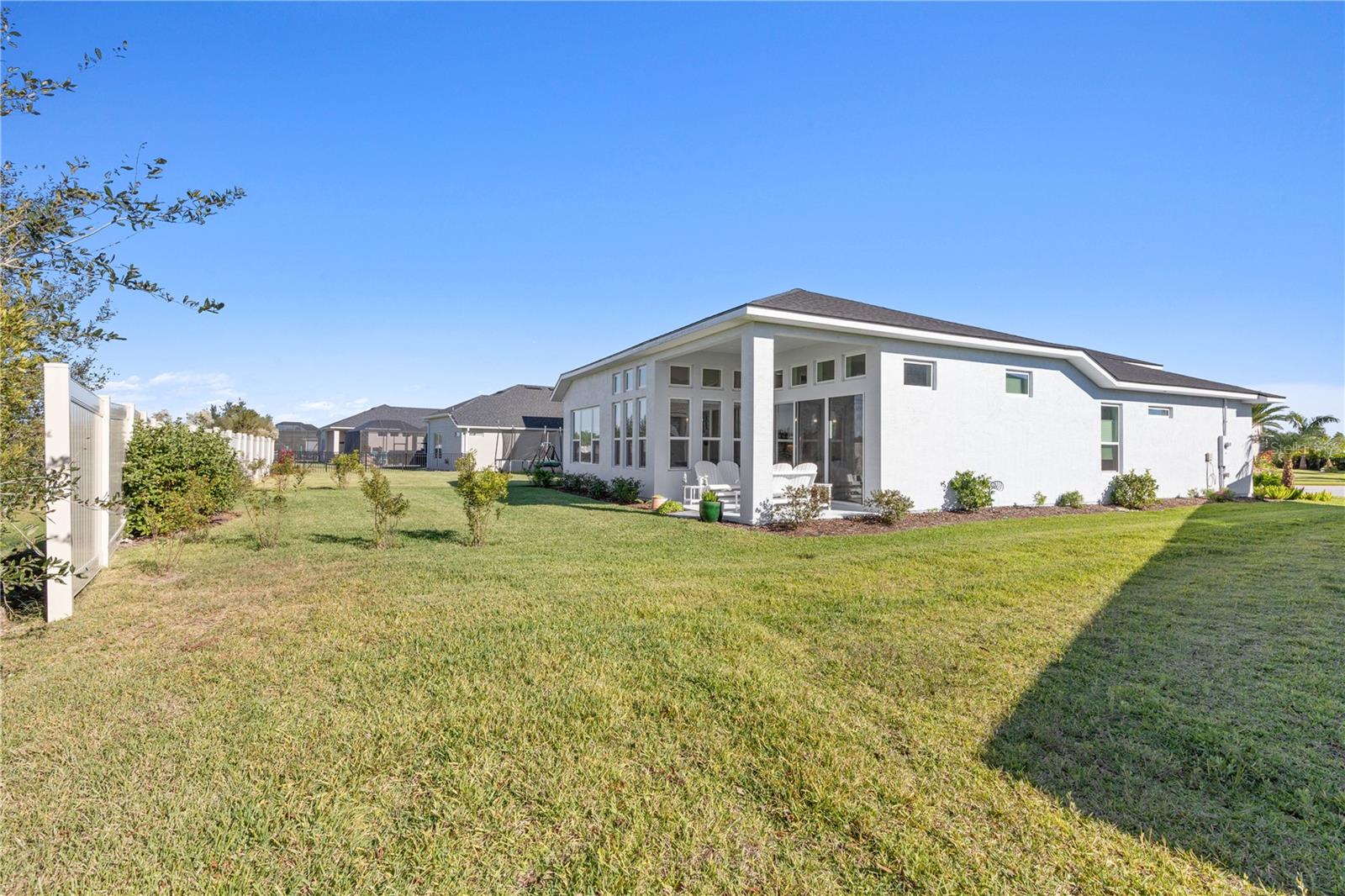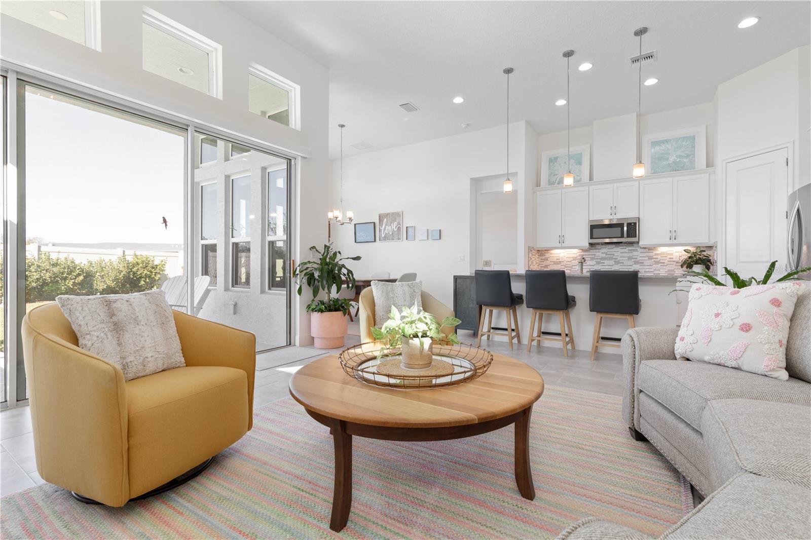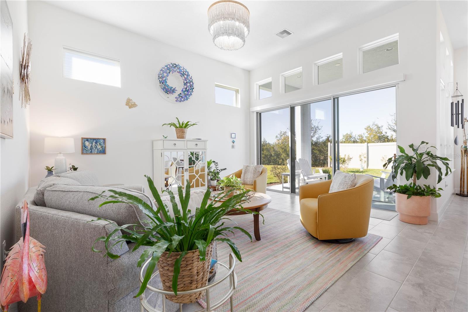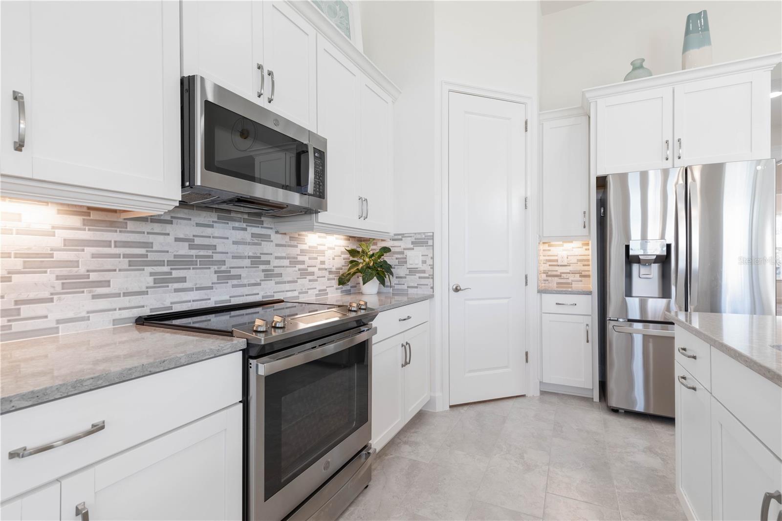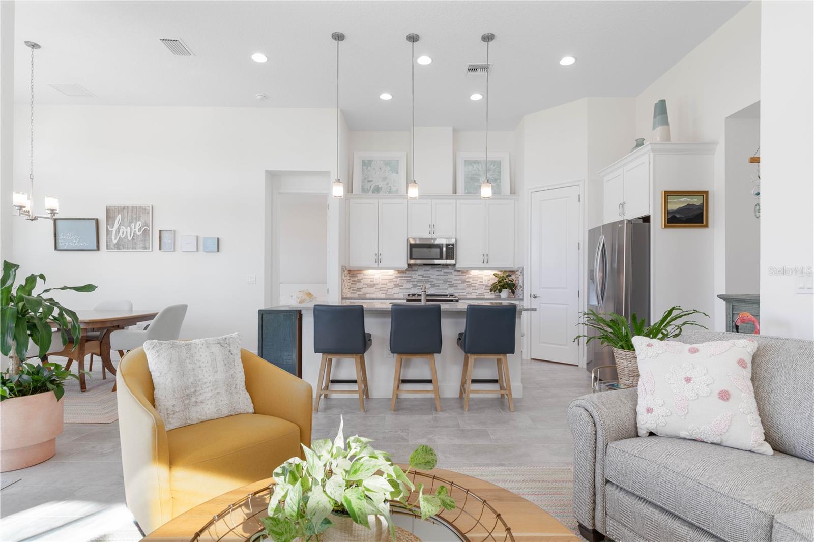 Custom ICI Avery II Home in the Mosaic Community with 12ft Ceiling Located in the desirable Mosaic neighborhood, this 2022 built ICI Avery II home offers a spacious layout with extensive custom upgrades. Positioned on a quiet cul-de-sac, the property features a larger yard and added privacy. Upon entering the open foyer, you’ll find a versatile study/den to the right, complete with large double doors. To the left of the foyer, a separate corridor leads to the second and third bedrooms and a full guest bathroom. For added privacy, a Hunter Douglas motorized roller shade can close off this guest area, making it ideal for hosting visitors. The open floor plan features soaring 12-foot ceilings in the kitchen, living room, dining room, and lanai. The kitchen is equipped with upgraded Ingalis purestyle white cabinets with crown molding and quartz countertops with eased edges and an LG Smart wi-fi french door refrigerator with a dual ice maker. A large island provides ample seating and workspace, while Cambridge Gray tile flooring extends through the main living areas. The living room features a three-panel sliding glass door leading to the lanai, complete with a Hunter Douglas pull-down shade that spans all three panels. Floor outlets with brass covers enhance the room’s functionality, and the dining area is surrounded by windows that let in abundant natural light. The primary suite, located off the kitchen, features large windows overlooking the backyard. The en-suite bathroom includes dual vanities with Ingalis purestyle white cabinets, quartz countertops, a walk-in shower with three safety grab bars, and a separate toilet closet with an added electrical outlet, and a Toto Drake Tornado Flush toilet. The bathroom connects to a spacious walk-in closet, which offers convenient direct access to the laundry room. The covered lanai provides additional outdoor living space. The front and back yard are enhanced by custom landscaping featuring Chinese fan palms, Sylvester palms, Japanese magnolias, 20 Foxtail ferns, butterfly bushes, and more, all accented with Coquina stones. Additional features include Hunter Douglas blinds throughout the home, with top-down/bottom-up blinds on standard windows and a sheer shade for the living room’s transom window. The bathrooms are upgraded with safety grab bars, and the garage features deluxe epoxy flooring. The home’s HVAC system includes a surge protector, dual UV Fresh Aire system, and a hot water heater expansion tank added in 2024. For peace of mind, Massey termite protection is in place and transferable, with bait traps around the home and attic treatments already completed. The front door was upgraded to a JELD-WEN fiberglass front door, as well as having a retractible screen door system perfect for those beautiful Florida days. This thoughtfully designed home combines comfort, style, and practicality, making it a standout property in the Mosaic community. Don’t miss this wonderful home! Schedule a showing today.