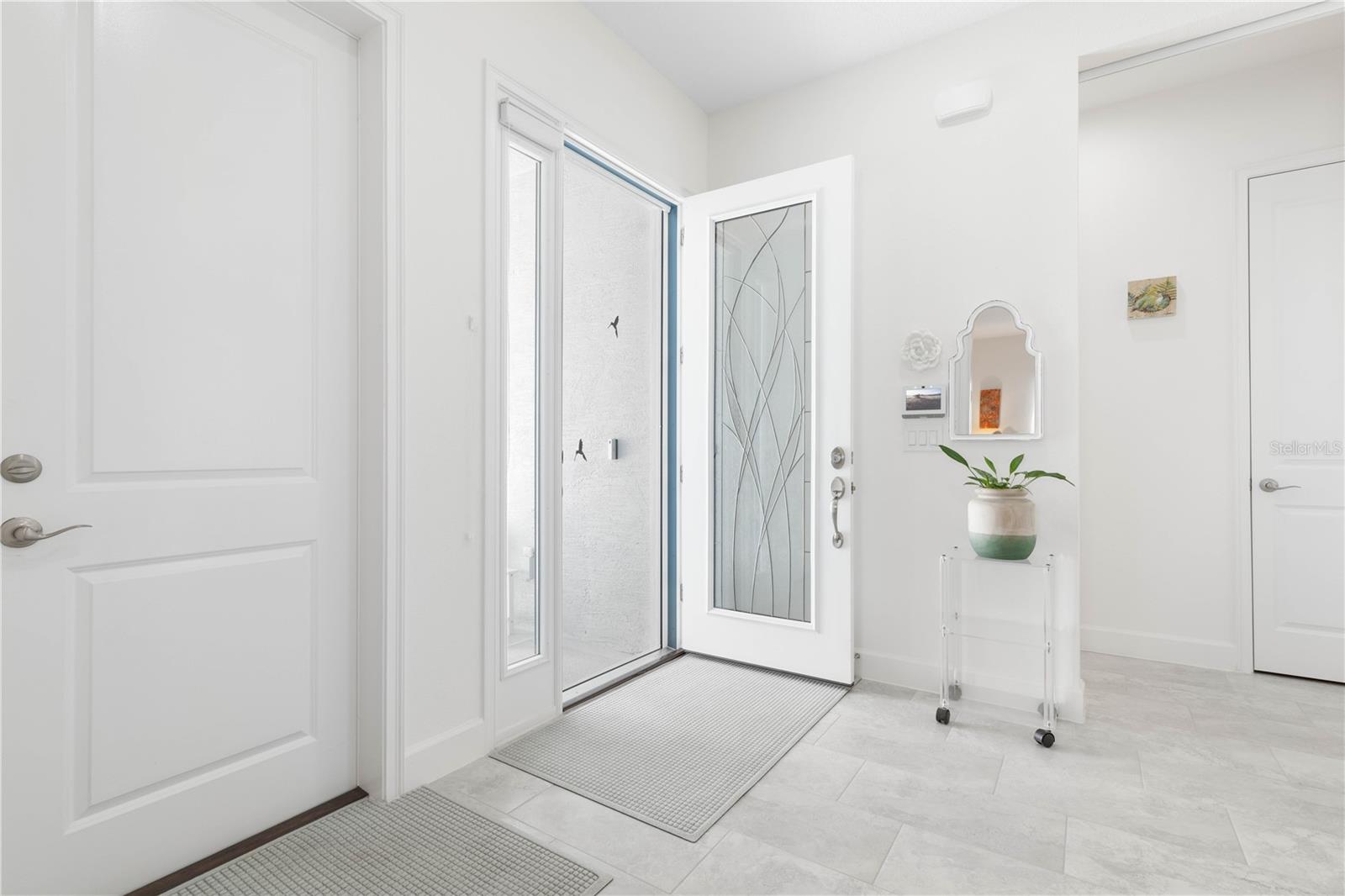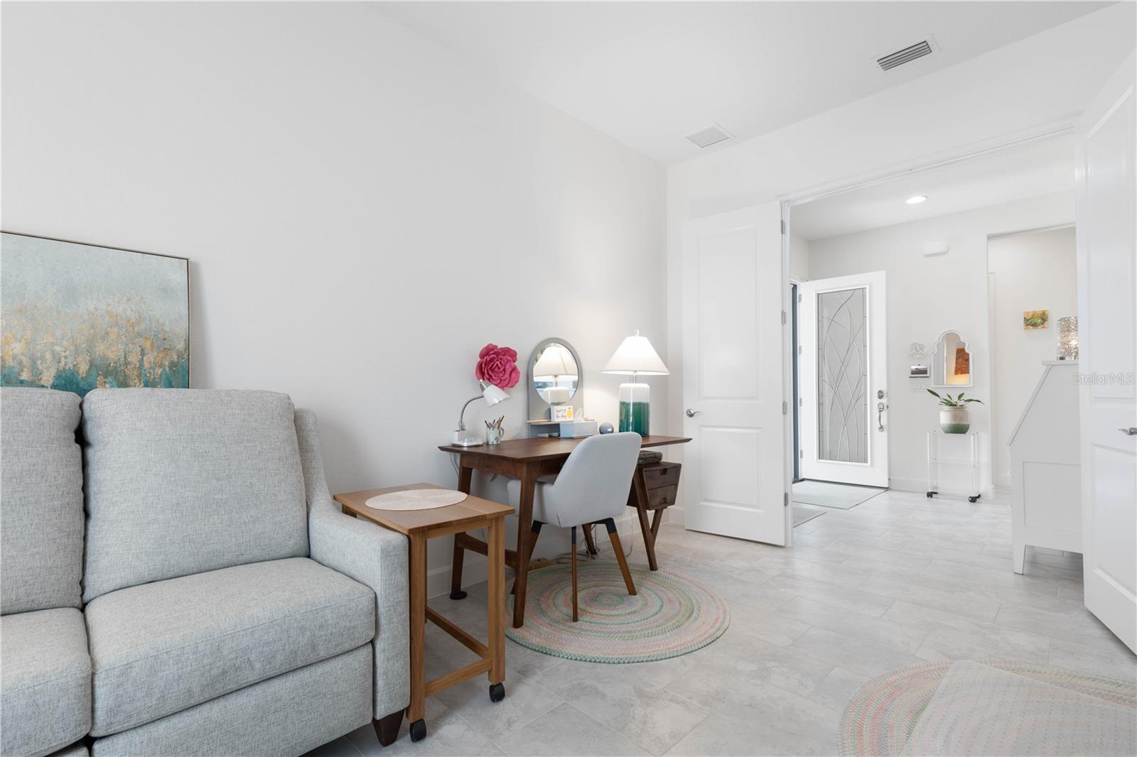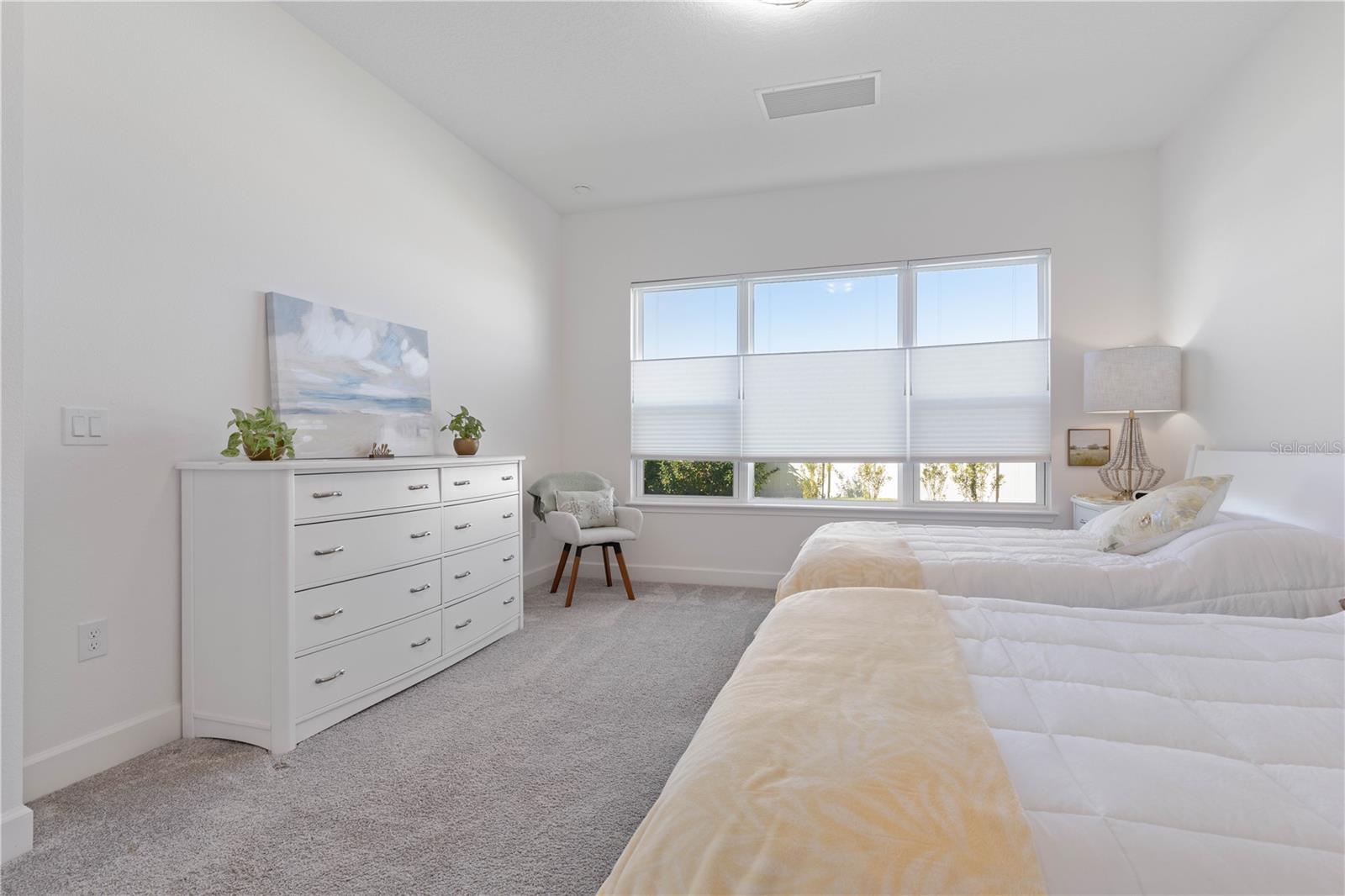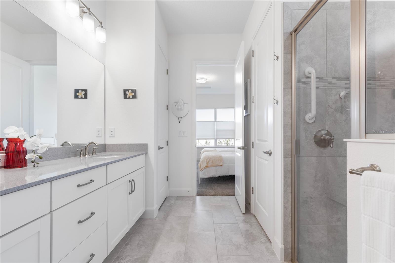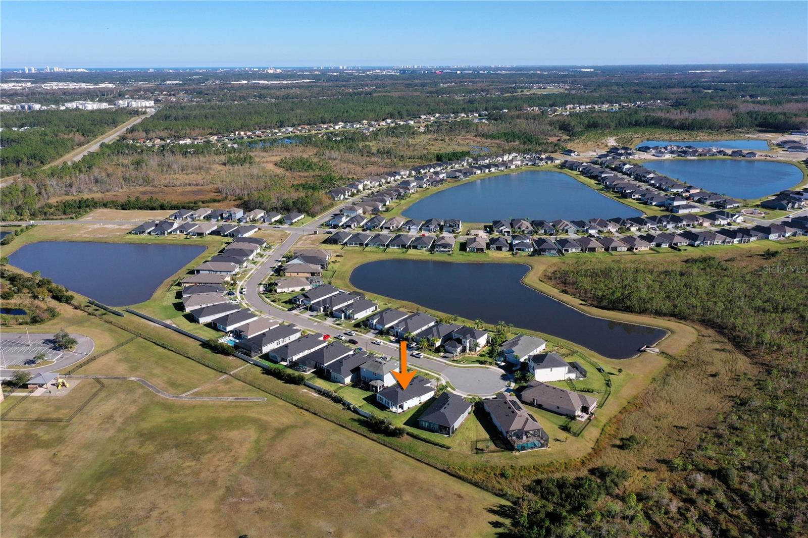 Custom ICI Avery II Home in the Mosaic Community with 12ft Ceiling Located in the desirable Mosaic neighborhood, this 2022 built ICI Avery II home offers a spacious layout with extensive custom upgrades. Positioned on a quiet cul-de-sac, the property features a larger yard and added privacy. Upon entering the open foyer, you’ll find a versatile study/den to the right, complete with large double doors. To the left of the foyer, a separate corridor leads to the second and third bedrooms and a full guest bathroom. For added privacy, a Hunter Douglas motorized roller shade can close off this guest area, making it ideal for hosting visitors. The open floor plan features soaring 12-foot ceilings in the kitchen, living room, dining room, and lanai. The kitchen is equipped with upgraded Ingalis purestyle white cabinets with crown molding and quartz countertops with eased edges and an LG Smart wi-fi french door refrigerator with a dual ice maker. A large island provides ample seating and workspace, while Cambridge Gray tile flooring extends through the main living areas. The living room features a three-panel sliding glass door leading to the lanai, complete with a Hunter Douglas pull-down shade that spans all three panels. Floor outlets with brass covers enhance the room’s functionality, and the dining area is surrounded by windows that let in abundant natural light. The primary suite, located off the kitchen, features large windows overlooking the backyard. The en-suite bathroom includes dual vanities with Ingalis purestyle white cabinets, quartz countertops, a walk-in shower with three safety grab bars, and a separate toilet closet with an added electrical outlet, and a Toto Drake Tornado Flush toilet. The bathroom connects to a spacious walk-in closet, which offers convenient direct access to the laundry room. The covered lanai provides additional outdoor living space. The front and back yard are enhanced by custom landscaping featuring Chinese fan palms, Sylvester palms, Japanese magnolias, 20 Foxtail ferns, butterfly bushes, and more, all accented with Coquina stones. Additional features include Hunter Douglas blinds throughout the home, with top-down/bottom-up blinds on standard windows and a sheer shade for the living room’s transom window. The bathrooms are upgraded with safety grab bars, and the garage features deluxe epoxy flooring. The home’s HVAC system includes a surge protector, dual UV Fresh Aire system, and a hot water heater expansion tank added in 2024. For peace of mind, Massey termite protection is in place and transferable, with bait traps around the home and attic treatments already completed. The front door was upgraded to a JELD-WEN fiberglass front door, as well as having a retractible screen door system perfect for those beautiful Florida days. This thoughtfully designed home combines comfort, style, and practicality, making it a standout property in the Mosaic community. Don’t miss this wonderful home! Schedule a showing today.