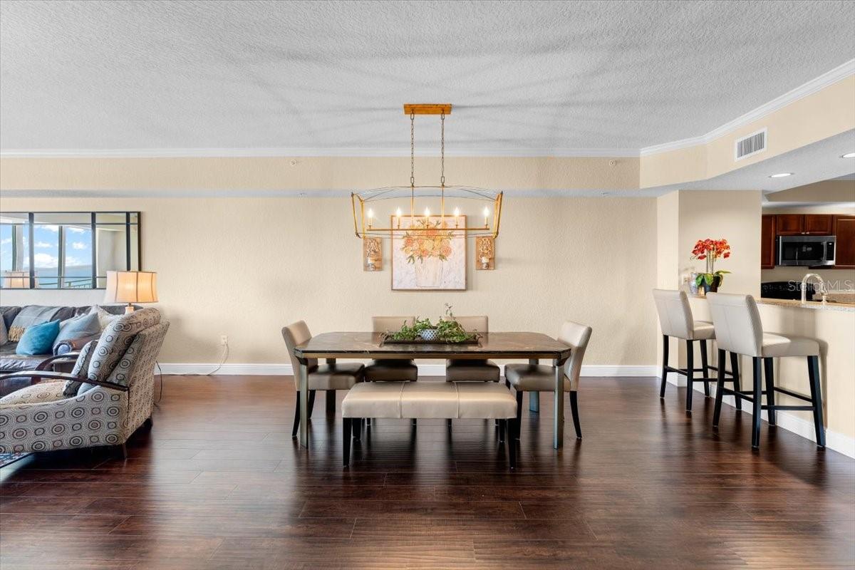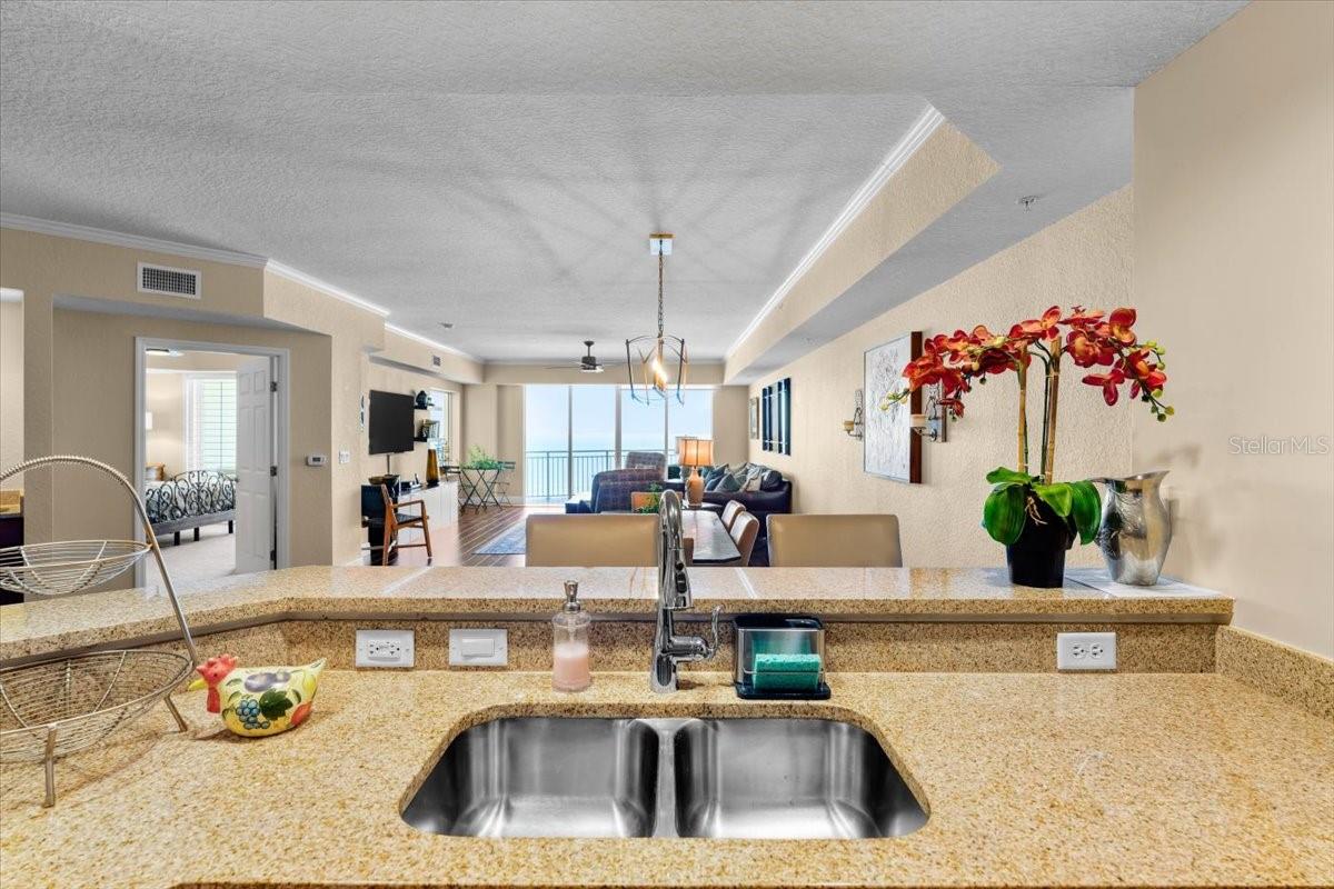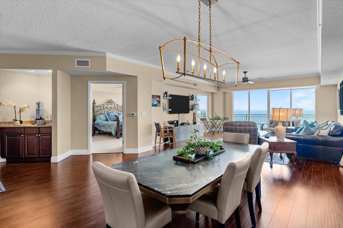 The Island Crowne is an iconic and beautifully unique condominium, providing impeccable views and beachfront ambiance on the shores of the Atlantic Ocean in beautiful Daytona Beach. From your front door overlooking the Halifax River and its amazing sunsets, step into this direct oceanfront unit, featuring stunning views from the 16th floor and offering excellent finishes and appointments for the best in luxury living. From your condo, you can watch incredible sunrises, rocket launches, fireworks, and many more displays of nature from above the streets of Daytona Beach and the beach below. From the private beach walkway, you can enjoy all the beach has to offer and the relaxation that comes with it. The condo's impressive entryway and 18' expansive living room contain a sliding glass door that allows outside beauty to come in. This condo features an expansive oceanfront balcony, large enough to accommodate chaise lounges, a sitting area, and a dining table, if desired, for all your entertaining needs. This home offers a generous 2,508 square feet of coastal living and quality design, including coffered ceilings, plank tile flooring, crown molding, a wet bar for entertaining, and large, expansive rooms offering comfort through the open floor plan. The unit features a 2022 AC and hot water heater, so the new owner will not have to address those items anytime soon. The large kitchen with granite counters overlooks the living and dining areas for ease of entertainment and family leisure time. The split bedroom floor plan offers maximum privacy, and the indoor laundry area provides incredible convenience. The primary bedroom has plenty of space for a King bed with dramatic ocean views, 2 large walk-in closets, and an ensuite bath with a jetted tub, walk-in shower, and double vanities. The two additional bedrooms are ensuite with private, adjoining bathrooms for comfort and convenience and also feature their own large closets. Both bedrooms have a beautiful view of the Halifax River. The home has also been thoughtfully outfitted with plantation shutters, new ceiling fans, and light fixtures. The owners at the Island Crowne experience maintenance-free living with beautiful, well-maintained amenities expected in a well-run condominium. Conveniences include indoor and outdoor heated swimming pools and spas, a recently renovated pool deck area, and an incredibly well-built and fortified seawall. Owners may use the oceanfront Crowne Room, which offers a full kitchen, for family gatherings, social events, or private functions, and they can also enjoy the use of a full gym and saunas. The Island Crowne also offers an oceanfront grill area and private beach access. This condo offers many storage options, including a pantry, several linen closets, hallway storage rooms, and a dedicated storage locker for storing your beach items or other household items. This condo is being sold fully furnished; furnishings and decor from such discriminating purveyors as Pottery Barn, Crate and Barrel, and Restoration Hardware will be conveyed upon sale.