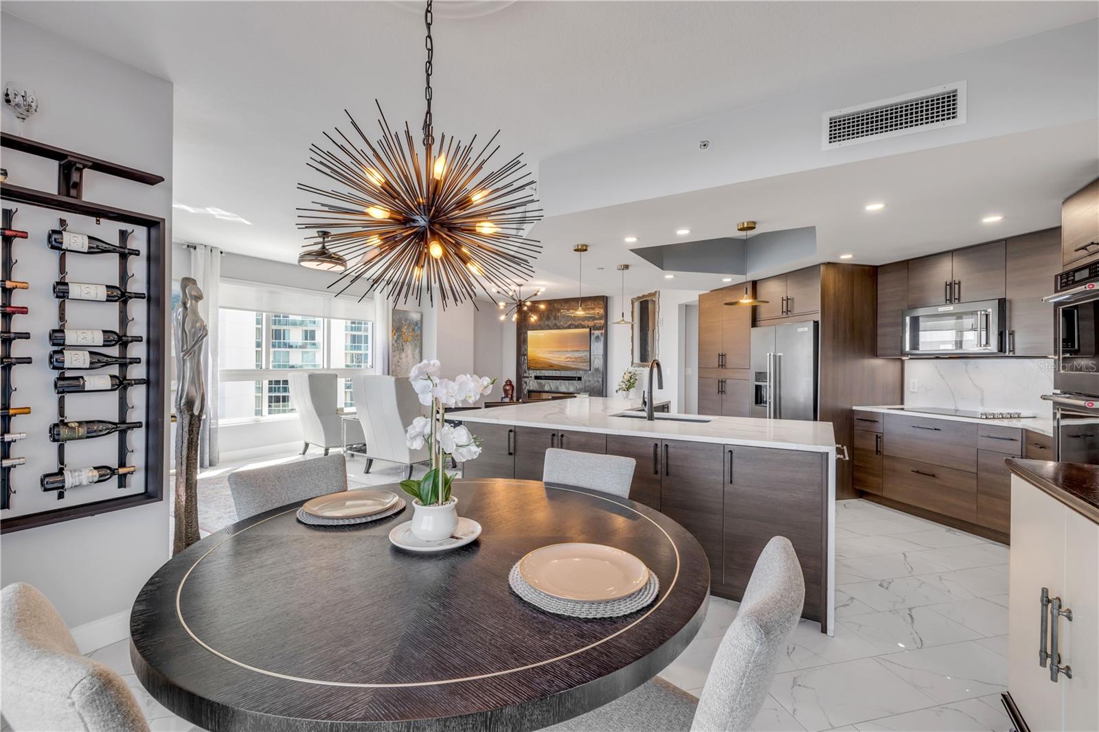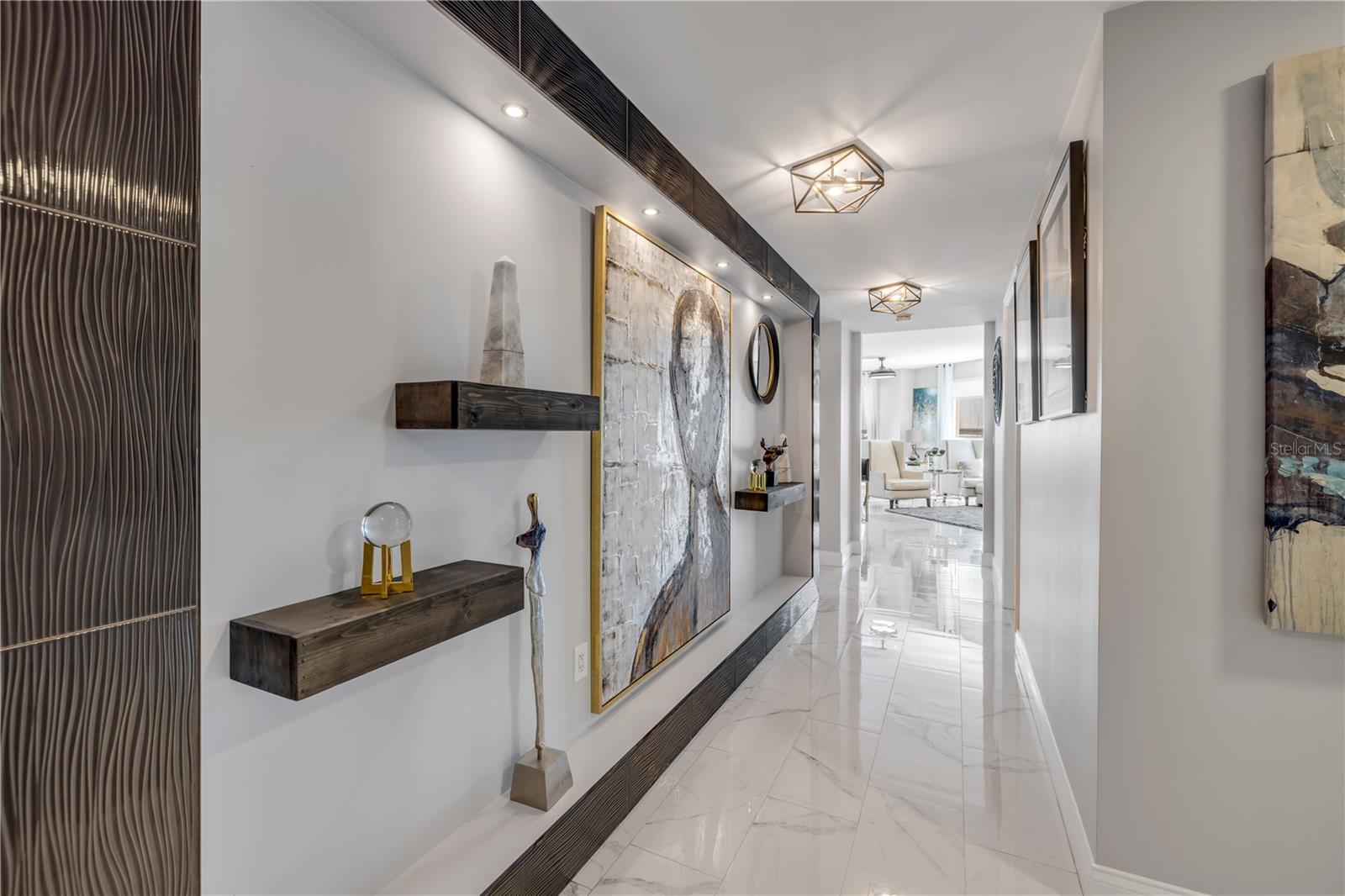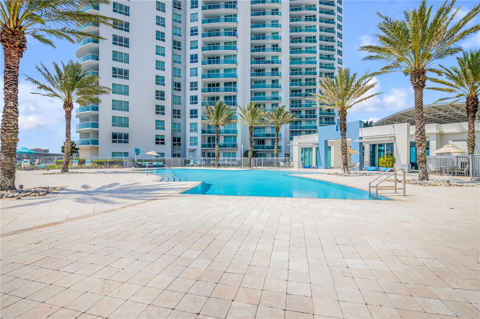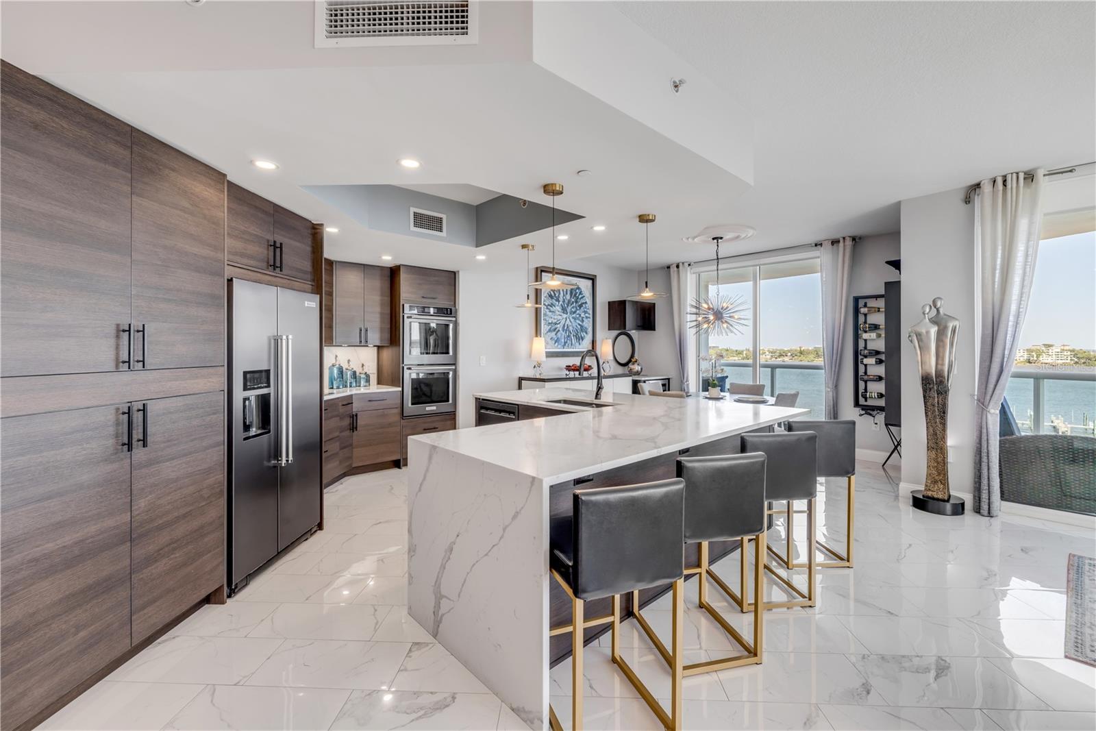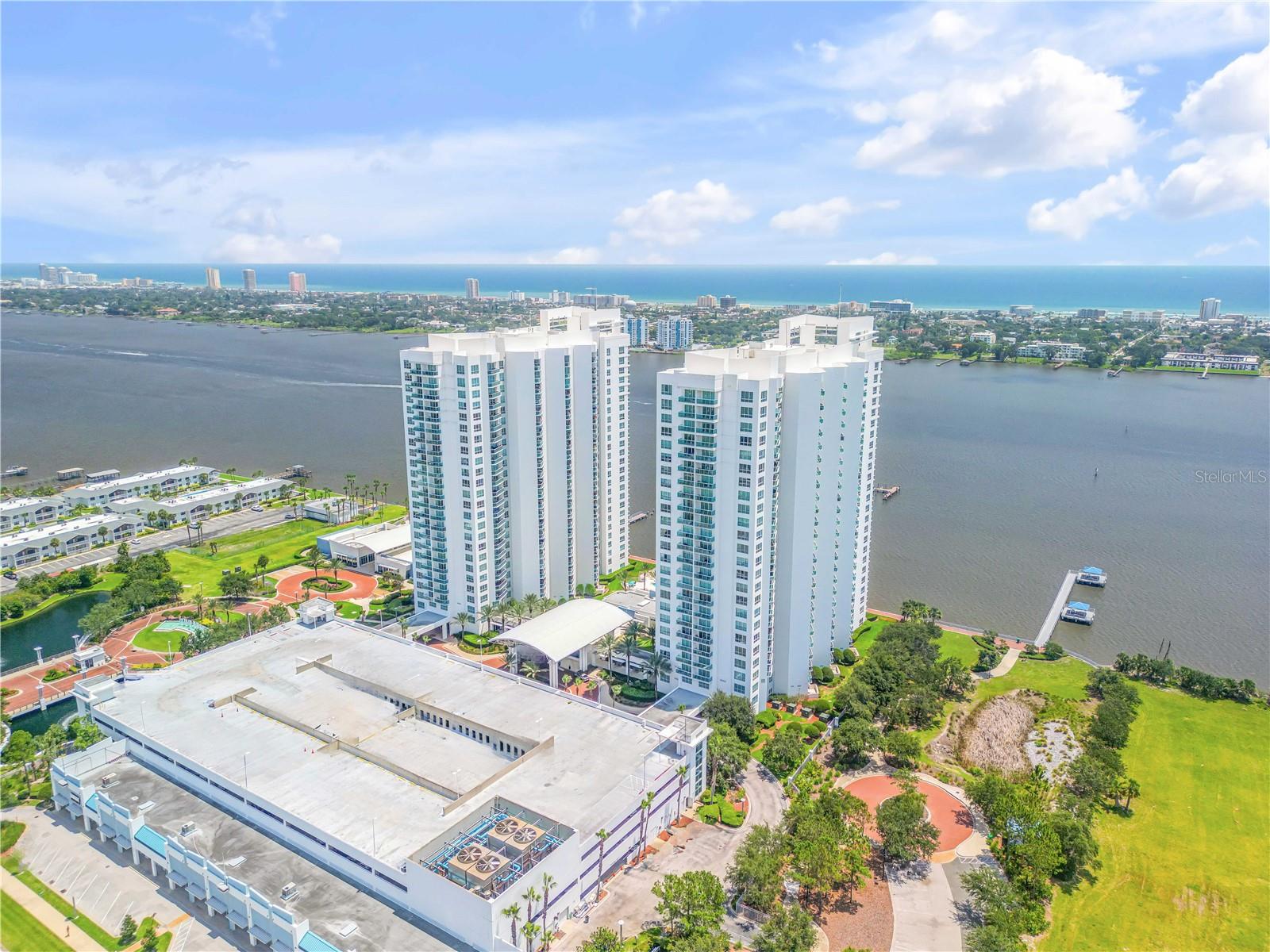 On the tranquil Halifax Intracoastal Waterway in the heart of Daytona Beach, this exceptional 25-story high-rise offers a rare combination of breathtaking riverfront views, first-class amenities and a vibrant community atmosphere. With sweeping vistas of the Halifax River, Daytona Beach and the Atlantic Ocean, this luxury condominium offers an unparalleled living experience. This luxury direct riverfront end unit is designed to impress, combining sleek modern design with sophisticated finishes. The gourmet kitchen is equipped with premium KitchenAid appliances, including double ovens, a wine beverage cooler and a fingerprint-resistant refrigerator. The sleek, dark cabinetry and large center island with additional storage elevate the culinary experience, while panoramic views of the Halifax River and ocean create a serene setting. From the dining room and living areas, enjoy a backdrop of elegance with these stunning views. The spacious living room is an ideal space for relaxation and entertaining, featuring an electric fireplace and a built-in TV combo for modern convenience. Artfully designed hallways feature built-in shelves and niches with integrated lighting, adding a touch of style to the entire space. Throughout the unit, you'll find modern lighting in dark tones, adding ambiance and warmth to every room. With 9-foot ceilings throughout, the unit feels expansive and airy, enhancing the open-concept design. Sliding doors lead to a private balcony with tinted glass, offering an ideal space for relaxing while enjoying extraordinary, unobstructed views of the Halifax River, Atlantic Ocean and Daytona Beach. This unit is cooled by a state-of-the-art cooling tower system that efficiently circulates cool air throughout the entire building, ensuring a comfortable and refreshing environment year-round. With operable windows, you can enjoy the fresh air while taking in the spectacular waterfront vistas. Custom walk-in closets and built-in shelving adorn all bedrooms, while luxury vinyl plank flooring provides a durable, stylish touch. The spacious primary bath offers double sinks, a luxurious Jacuzzi tub and a stand-up shower with a glass enclosure ideal for unwinding after a long day. The convenient stackable Samsung washer and dryer are tucked in the laundry room, ensuring the utmost in functionality. Smart home access with structured wiring solutions makes living here more convenient than ever for those who work from home. Marina Grande offers a wealth of world-class amenities that cater to every need. The community boasts two luxurious 25-story towers, each offering stunning views of the waterfront and beyond. Residents enjoy exclusive access to the community's two clubhouses, a fitness center, a theater, a game room, two sparkling swimming pools, and a spa. With a gated entrance, 24/7 security, concierge services, and on-site property management, Marina Grande ensures peace of mind and convenience for all residents. Additionally, residents have access to high-speed internet, cable TV, and Wi-Fi in social areas, as well as landscaping, trash, sewer, HVAC, and more, all included in the monthly condominium association fees. From the expansive clubhouses, movie theater, saunas, yoga studio, meeting rooms and fitness center, Marina Grande provides the lifestyle you deserve.