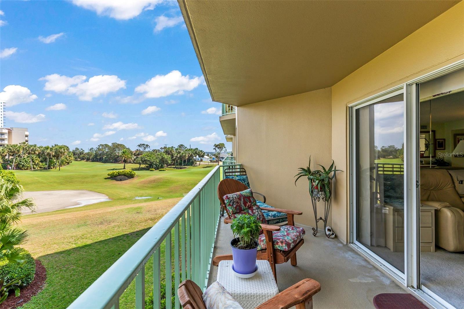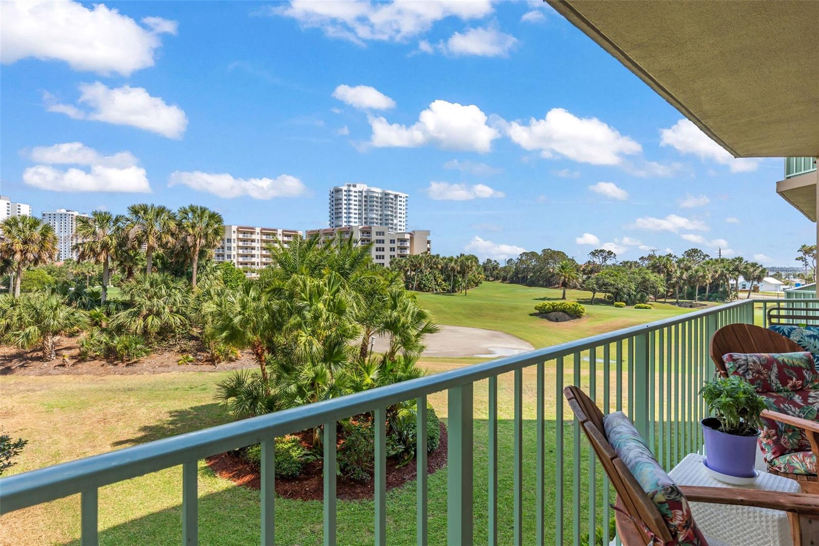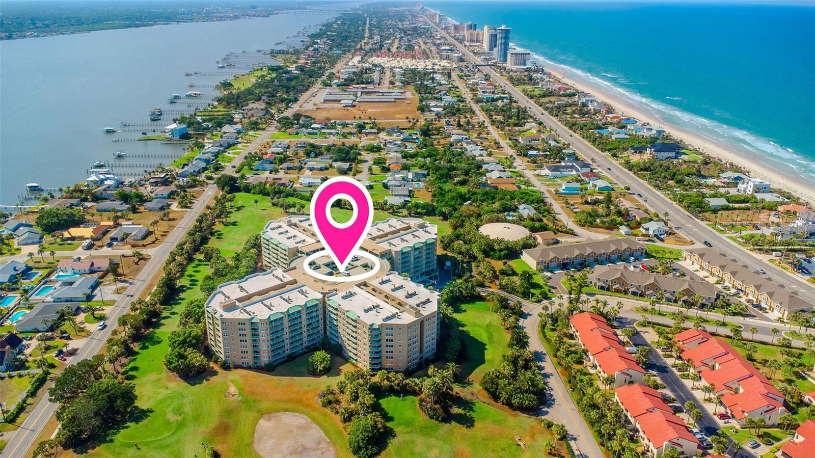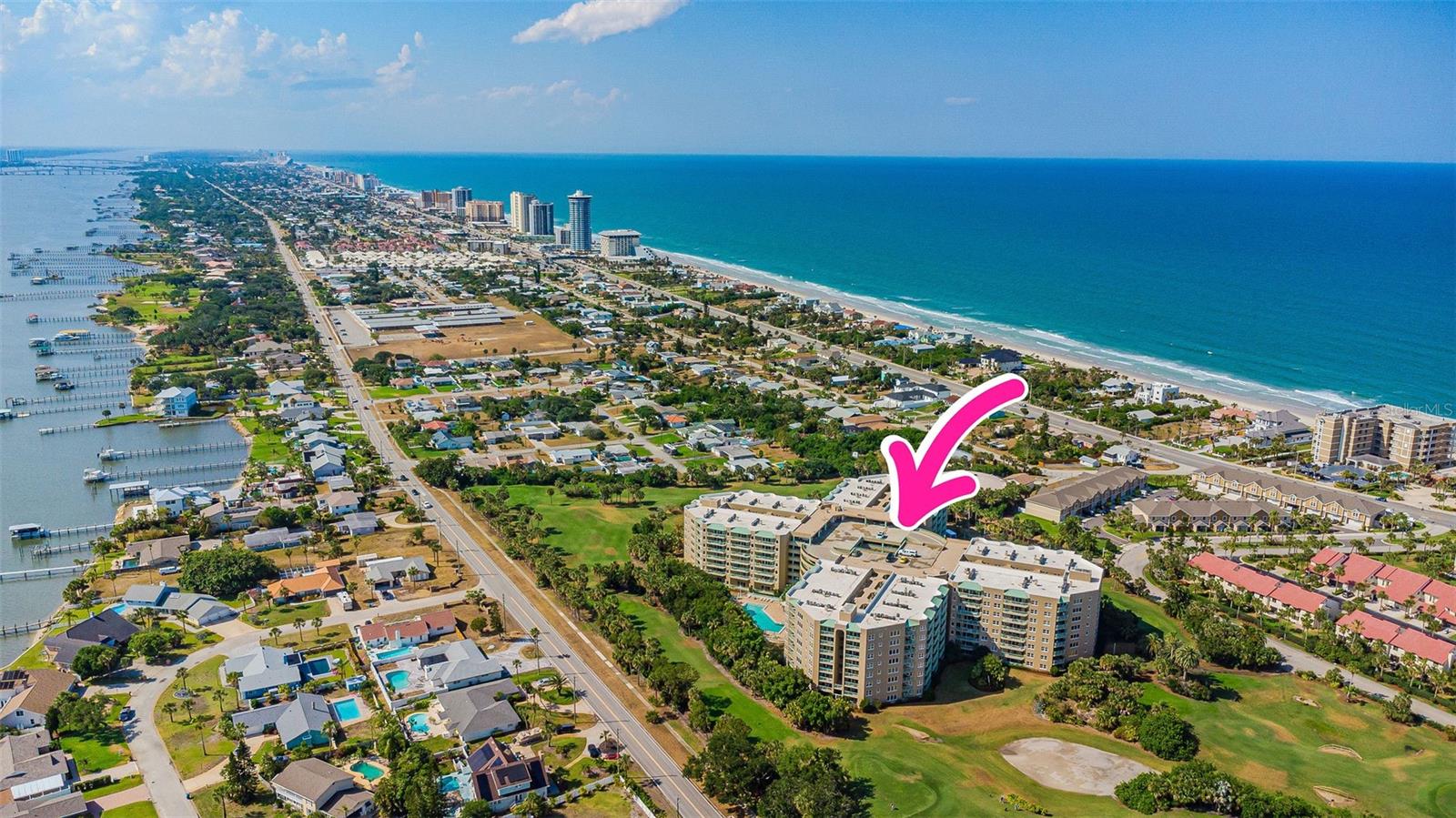 Welcome to your serene getaway in Daytona Beach Shores! This charming 2-bedroom, 2-bath condo offers a perfect blend of comfort and coastal living tucked in the corner of the building. As you step inside, you are greeted by an open-concept living space filled with natural light, thanks to large sliding glass doors that showcase glimpses of the tranquil river views and of the golf course. The spacious living room invites relaxation with its cozy furnishings making it an ideal spot for unwinding after a day at the beach. The adjacent dining area seamlessly connects to the fully equipped kitchen, featuring ample counter space, and a breakfast bar for casual meals. Also, you have a 11 x 09 den or office area great for guest or an additional office area and inside laundry. Retreat to the master bedroom, which boasts an en-suite bath for added privacy and convenience and double sinks, walk in shower and a full size tub! Plenty of room in your walk in closet for all your shoes and all your clothing! The second bedroom is equally inviting, perfect for guests or family, and is conveniently located near the second bath. Step out onto the private balcony to enjoy your morning coffee or watch the sunset over the river, creating a peaceful ambiance that defines this coastal retreat. Additional amenities include access to community features such as the indoor pool and the outdoor pool, hot tub, sauna, fitness center, mail room, library and more! This unit has one assigned parking spot and a guest parking spot right next to it. Also, this unit has 2 storage areas for all your beach accessories. Located just a short distance from the beach, this condo is the perfect place to experience the best of Daytona Beach Shores, with its beautiful coastline, vibrant local culture, and recreational activities. Don't miss your chance to own this slice of paradise! All information deemed accurate but cannot be guaranteed.