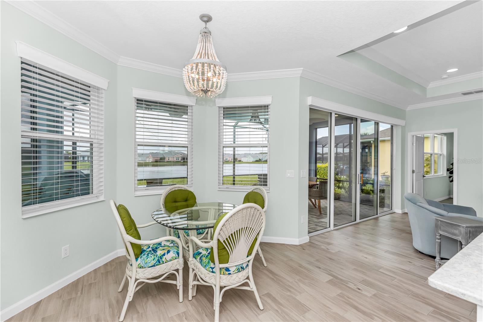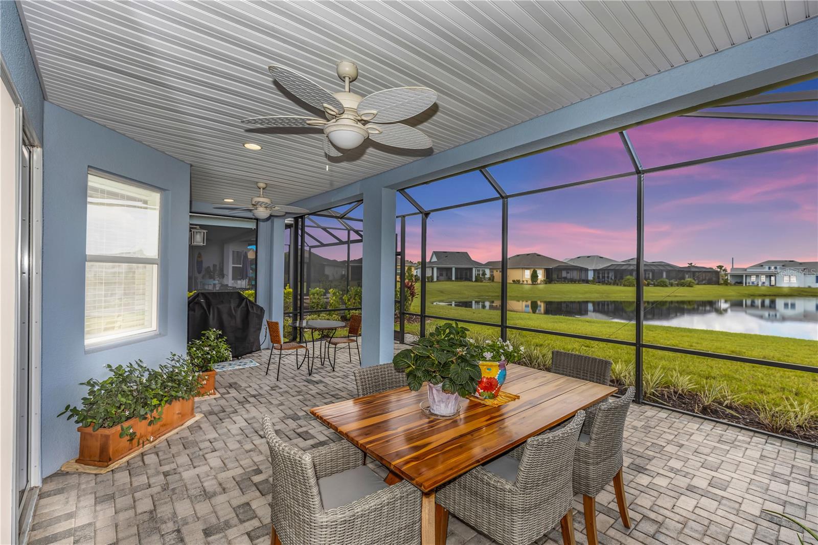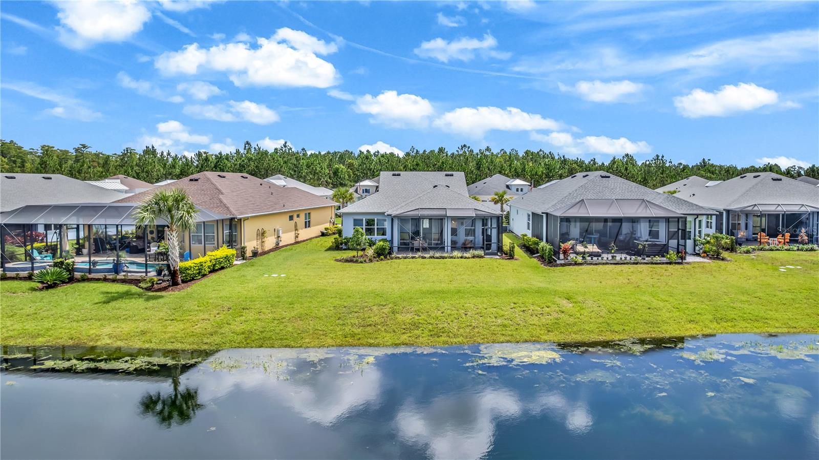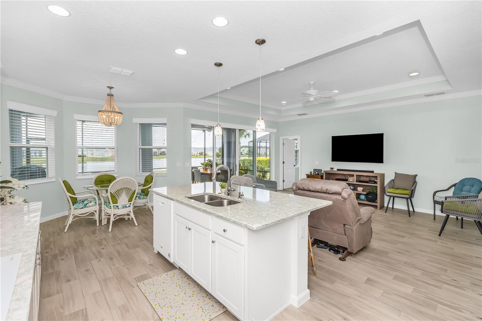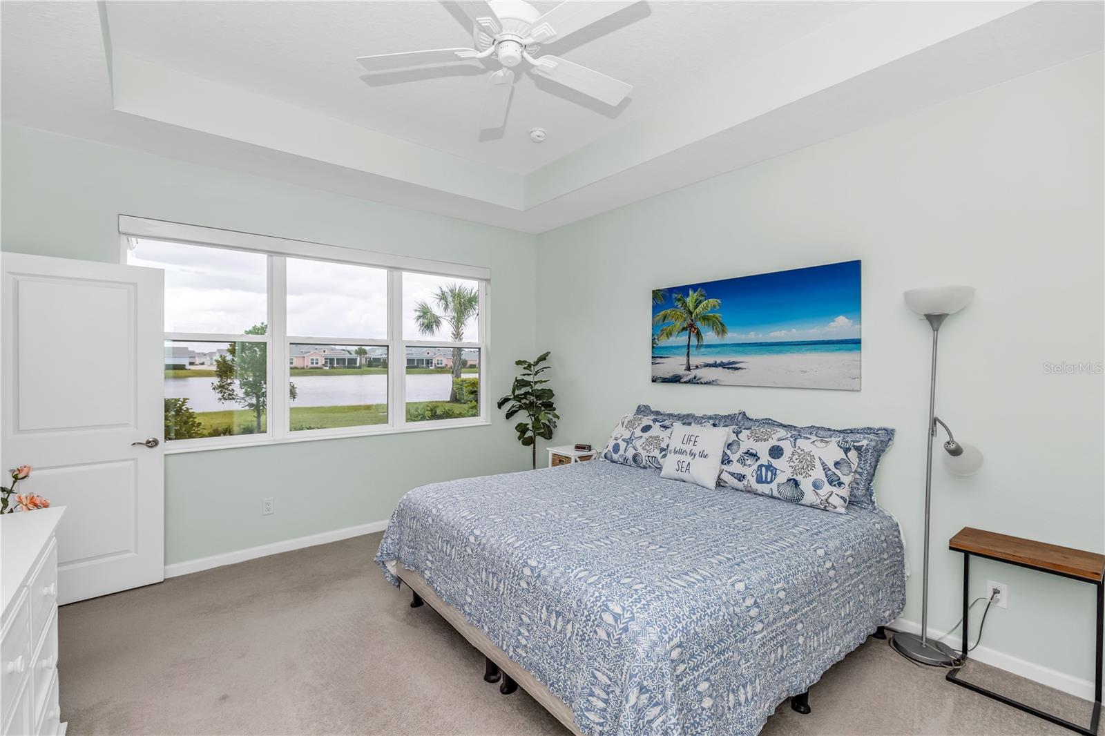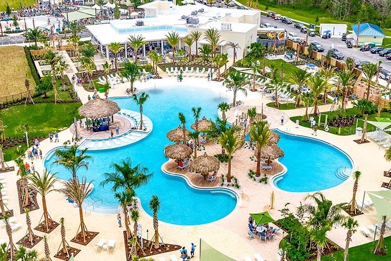 This GORGEOUS FULL LAKE VIEW home is one you do not want to miss! Come enjoy the beautiful sunsets in the evenings with an extended lanai. The large amount of upgrades in this home insure you can’t go wrong. There are fans throughout including outside on the lanai, crown molding, and motorized blinds to be used as you wish on the large sliding glass door in the main living room and primary bedroom window. The open concept kitchen has BEAUTIFUL quartz countertops, a double oven, 42 inch white cabinets and upgraded backsplash. Whole house water purification system and Reverse Osmosis for drinking water in the kitchen. Then there’s the very inviting laundry room with extra storage and SPACIOUS FLEX room that can be made into a social room or work office or even a 3rd bedroom! The primary bedroom’s window faces the FULL LAKE and the bathroom is delightful with a HUGE oversized shower and walk-in closet as well as large built-ins for extra storage. Latitude Margaritaville is a 55+ retirement community offering island inspired recreation, dining, & entertainment. Daily fun, fitness and recreation include 3 pools, fitness center and an amenity center with resort-style, social gathering areas, tiki huts and a full poolside bar and restaurant. The outdoor athletic facilities include tennis and pickleball courts. Come live where there are activities throughout each day and evening that you can choose from and enjoy the good life in Margaritaville! HURRY and schedule your private tour today!
