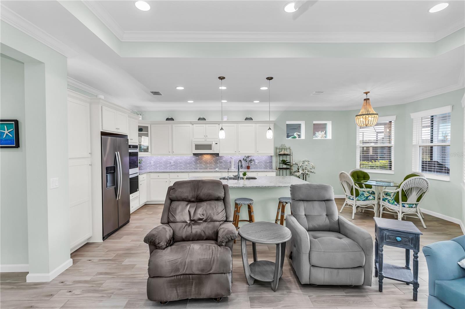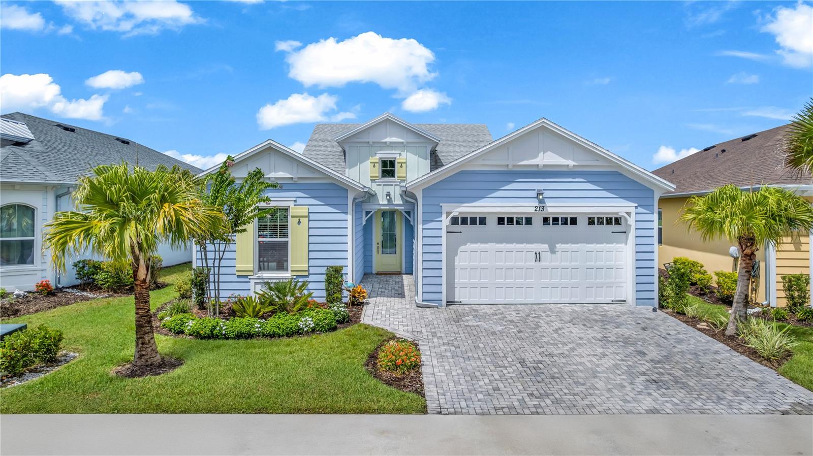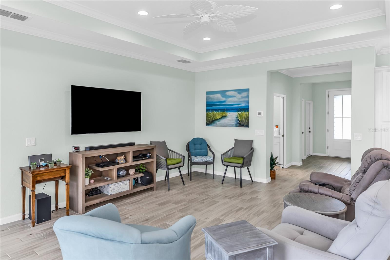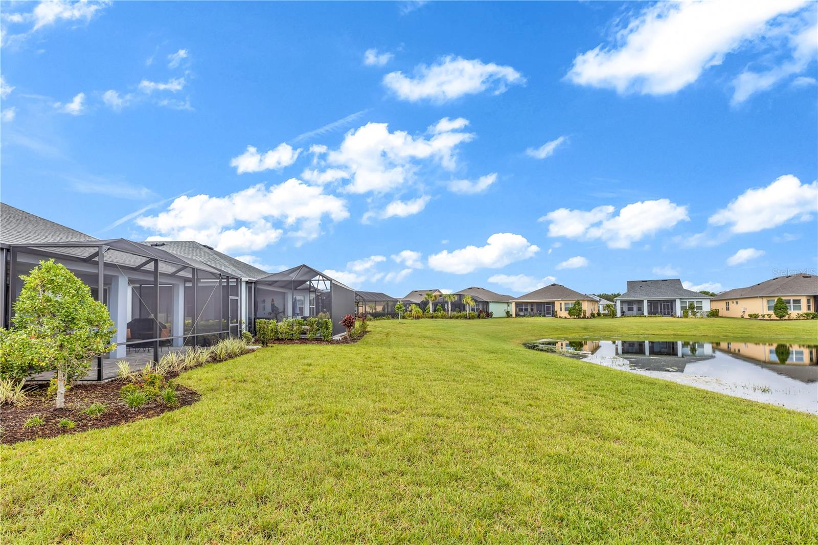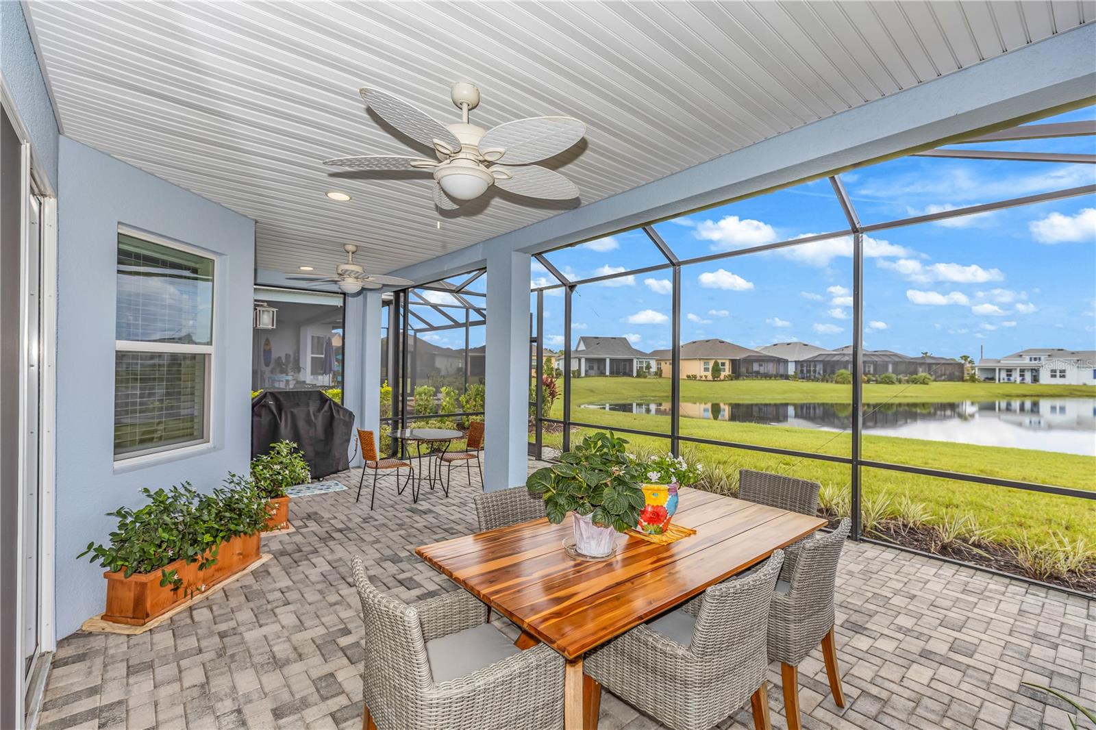 This GORGEOUS FULL LAKE VIEW home is one you do not want to miss! Come enjoy the beautiful sunsets in the evenings with an extended lanai. The large amount of upgrades in this home insure you can’t go wrong. There are fans throughout including outside on the lanai, crown molding, and motorized blinds to be used as you wish on the large sliding glass door in the main living room and primary bedroom window. The open concept kitchen has BEAUTIFUL quartz countertops, a double oven, 42 inch white cabinets and upgraded backsplash. Whole house water purification system and Reverse Osmosis for drinking water in the kitchen. Then there’s the very inviting laundry room with extra storage and SPACIOUS FLEX room that can be made into a social room or work office or even a 3rd bedroom! The primary bedroom’s window faces the FULL LAKE and the bathroom is delightful with a HUGE oversized shower and walk-in closet as well as large built-ins for extra storage. Latitude Margaritaville is a 55+ retirement community offering island inspired recreation, dining, & entertainment. Daily fun, fitness and recreation include 3 pools, fitness center and an amenity center with resort-style, social gathering areas, tiki huts and a full poolside bar and restaurant. The outdoor athletic facilities include tennis and pickleball courts. Come live where there are activities throughout each day and evening that you can choose from and enjoy the good life in Margaritaville! HURRY and schedule your private tour today!