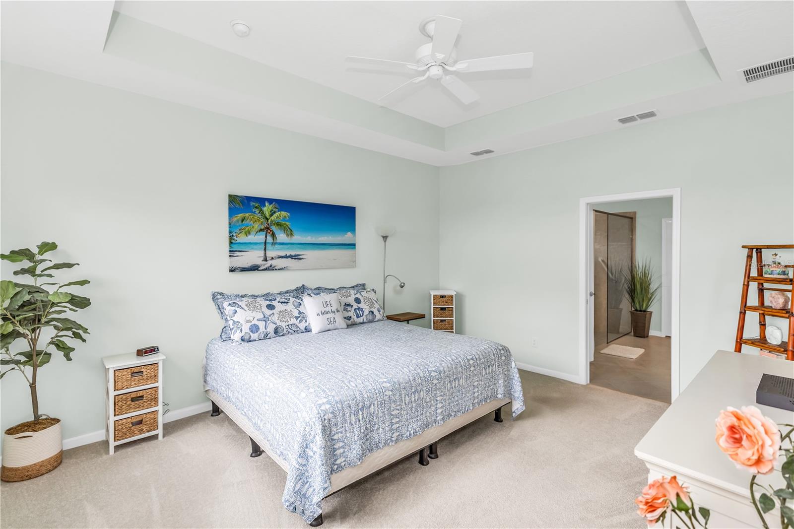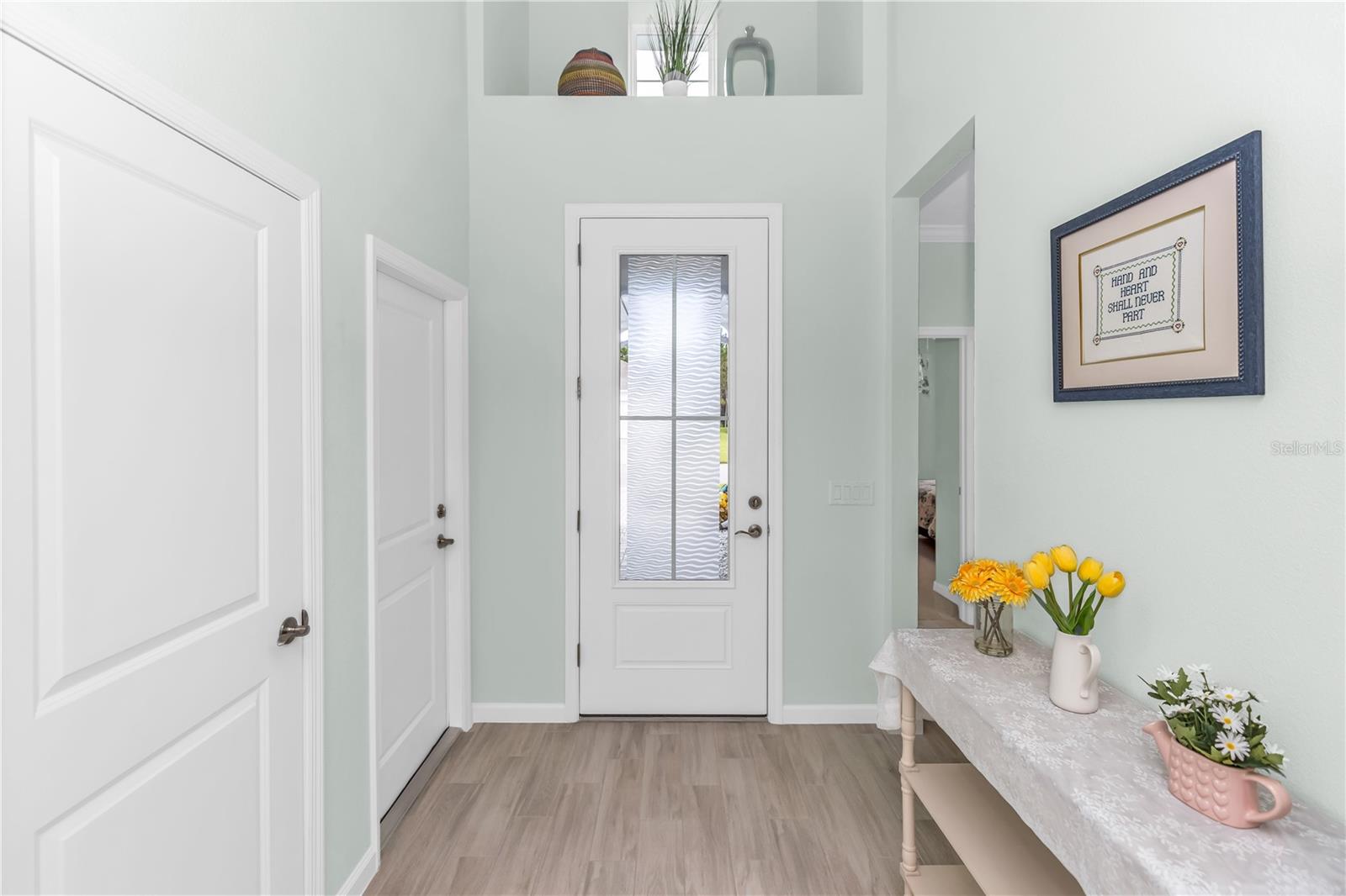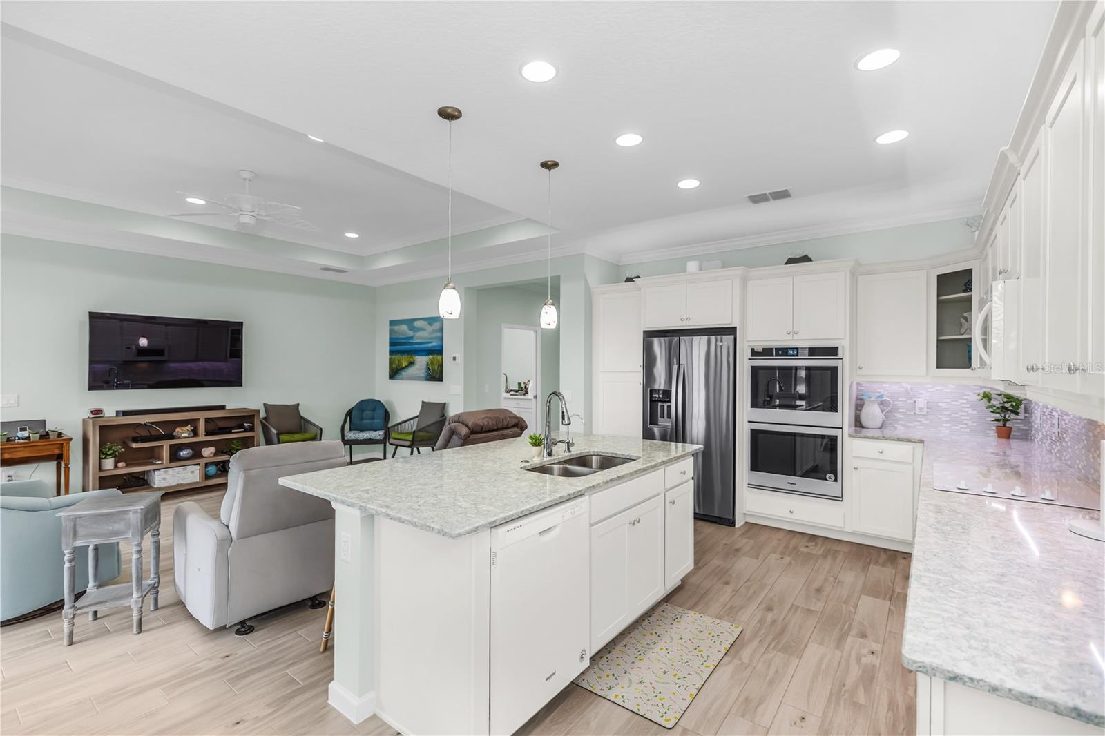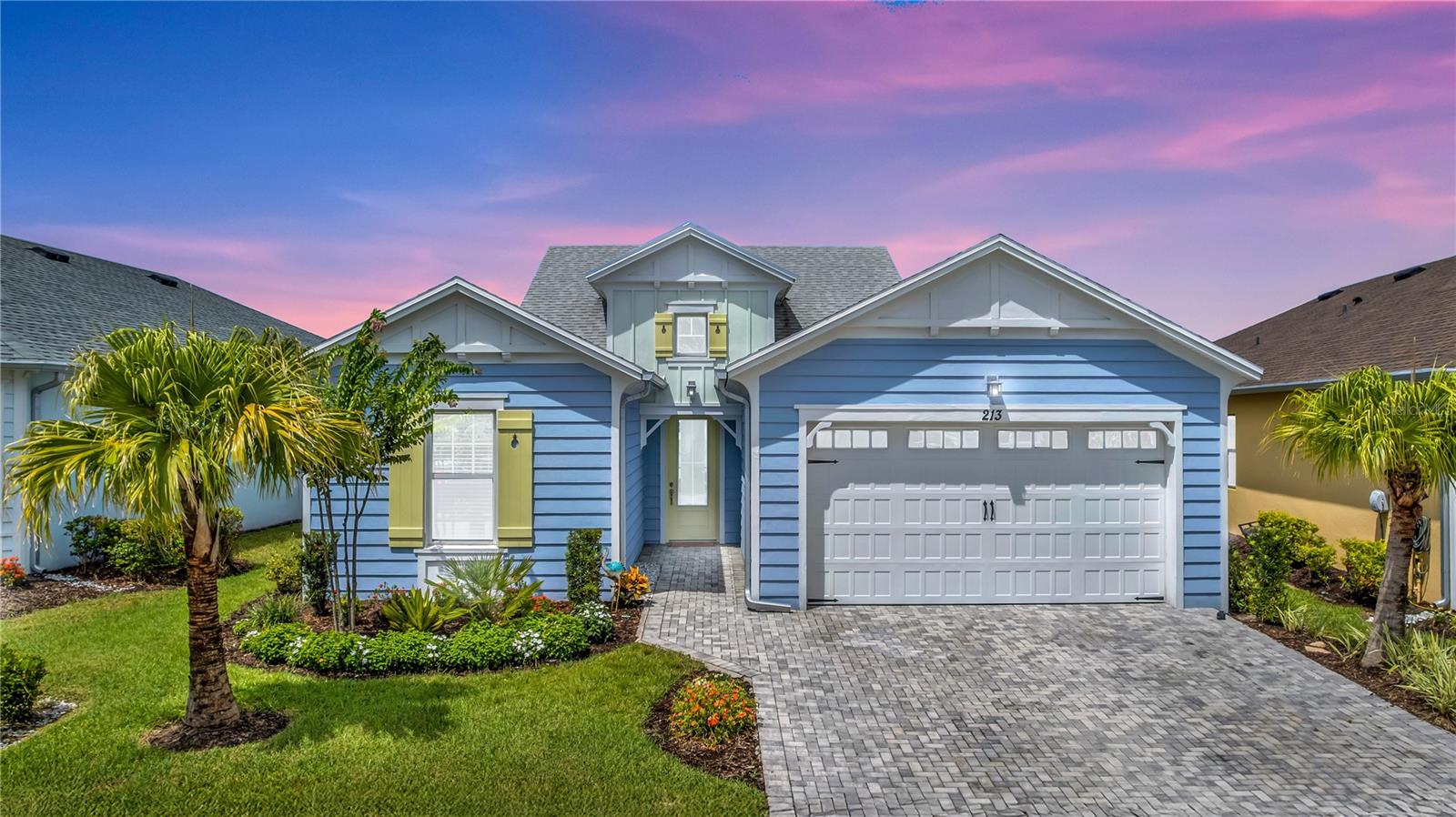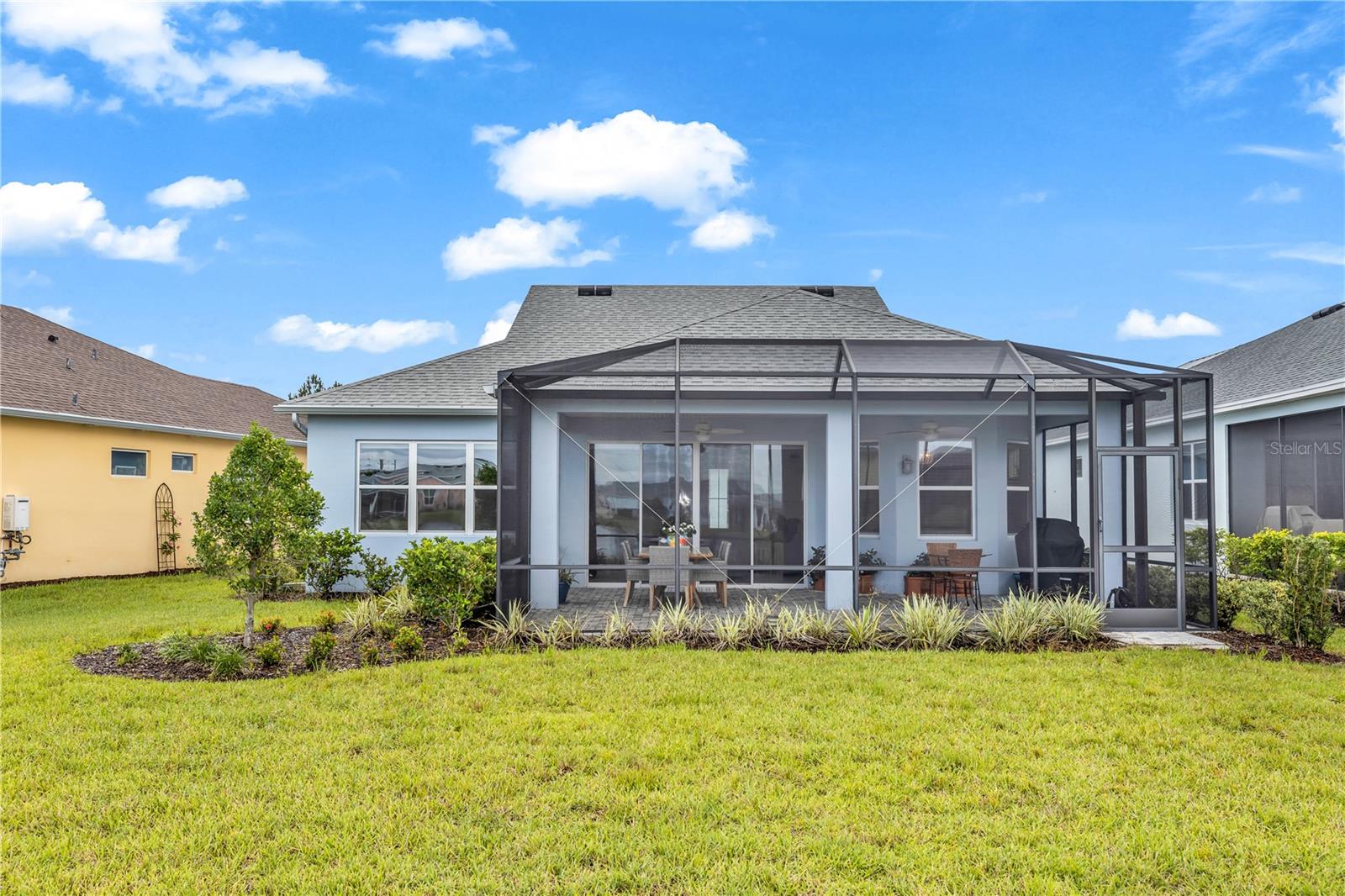 This GORGEOUS FULL LAKE VIEW home is one you do not want to miss! Come enjoy the beautiful sunsets in the evenings with an extended lanai. The large amount of upgrades in this home insure you can’t go wrong. There are fans throughout including outside on the lanai, crown molding, and motorized blinds to be used as you wish on the large sliding glass door in the main living room and primary bedroom window. The open concept kitchen has BEAUTIFUL quartz countertops, a double oven, 42 inch white cabinets and upgraded backsplash. Whole house water purification system and Reverse Osmosis for drinking water in the kitchen. Then there’s the very inviting laundry room with extra storage and SPACIOUS FLEX room that can be made into a social room or work office or even a 3rd bedroom! The primary bedroom’s window faces the FULL LAKE and the bathroom is delightful with a HUGE oversized shower and walk-in closet as well as large built-ins for extra storage. Latitude Margaritaville is a 55+ retirement community offering island inspired recreation, dining, & entertainment. Daily fun, fitness and recreation include 3 pools, fitness center and an amenity center with resort-style, social gathering areas, tiki huts and a full poolside bar and restaurant. The outdoor athletic facilities include tennis and pickleball courts. Come live where there are activities throughout each day and evening that you can choose from and enjoy the good life in Margaritaville! HURRY and schedule your private tour today!