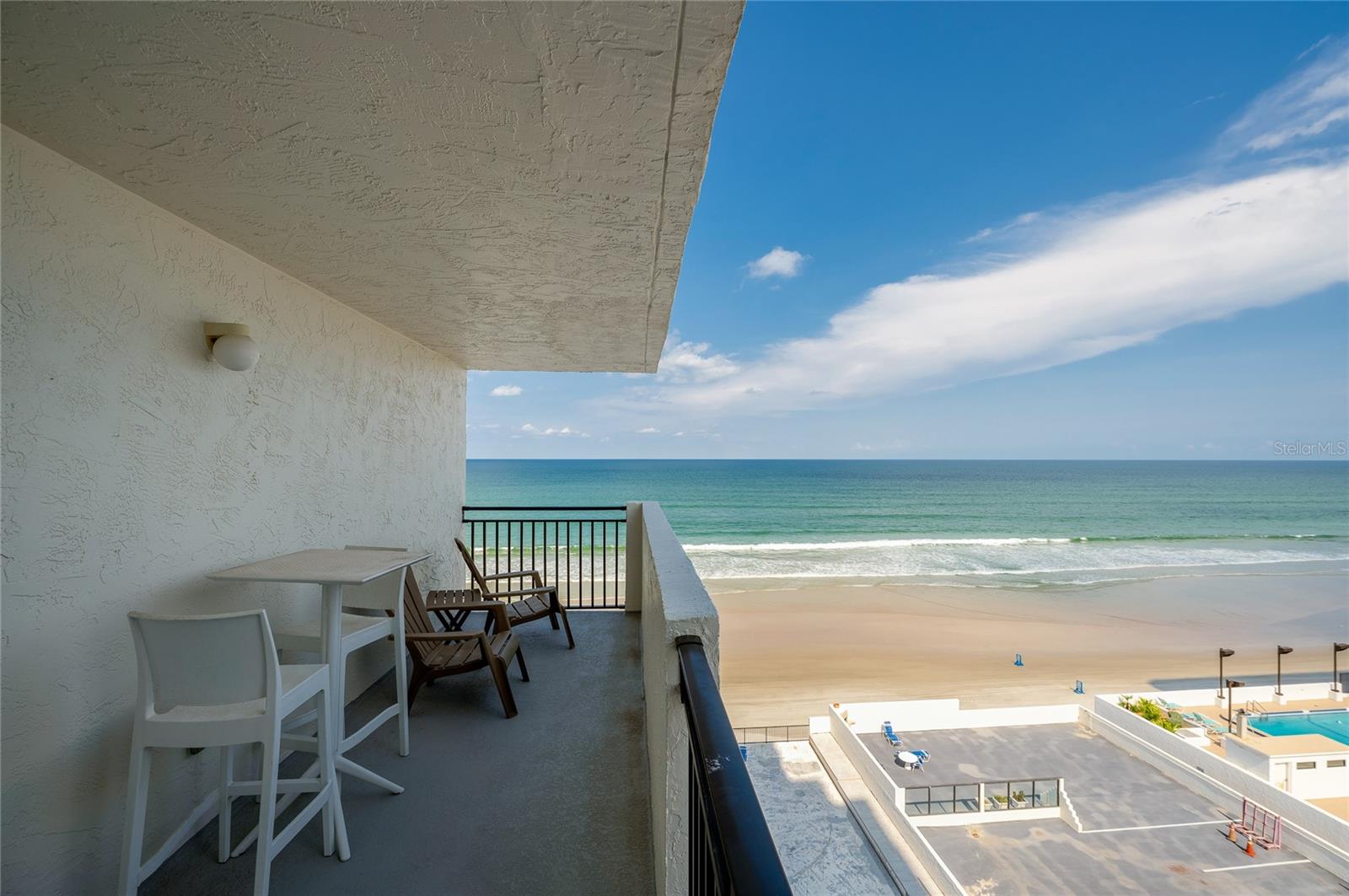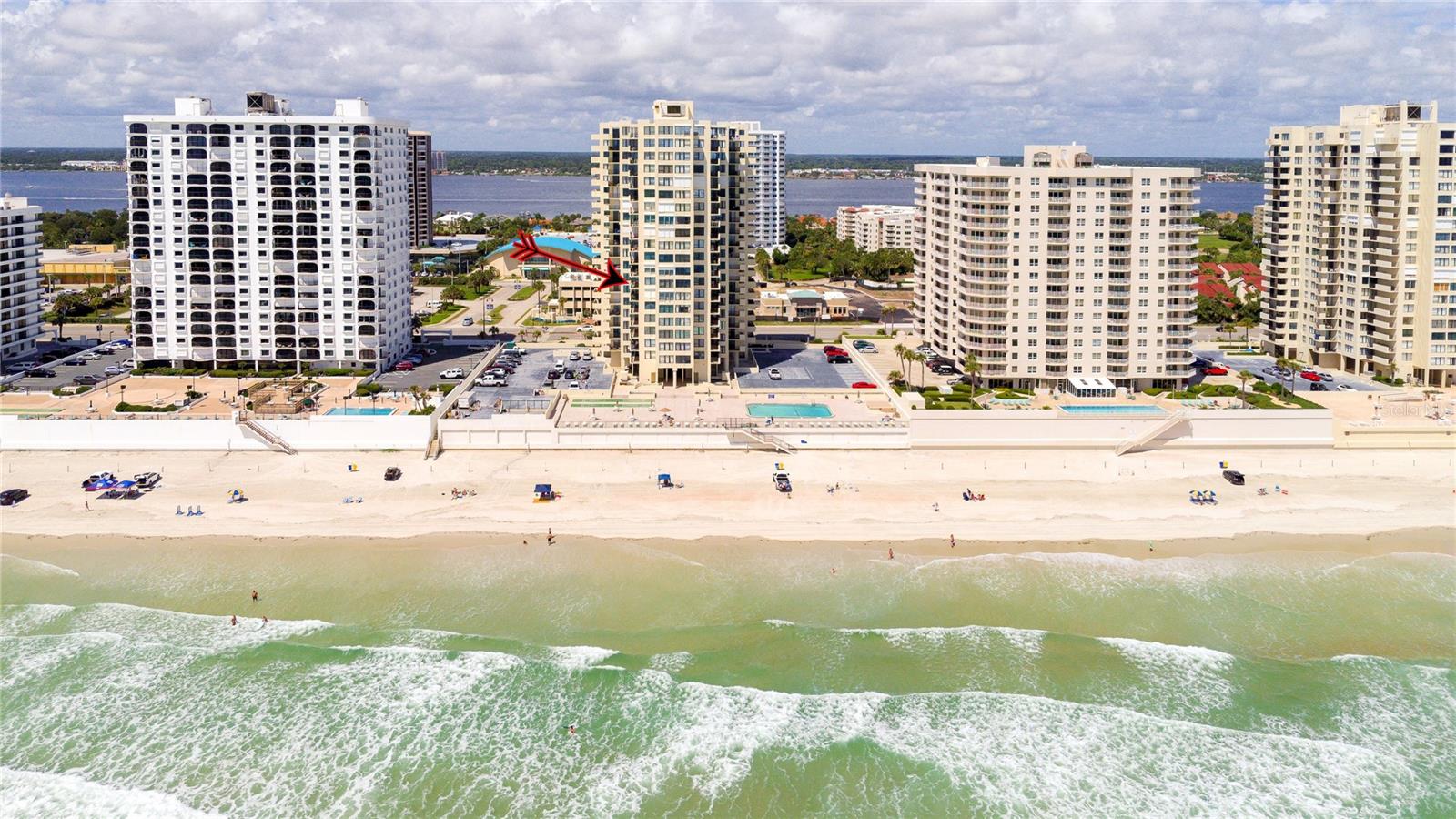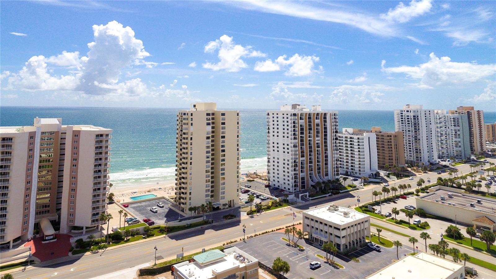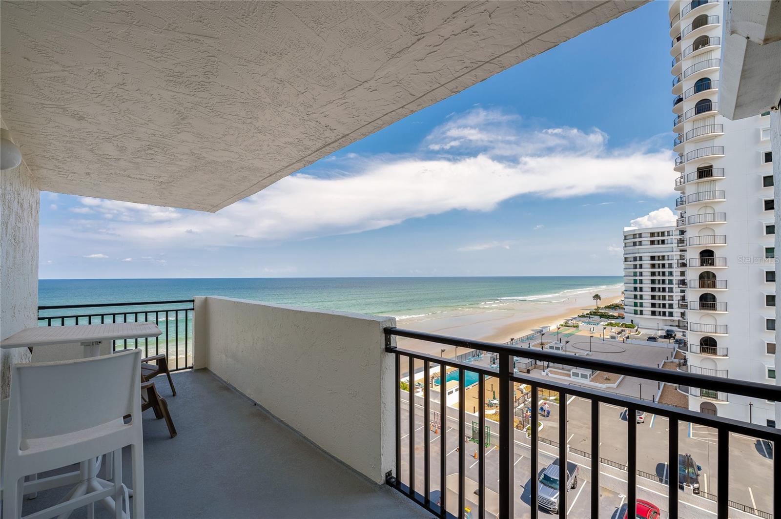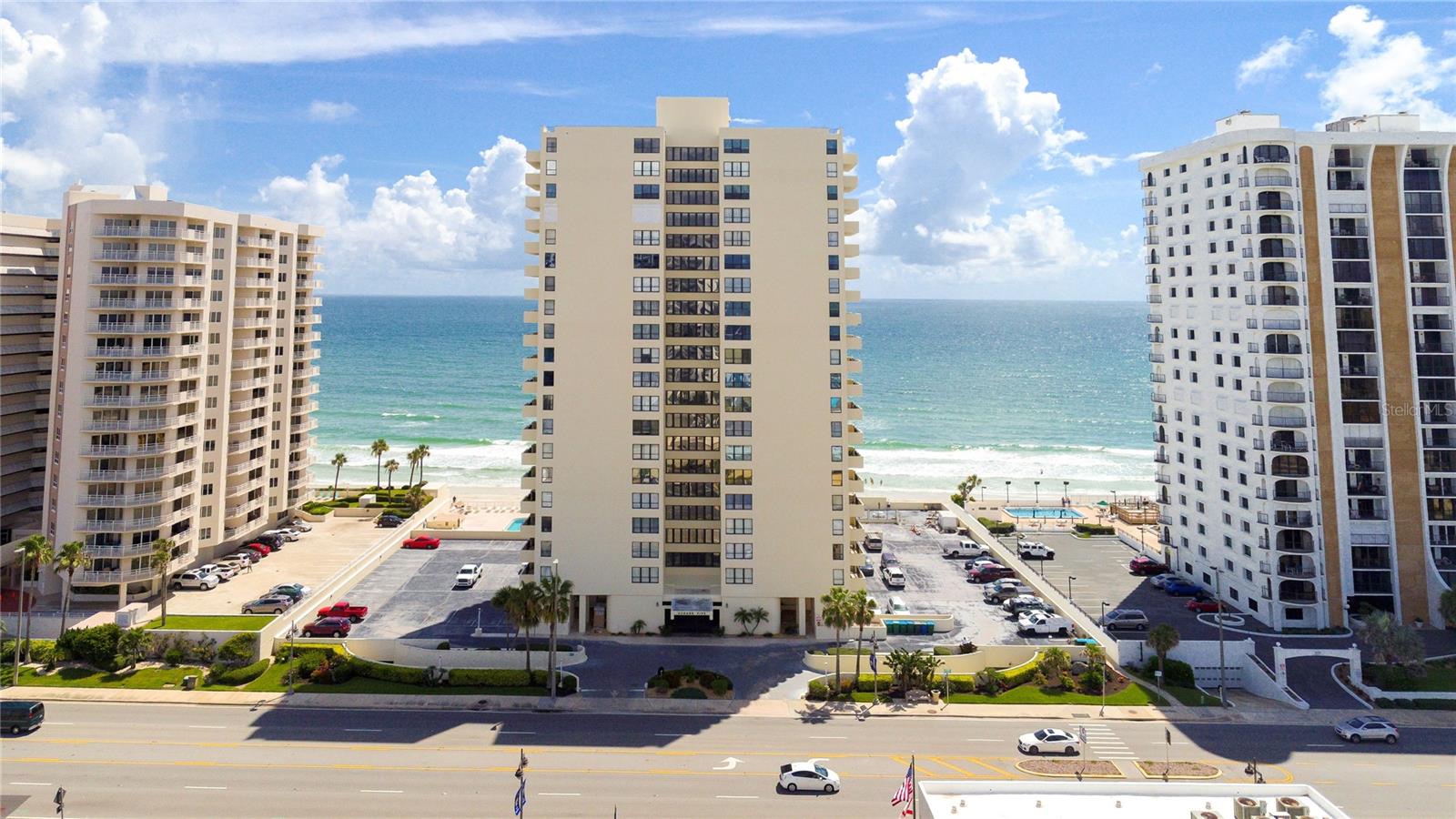 Located on the 7th floor with the much-desired southeast direct ocean views, this condo is ideally located for convenience and the best of oceanfront living. Enjoy the ocean breezes from the direct ocean-front balcony, watch a shuttle launch or spy on beachgoers below. Light and bright, the big windows maximize the joy of sunrises and ocean and river views. The kitchen, with corian counters and white cabinets, is open to the dining room. The two bedrooms are generous, with an ensuite primary bedroom and a second bath with easy access for guests and the second bedroom. Convenient! Just one block to the Publix Shopping Center and Walgreens, across from an executive golf course, and Daytona Beach Shores Community Center with lots of available activities. Oceans Five is undergoing a multi year renovation including new hurricane glass in common areas, lobby updates, elevator updates, seawall and beach access updates, pool deck updates and life safety improvements to prepare this property for many years to come. On site management provides another level of security for full and part time residents. Electric blinds in the living and primary bedroom. Electric roll down shutters on all but the south facing window. This condo offers a perfect combination of location and ocean front living at an affordable price!