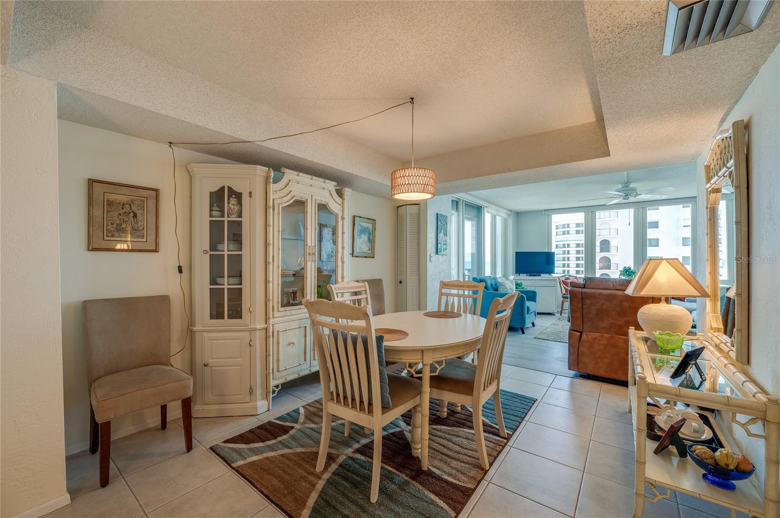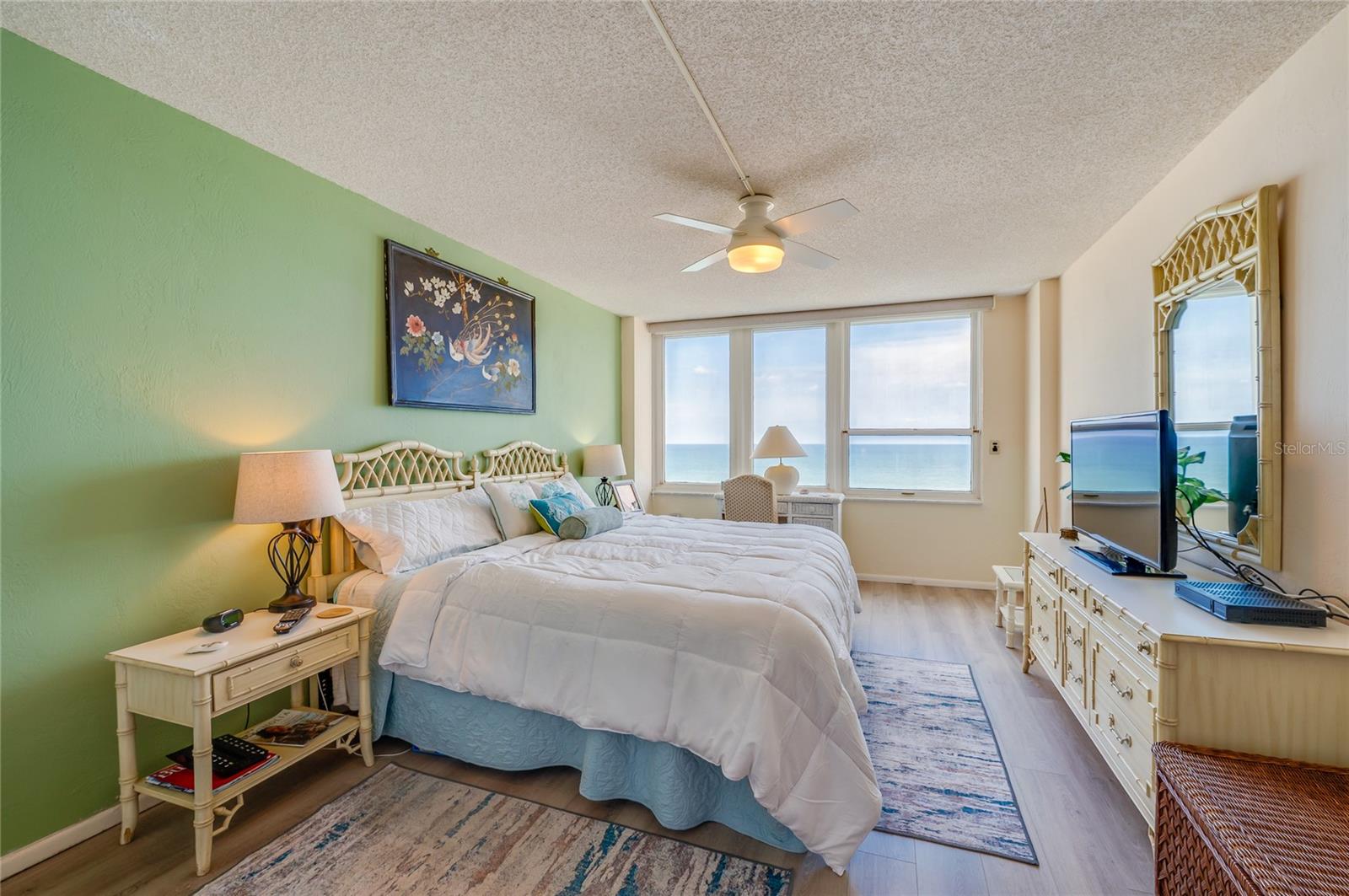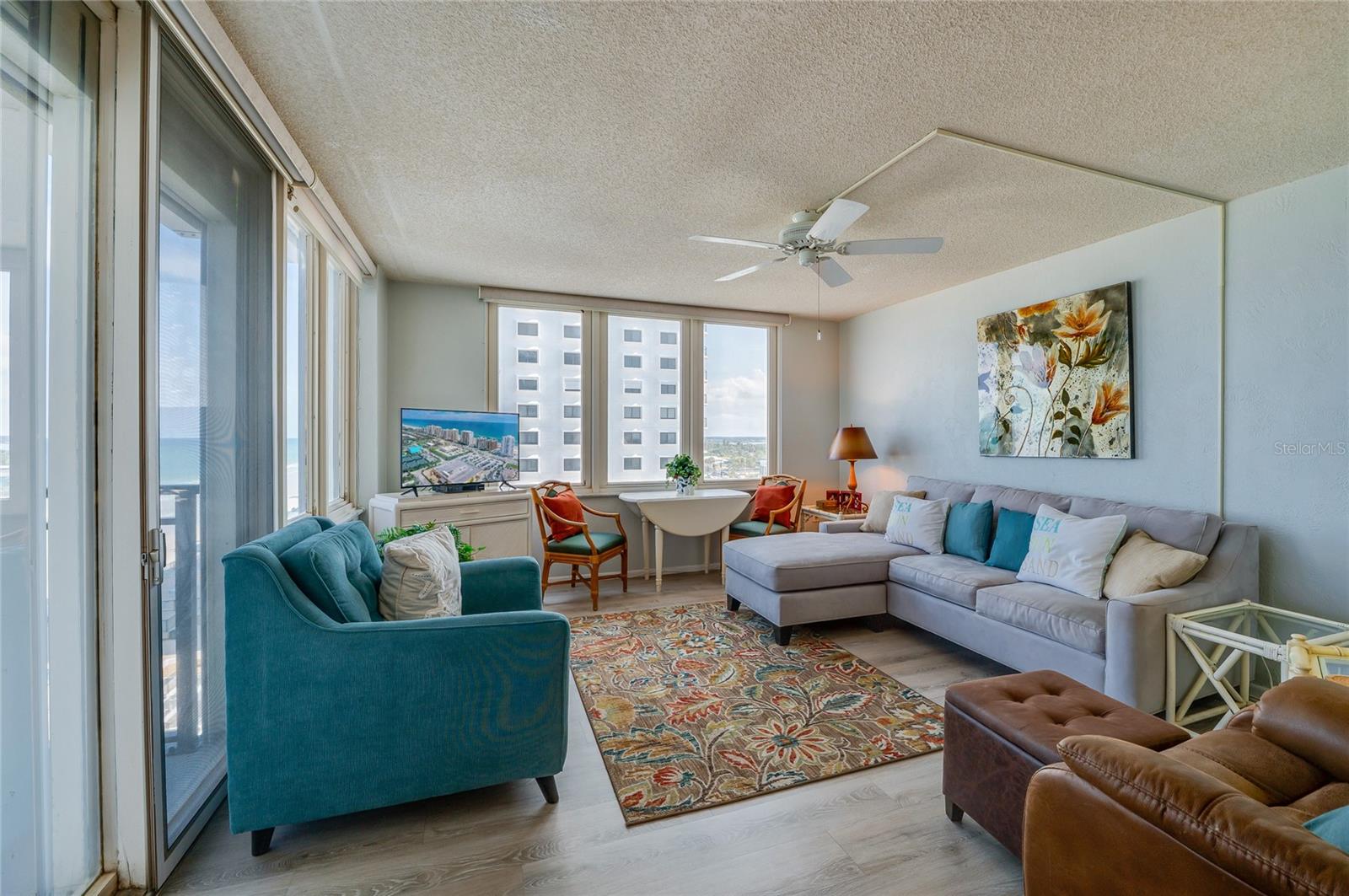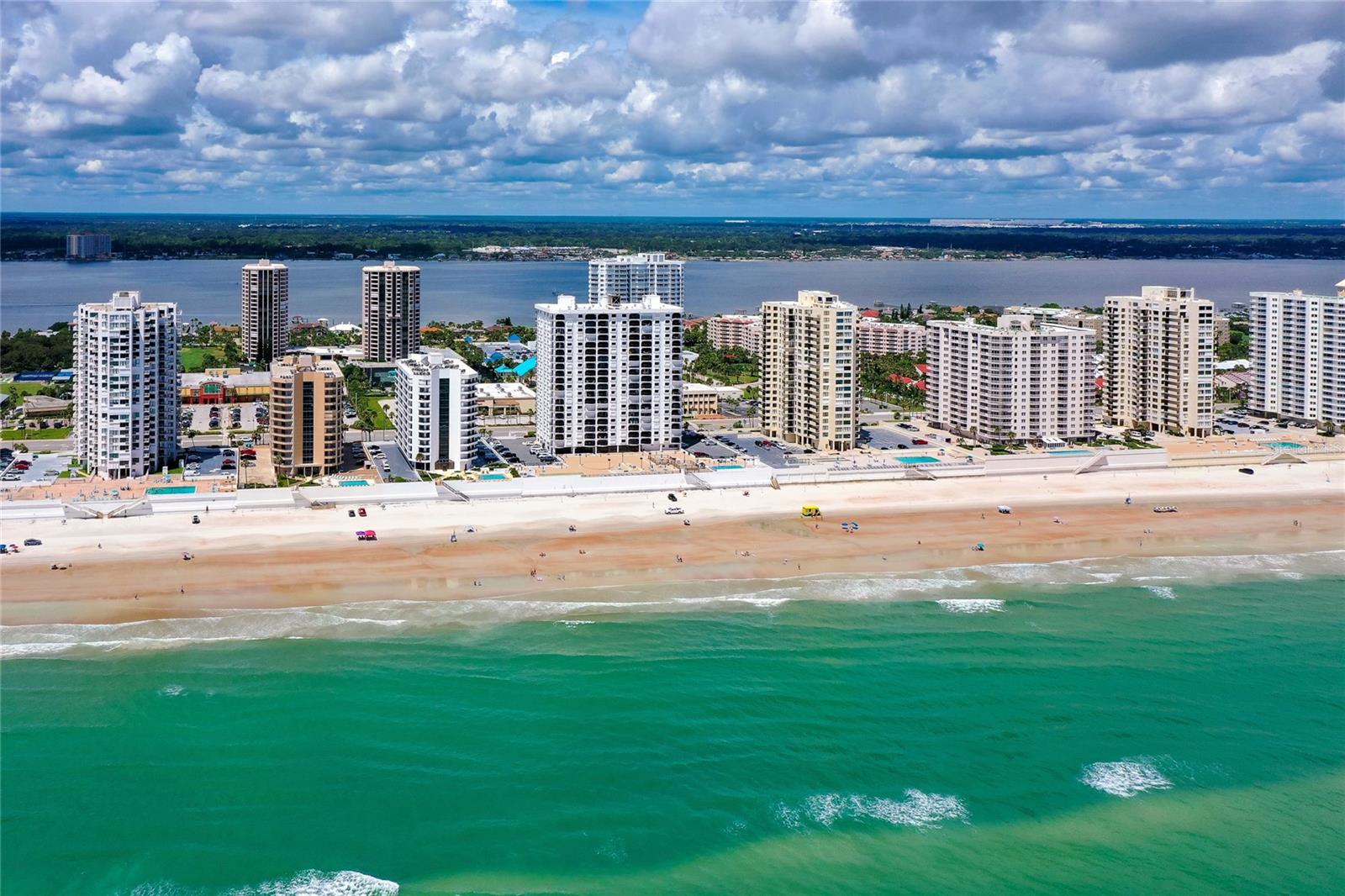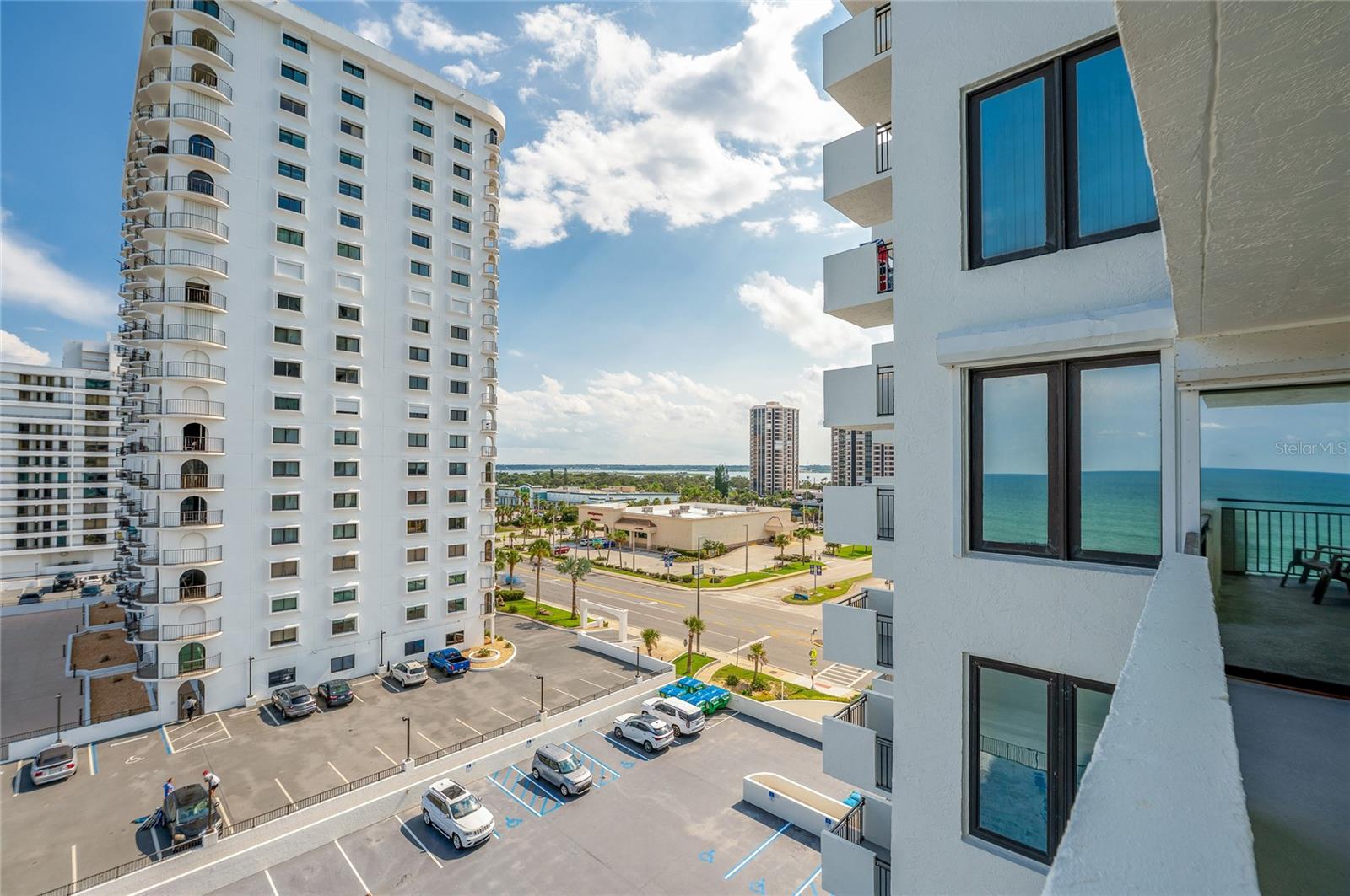 Located on the 7th floor with the much-desired southeast direct ocean views, this condo is ideally located for convenience and the best of oceanfront living. Enjoy the ocean breezes from the direct ocean-front balcony, watch a shuttle launch or spy on beachgoers below. Light and bright, the big windows maximize the joy of sunrises and ocean and river views. The kitchen, with corian counters and white cabinets, is open to the dining room. The two bedrooms are generous, with an ensuite primary bedroom and a second bath with easy access for guests and the second bedroom. Convenient! Just one block to the Publix Shopping Center and Walgreens, across from an executive golf course, and Daytona Beach Shores Community Center with lots of available activities. Oceans Five is undergoing a multi year renovation including new hurricane glass in common areas, lobby updates, elevator updates, seawall and beach access updates, pool deck updates and life safety improvements to prepare this property for many years to come. On site management provides another level of security for full and part time residents. Electric blinds in the living and primary bedroom. Electric roll down shutters on all but the south facing window. This condo offers a perfect combination of location and ocean front living at an affordable price!