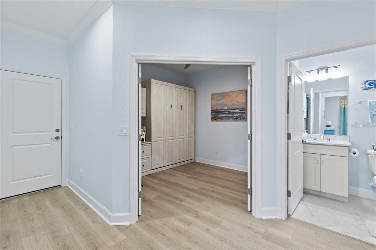 Gorgeous Aloha Cottage! The largest of the cottage models, offering nearly 1,500 square feet of coastal-inspired living. Built in 2024, this home still has time remaining on the Master Care Builder Warranty for added peace of mind. Step inside and you'll love the serene colors and open layout that perfectly blend comfort and style. The dream kitchen features soft grey cabinetry, quartz countertops, and a large farmhouse-style sink — ideal for any home chef. The split floorplan provides privacy, with the spacious primary suite on one side and the guest bedroom, full bath, and den on the other. The den includes a built-in desk and Murphy bed — perfect for a home office and extra guests. Enjoy the outdoors on the lovely, screened porch, perfect for dining or relaxing, overlooking the generous lot. Additional highlights include a two-car garage with epoxy flooring and plenty of storage. This beautiful home offers coastal charm, and easy living in Latitude Margaritaville! Resort-style amenities include the Paradise Pool and sports pool, on-site restaurant and bars, fitness center with classes, sauna, indoor lap pool, pickleball, tennis and bocce courts, dog park, bandshell with live entertainment, the Last Mango Theater, plus a private beach club in Ormond Beach with luxury bus transportation.