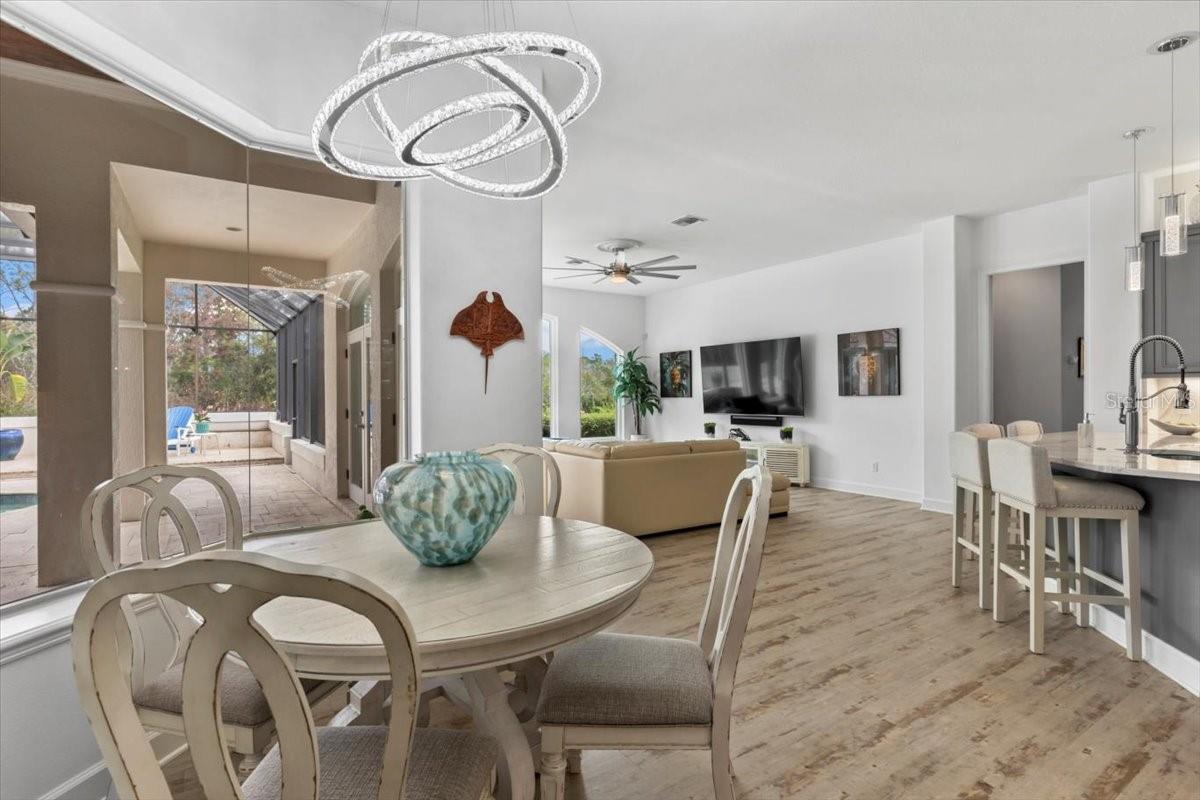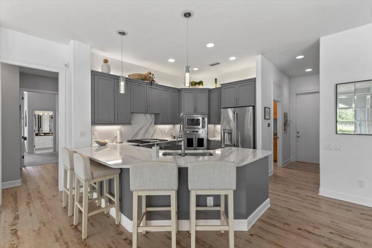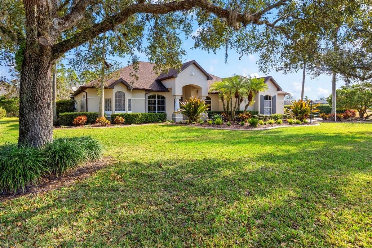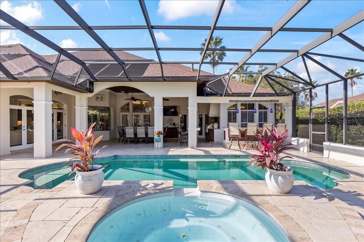 The epitome of privacy and luxury, the gated Lionspaw Grand neighborhood offers an upscale living community with easy access to world-class golf and a country club environment with an elevated Florida feel. This community HOA is well-managed by a professional. Homes infrequently become available in this area so this an excellent opportunity for a discerning buyer to be part of this only LPGA gated neighborhood. Located directly across the street from the 7th hole of the Jones LPGA Golf Course, this property sits within a private cul de sac and features a half-acre lot overlooking a lake and a lovely preserve. This home is an entertainment dream featuring French doors opening to an extra-large Lanai equipped with a full kitchen and expansive bar that includes a grill, refrigerator, sink, ice maker, and plenty of space to entertain. Swim year around in the beautiful saltwater pool on a travertine patio overlooking the lake and natural habitat. This four-bedroom, four full-bath estate home offers a light, bright, open floorplan with generous room for entertaining. The sophistication extends throughout with the continuous luxury flooring, the stainless and quartz kitchen which opens to the family room, the split-bedroom floor plan offering comfort and quiet, and access to the pool area from numerous points throughout the home. Easily entertain guests while also being able to retreat to your private, dedicated office when work calls. The large primary master suite features two walk-in closets and separate his and her vanities. The second primary suite located on the opposite end of the house extends the owners privacy and is ideal for guests The home has undergone a full cosmetic refresh, featuring: House painted - interior 2022-23; exterior 2024 Pass through/arch tile work 2022 New/updated kitchen paint - 2022 New vinyl luxury flooring updated throughout - 2022 Updated baths - 2024 New pool/jacuzzi heater 2024 New high throughput Gas meter installed 2024 - increased flow New AC unit - 2025 (1 of 2) Washer/dryer conveys; dryer is NEW/2025 New pool pump - 2025 Updated landscaping 2025 All information taken from the tax record, and while deemed reliable, cannot be guaranteed.