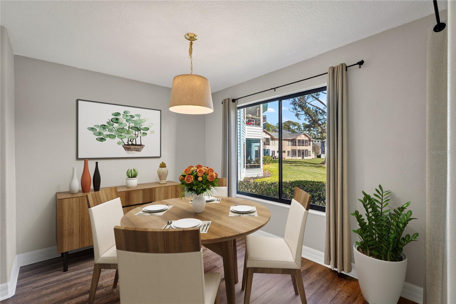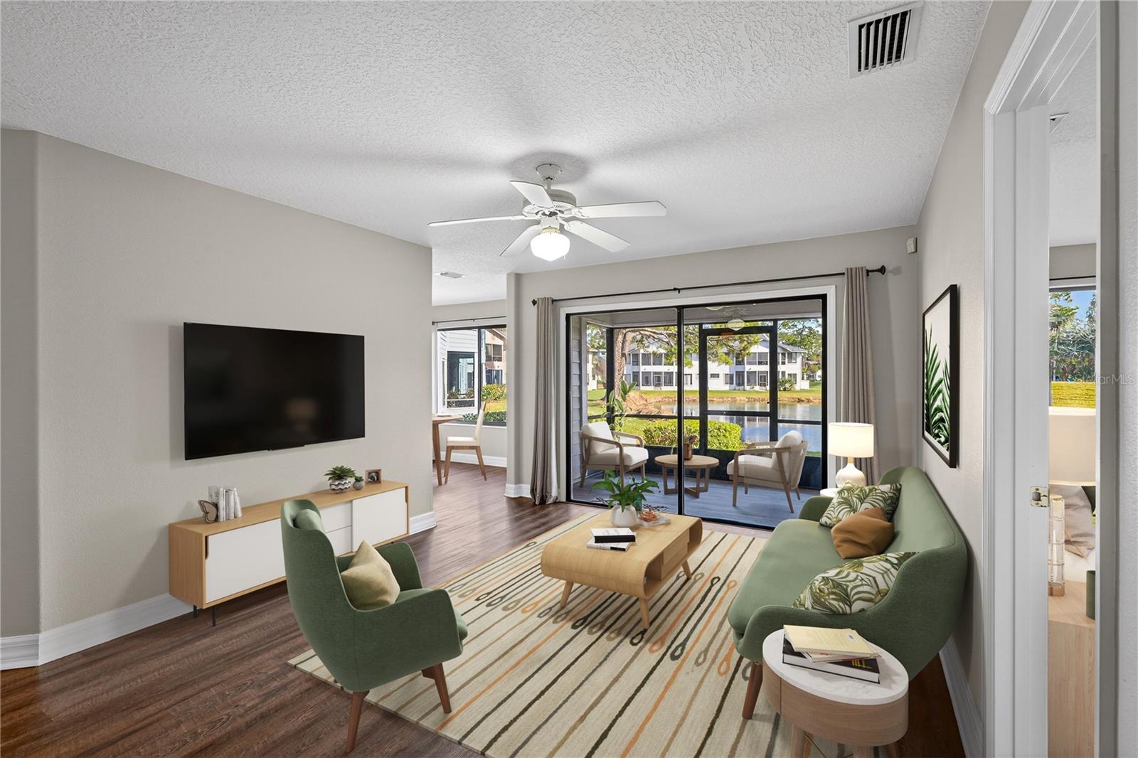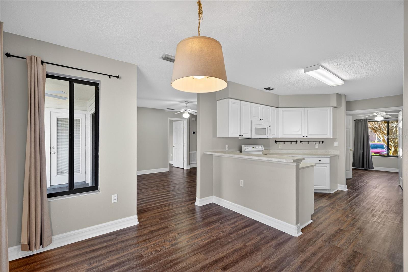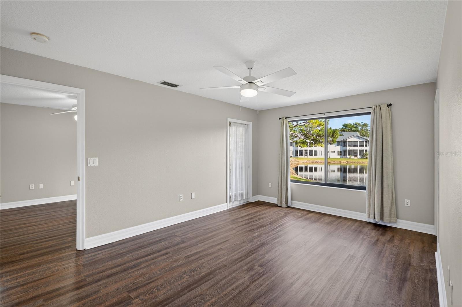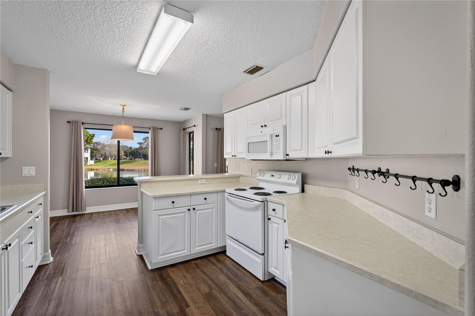 One or more photo(s) has been virtually staged. Welcome to this Well-maintained corner unit featuring 3 bedrooms and 2 bathrooms in the desirable gated Pelican Bay community. This spacious split floor plan offers peaceful water views from the kitchen, breakfast nook, and screened lanai. Interior highlights include vinyl plank flooring throughout, an open living and dining area, and a functional kitchen with ample cabinet space. Enjoy the convenience of inside laundry with washer and dryer included. The screened patio overlooks a serene pond, perfect for relaxing. HOA covers trash, water, sewage, and cable/internet. Pelican Bay offers a gated entrance, mature landscaping, and a golf-course setting. Conveniently located near shopping, dining, major roadways, and a short drive to Daytona Beach.