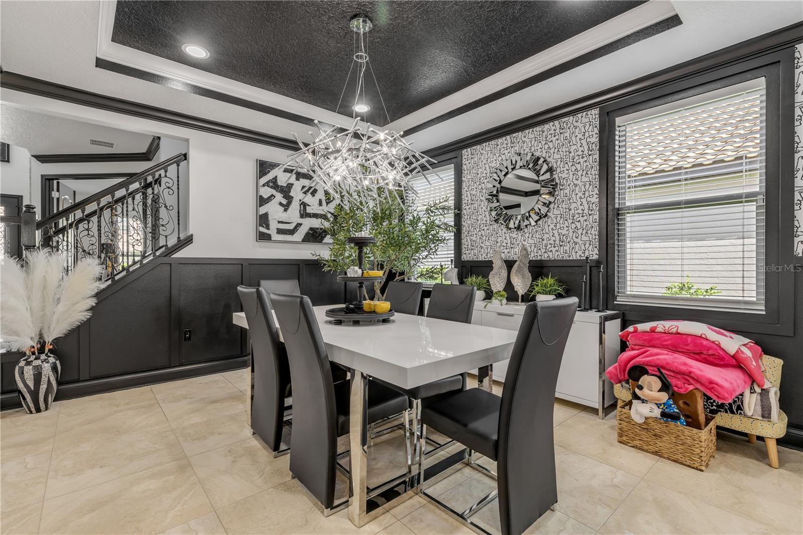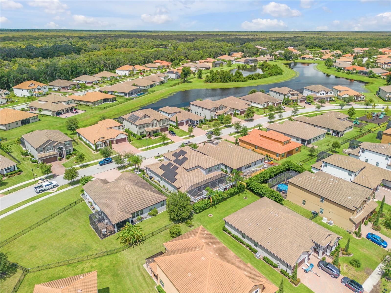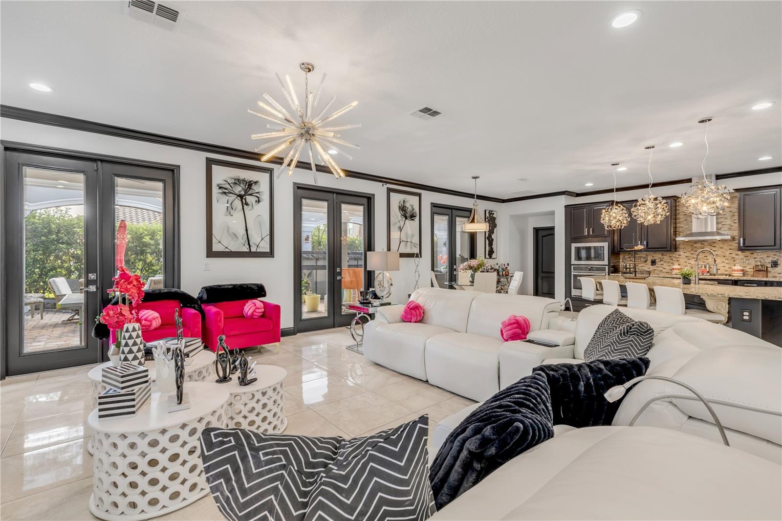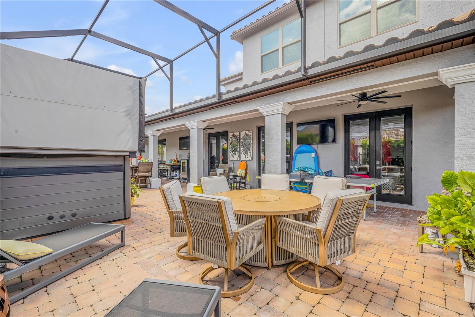 Welcome to your dream home, a breathtaking blend of luxury and modern updates in the desired Riviera Bella gated community. This stunning 4-bedroom, 3.5-bathroom, 4,420 sqft home has been completely updated inside and out. Step through the elegant wrought iron frosted French doors into a grand foyer with a side-by-side stone wall and porcelain tiled floors that flow throughout the entire first floor. This open-concept design provides a spacious office or flex room, crown moldings throughout, and three glass French doors that bathe the dining room, living room, and kitchen in natural light. The gourmet kitchen is a chef's delight, featuring a gas stove, stainless steel appliances, and a reverse osmosis filter system for fresh drinking water. A large granite island overlooks the light-filled living room, which boasts a stunning stone wall accent with a modern electric fireplace and a flat-screen TV. The primary suite is a true sanctuary, featuring a tray ceiling with crown molding, dimmable lighting, and another stone wall with an electric fireplace and flat-screen TV. The luxurious primary bathroom provides double sinks, a striking fish tank shower, and a standalone tub perfectly positioned for a relaxing soak while watching your favorite movie. The expansive primary closet includes a built-in closet system, dimmable lighting, and a secret vault for your most treasured belongings. Step out through the French doors into a 55-foot screened-in lanai, designed for ultimate relaxation with high arches, columns, and dimmable lighting. Outside, enjoy the lap pool with a spa and professionally landscaped grounds, all powered by newly installed solar panels. Upstairs, there are additional bedrooms, including a second primary suite with a private bathroom. The loft has been converted into a private theater/game room, and an adjacent room provides potential as a 5th bedroom or additional storage. The spacious 3-car garage comes with built-in cabinets, Located in a community that provides a resort-style pool, fitness center, splash pad, playground, river access, and more, this luxurious home has everything you could want. Don’t miss the 3D walk-through tour!