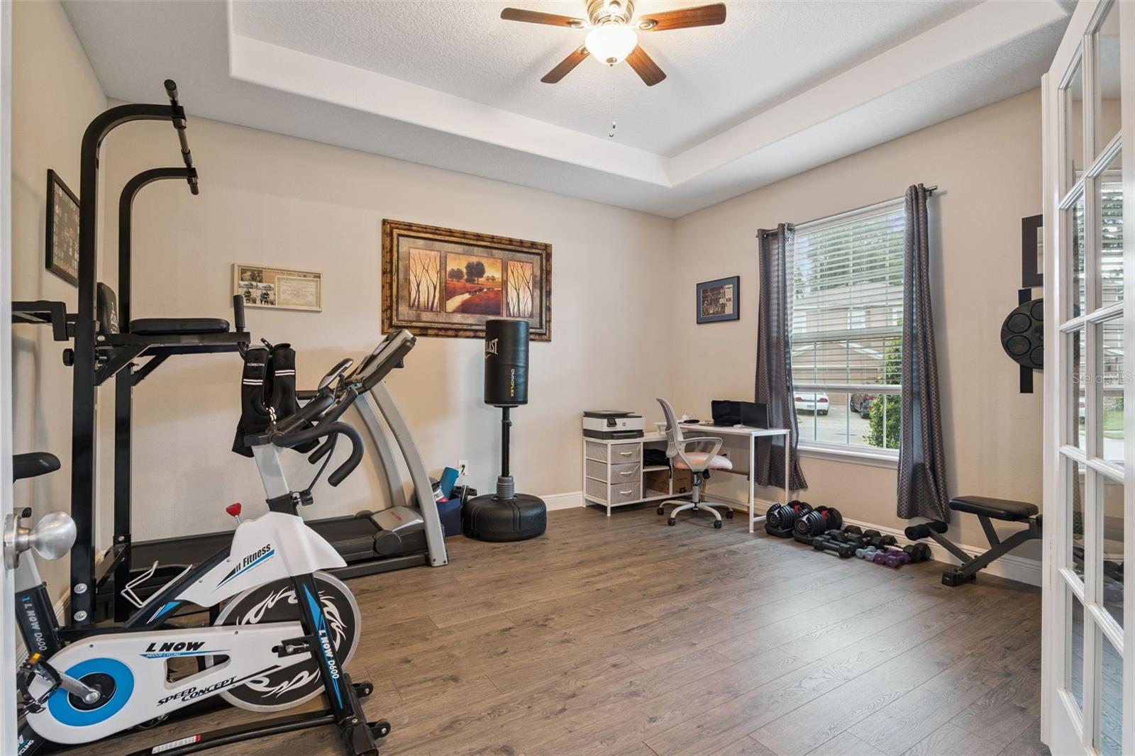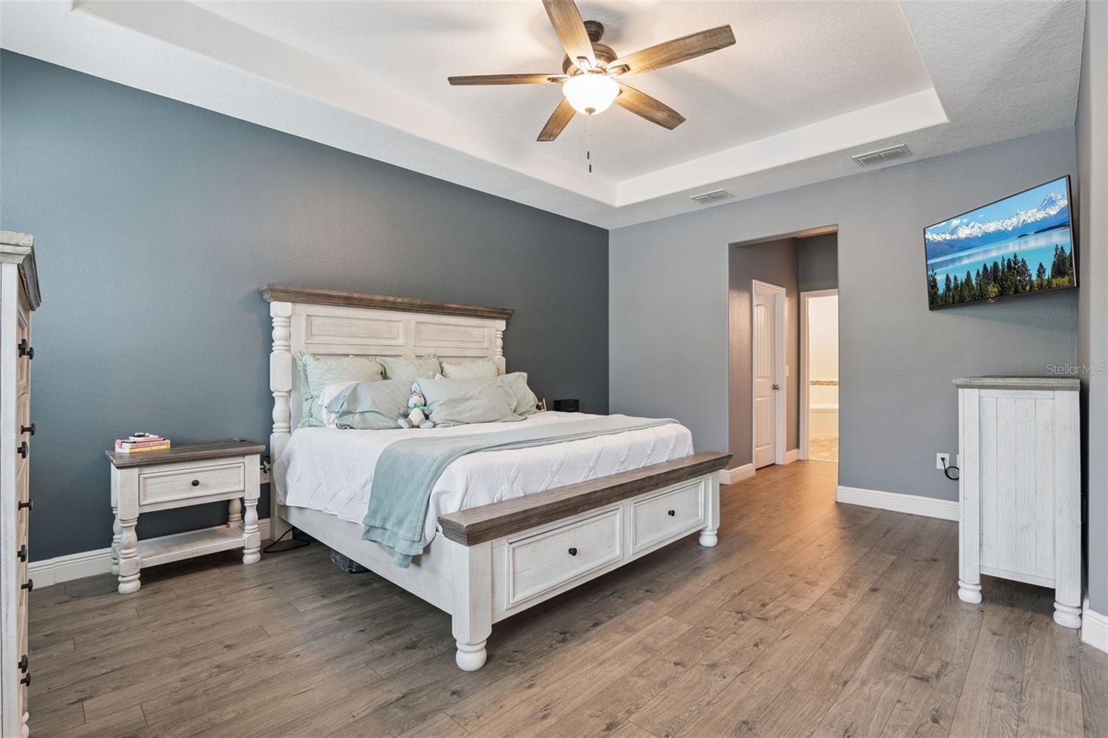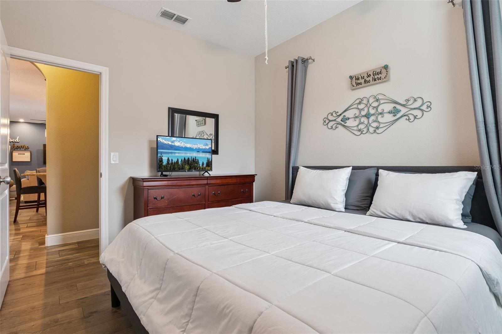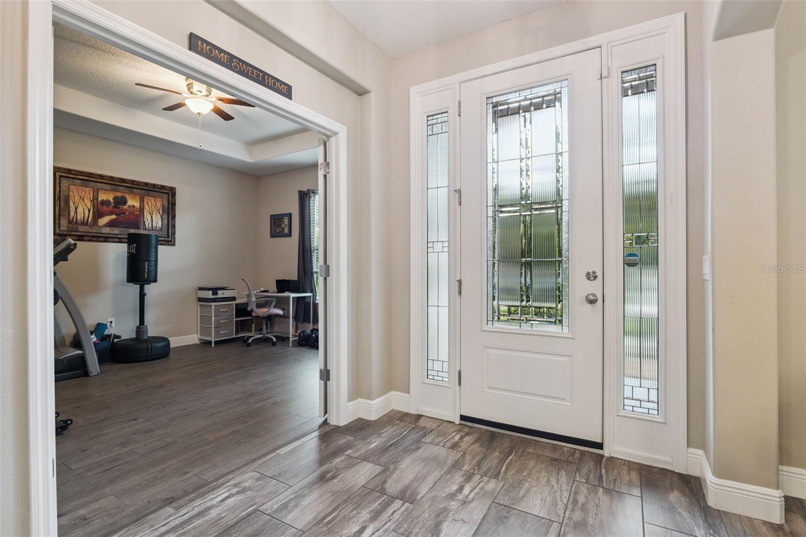 IMMACULATELY maintained and FRESHLY painted, this POOL home in the desirable Wellington Woods community is ready to impress. Set on an oversized corner lot with lush, mature landscaping and a privacy fence, this 4-bedroom PLUS office or flex space, 2 bath residence offers nearly 2,500 square feet of thoughtfully designed living space. Step inside and you are greeted by soaring volume ceilings, an open floor plan, and wide ceramic driftwood-style tile that flows seamlessly throughout the main living areas. There is no carpet in this home. At the heart of the home, the chef’s kitchen blends function and style with espresso 42" wood cabinets, gleaming granite countertops, stainless steel appliances, and a gas cooktop, a wall oven, and microwave. A working island breakfast bar overlooks the spacious family room, where a built-in 5-speaker system sets the stage for movie nights and gatherings with friends. Glass sliders open to your private outdoor retreat, a screened saltwater pool with a soothing waterfall feature, and a 6-foot depth. Whether you are hosting summer cookouts with the patio’s OUTDOOR speakers or stepping out from the master suite for a late-night swim, this backyard was designed for year-round enjoyment. The master suite is a true escape, featuring dual closets, private pool access, and a spa-inspired bath with dual extra high vanities, a garden tub, and a separate shower. Additional spaces include a formal dining room, a large indoor utility room, and a 3-car garage with a generator transfer switch that can power the entire home except the AC. Practical upgrades add peace of mind, including bi-annual AC servicing, gutters, irrigation system, a RING doorbell, and NEW exterior paint. Move-in ready, beautifully maintained, and perfectly designed for entertaining or everyday living, this home is ready for its next owner!
