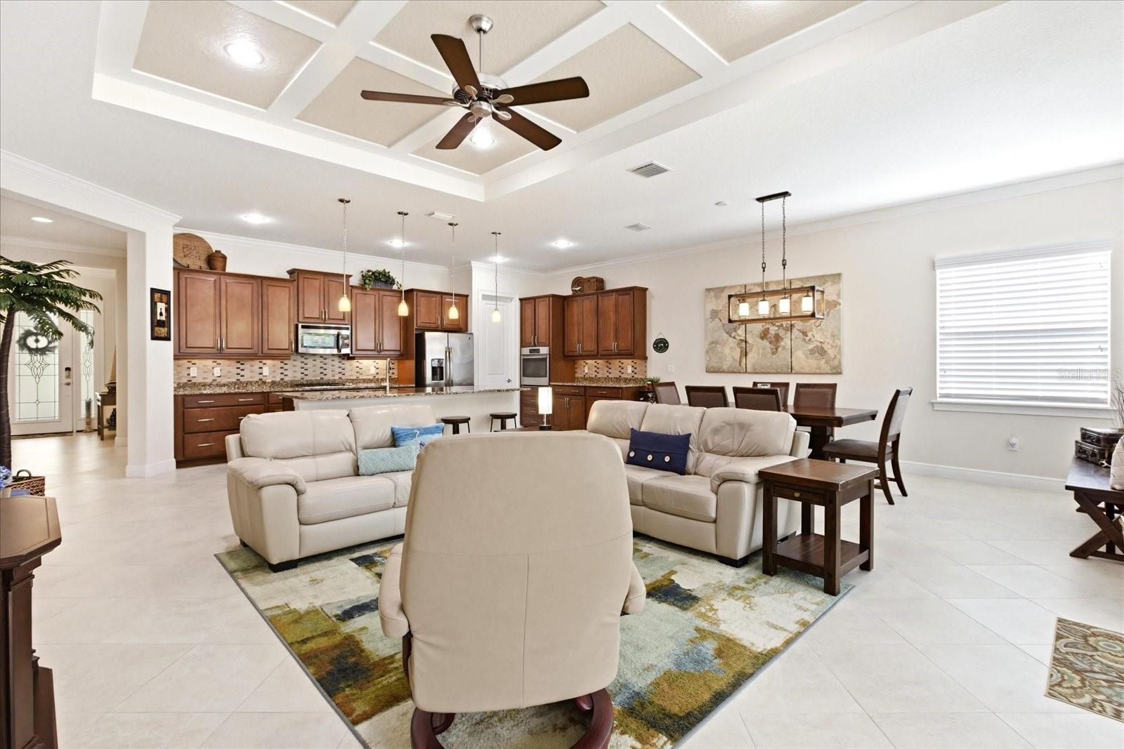 Exceptional Victoria Hills Kolter home, Lantana model, with unobstructed view of the 17th fairway! Welcome to a beautifully updated 2-bedroom plus den with Murphy Bed and office built-ins, 2 baths, and a 2-car garage home, situated on a premium golf course lot. Located in Victoria Park, DeLand, is the area's most sought-after planned community. This move-in-ready home offers natural beauty, comfort, and convenience. From the moment you pull into the paver driveway, you will admire the charm of this Craftsman-style home. The spacious covered front porch is just waiting for a couple of patio chairs to enjoy the peaceful views. Step inside through the elegant glass front door, and you will be impressed by the spacious open concept layout featuring a light and bright great room and separate kitchen and dining areas, the heart and functional center of the home. Neutral 18" ceramic tile on the diagonal, custom blinds, and recessed lighting can be found throughout, with new plush carpet in the bedrooms. The heart of the home is the beautifully updated kitchen with granite counters, a center island large enough for four barstools, solid wood custom cabinetry, gas range, and walk-in pantry, perfect for everyday living and entertaining. The ceilings have crown moldings throughout, with a custom-designed tray ceiling in the great room. The primary suite is a true retreat, offering tray ceilings with a ceiling fan, an updated en-suite bathroom with his and hers vanities, an elegant ceramic tile shower, and a large walk-in closet with ample storage. Wake up and enjoy the tranquil ambiance of this exceptional home. The den has a built-in office with ample file storage, a printer cabinet, a queen Murphy bed, and his and her wardrobes. Relax on the expanded screened lanai with a "picture window" view of the 17th fairway on the award-winning regulation Victoria Hills Golf Course. The indoor laundry room includes a washer, dryer, and utility sink. The 2-car garage features built-in overhead steel storage racks and a pull-down attic stairway. Offering natural beauty, comfort, and convenience, this move-in ready home is perfect for those seeking low-maintenance, elegant living with access to nearby amenities and a welcoming neighborhood atmosphere. Priced to sell! Schedule your showing today.