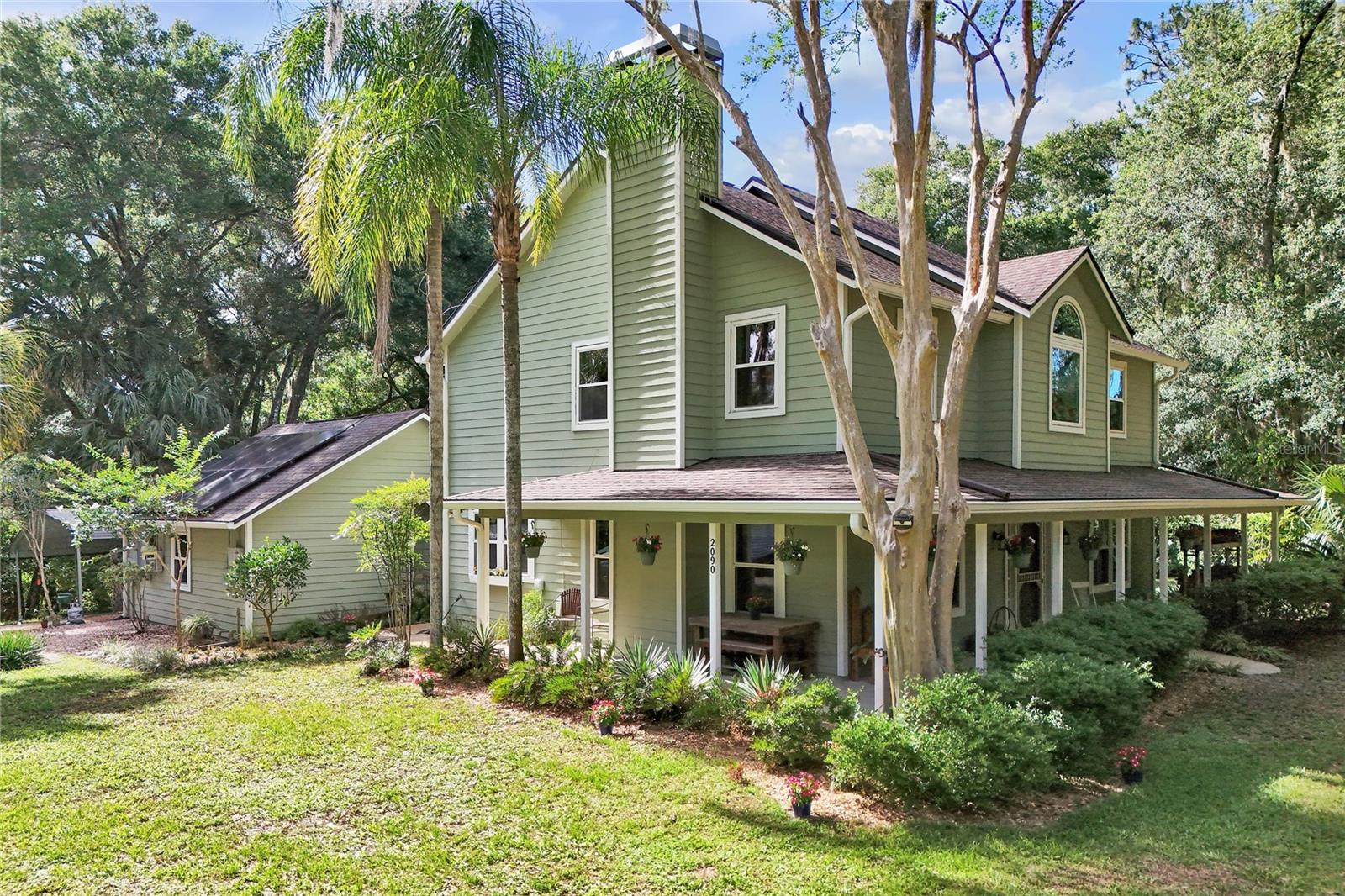 HomeSteader's Dream!!! This charming single-family home offers the perfect blend of country living with modern conveniences, nestled at the end of a private dead-end road. The residence is designed to provide a tranquil and secure lifestyle while being just a short drive from the quaint downtown Deland, known for its unique shops, eateries, and community events. Home is located on 2.83 acres and fully fenced with two double gates allowing ease onto the property. Zoned A4 permits farming and NO HOA. Large garden with watering system is protected by electric fencing. Screened pool provides a relaxing oasis for swimming and lounging, free from insects and debris. Property has it's own private road that leads to electric gate onto the property. Spacious Pole Barn with second floor for off the floor storing can accommodate a variety of uses, making it a valuable asset for rural living and hobbies. Two car garage is air conditioned currently used as workshop and food storage. Two car carport offers additional coverage. Two chicken coops for daily eggs and raising chickens. Two sheds: One for farm supplies, but the other could easily be converted into She/He-Shed. Solar panels provide the home with electricity 24 hours when the grids are down. Good drinking water. The 3 year old extremely high quality, low maintenance 25yr maintenance free ozonation water system provides extremely healthy, oxygenated, bacteria/sulfur free water from every tap in the home. The water system is very unique and provides fantastic (adjustable) water pressure throughout the home as well. The large capacity fully functional (recently cleaned) septic system is the best in the industry, is solid concrete, and in perfect condition. Lush greenery, sloping terrain and year round flowers blooms welcoming to butterflies and hummingbirds. Listing agent is the Seller.