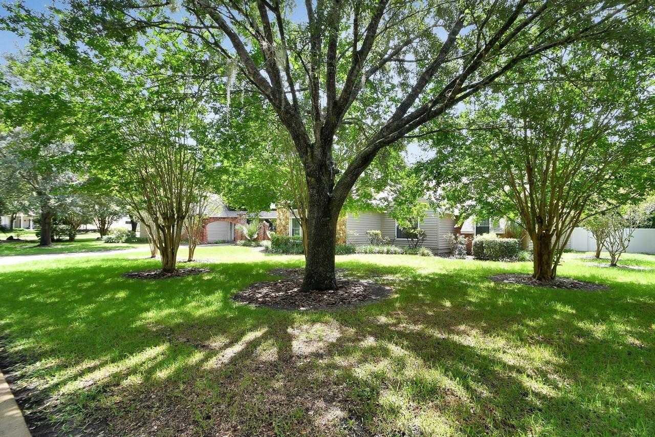 Roof with skylights (2022). This one-of-a-kind custom-built Trails West home exudes European Tudor cottage style charm. Nestled on a sprawling half-acre corner lot in the highly sought-after North DeLand’s Trails West community, this home is surrounded by vibrant, mature landscaping, and fruit trees that enhances its picturesque appeal. Step inside through the inviting foyer, with porcelain wood tile, creates a warm and welcoming first impression. The spacious and light-filled living area immediately captivates with its soaring cathedral ceilings, custom tongue-and-groove detailing, and exposed beams—setting the stage for an exceptional entertainment space. At the heart of the room stands a striking floor-to-ceiling flagstone fireplace, with a cozy bonus space tucked behind it, perfect for a secondary living area or playroom. A recently added spiral staircase leads to a charming loft just behind the fireplace, adding a unique touch to the home’s design. The beautifully updated kitchen features a large island, new recessed lighting, and a cozy breakfast nook with a bay window. Adjacent to the kitchen, the elegant dining area provides easy access to the fully fenced backyard with a gazebo area, ideal for indoor-outdoor gatherings. The current owners transformed the former formal dining room into an additional bedroom by adding doors, you could use it as an office as well. Should you decide to make it a formal dining room again, just remove the doors. This allows you versatility to the layout. The split-floor-plan primary suite is a private retreat, showcasing exquisite tray ceilings and a fully renovated en-suite bath with dual vanities, an expansive walk-in shower, and two spacious walk-in closets. A circular driveway offers convenient access to both the front and back of the home, while the detached two-car garage provides ample parking, storage, and workshop . Updates in 2022, Roof, new vinyl fencing, updated appliances (2022), and replaced electrical panel boxes. This exceptional home seamlessly blends character, modern updates, and an unbeatable location—don’t miss the opportunity to make it yours! You will love the Trails West Community. Community Pool, Clubhouse, Tennis Courts, Pickleball Courts. Beautiful established with oaks lining the drive in. Just 10 minutes to delightful DeLand's downtown area.