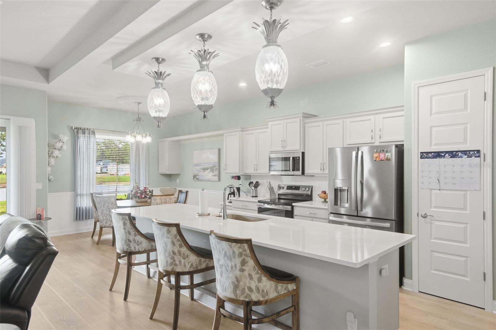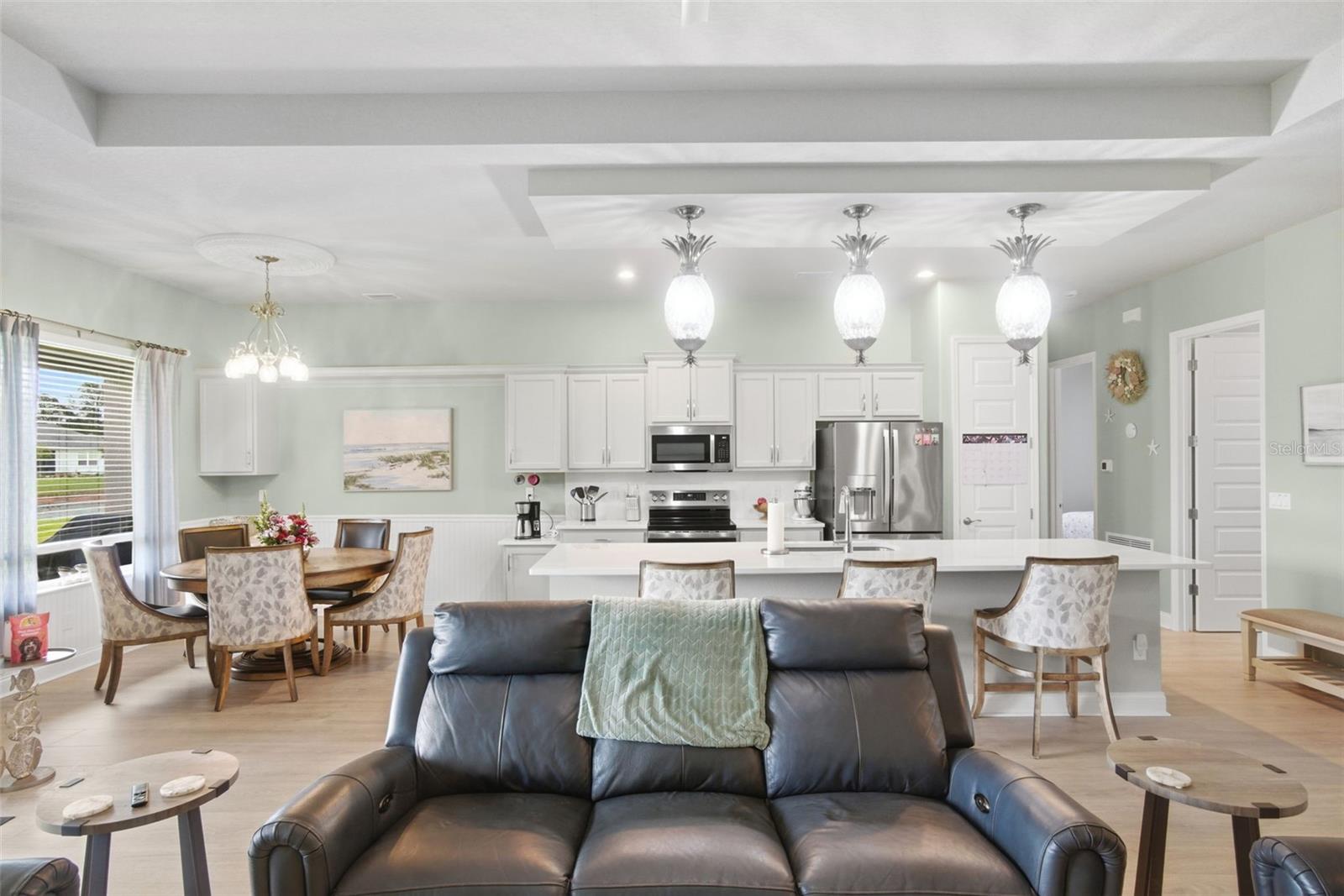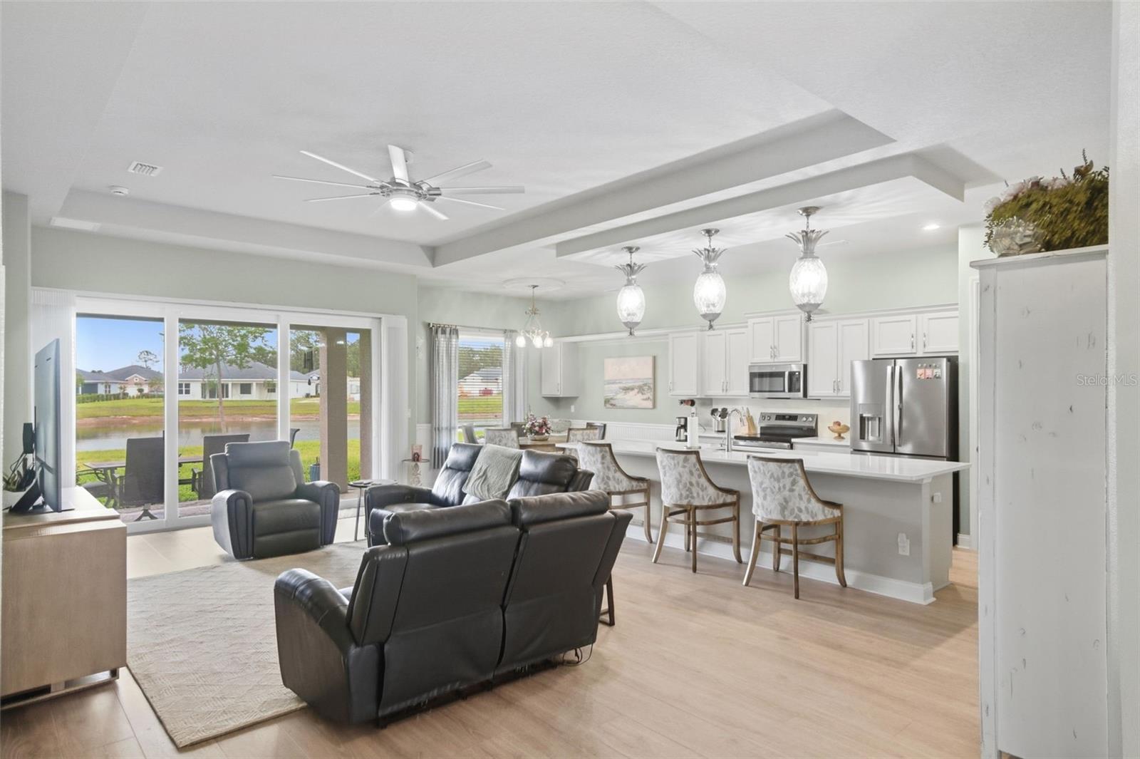 Located in the highly sought-after Reserve at Victoria community in DeLand, this beautifully upgraded Hawthorne II home built by Paytas Homes in 2025 is built with exceptional quality and craftsmanship offering the perfect blend of a modern coastal and energy efficient design. Featuring soaring 10-foot ceilings, an open-concept great room with a tray ceiling, and high-end finishes like Hinkley Plantation lighting throughout, this home is designed for both luxury and entertaining. The included Executive package offers a chef’s kitchen with premium quartz countertops and backsplash with the island spanning 142” long, Wellborn Arlington wood cabinetry, stainless steel appliances including GE Profile 27.9 cu. ft. Smart 4-Door French Door Refrigerator, GE Smart Electric Range No-Preheat Air Fry and convection, double trash pullout and durable Level 3 laminate flooring in the main living space. The DualDrape cordless sheer vertical blinds in the living room let you choose between the calming, soft light of the day, or retreat to the privacy of a darkened room with the turn of a wand. The primary suite is a true retreat, complete with a large walk-in shower and walk in closet. The second bedroom has a private full bathroom ensuite. With three full bathrooms, a dedicated study, and a 3-car garage, this home offers flexibility for families and guests. The GE Profile 4.6 cu. ft. Smart UltraFast Electric Washer and Dryer Combo also conveys with the property. Outside, enjoy the curb appeal of a brick paver driveway and entry, the backyard facing a lovely pond with fountain, and tropical landscaping all set within master-planned community of Paytas and Kolter homes with the HOA including amenities: lawn care, resort pool, pickleball, fitness center and community clubhouse. This home delivers exceptional value and style in one of DeLand’s premier neighborhoods – schedule your private showing today!
