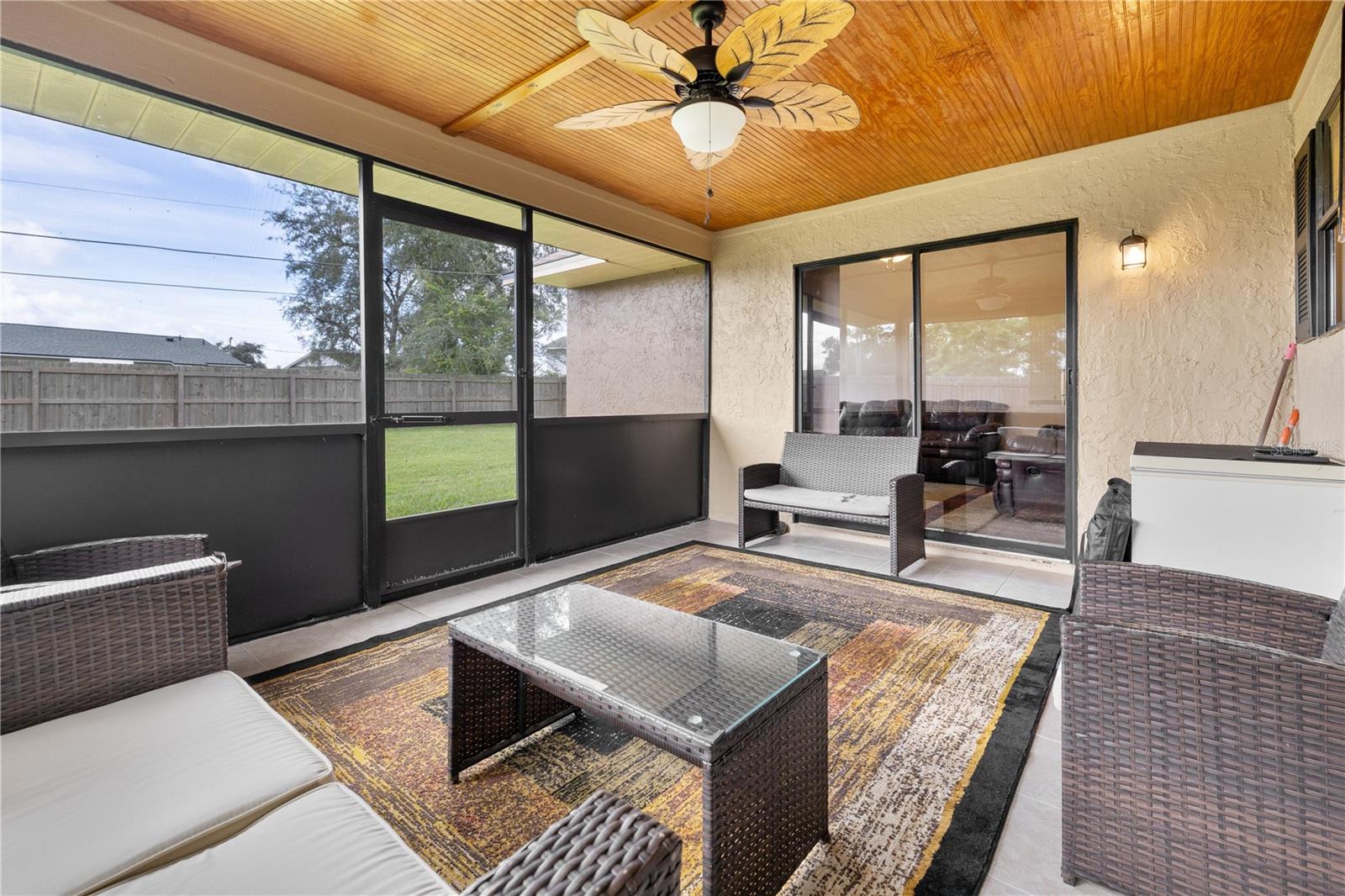 Welcome to this spacious 3 bedroom, 2 bath, 2-car garage home offering a perfect blend of comfort and functionality. Step inside to find vaulted knock-down ceilings, ceiling fans, and tile flooring throughout for easy maintenance and a fresh, airy feel. The home features a formal living and dining area plus a central kitchen overlooking the family room, complete with stainless steel appliances, breakfast bar, and ample cabinetry—ideal for everyday living and entertaining. Cozy up by the wood-burning fireplace surrounded by built-ins or enjoy the convenience of an indoor laundry room and working intercom system. The primary suite offers a relaxing retreat with a jetted tub, raised vanity, and dual sinks. Other notable features include an owned security system, exterior flood lights, attic stairs with automatic lighting, and a termite bond for peace of mind. Step outside to your oversized, fully fenced yard and unwind on the large screened lanai, perfect for enjoying Florida’s weather year-round. Freshly painted in a neutral color palette with a roof only 1.5 years old, this home is truly move-in ready.