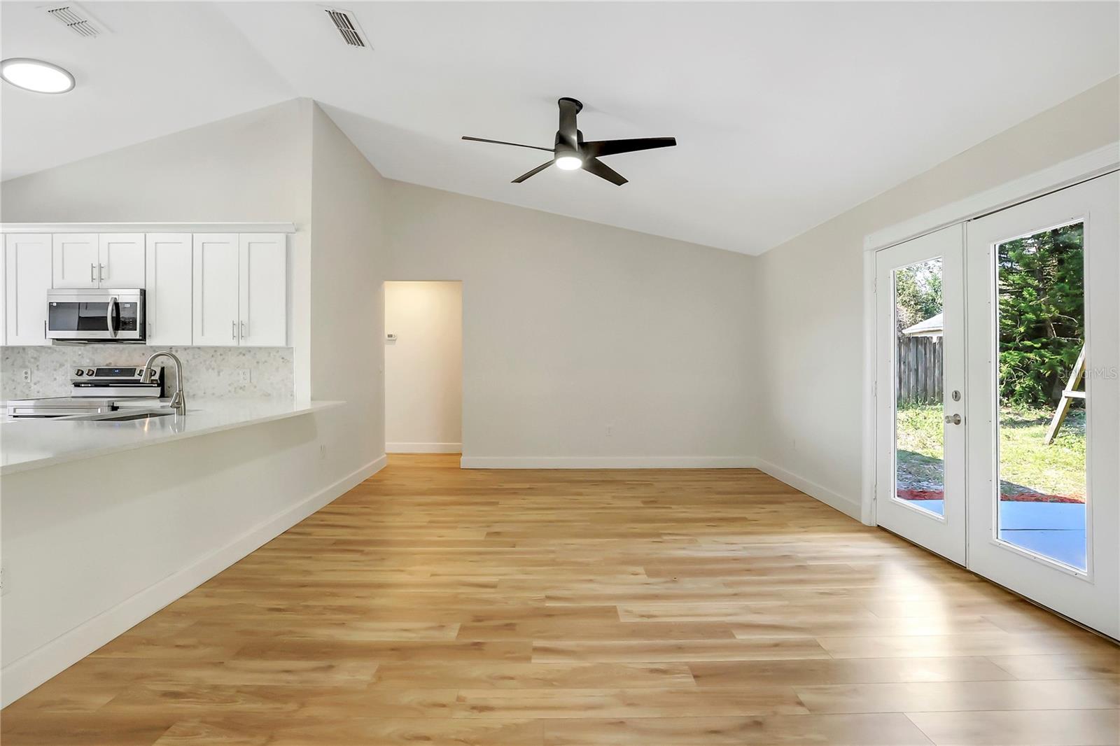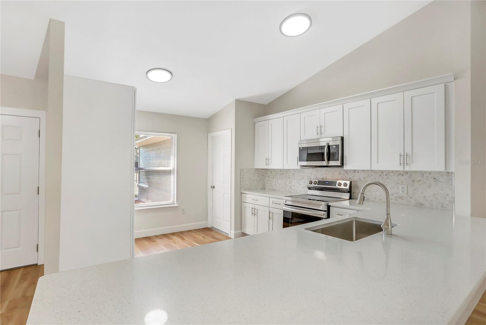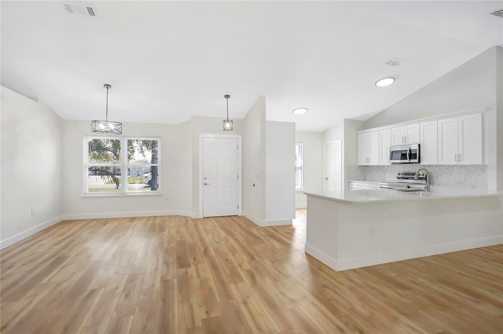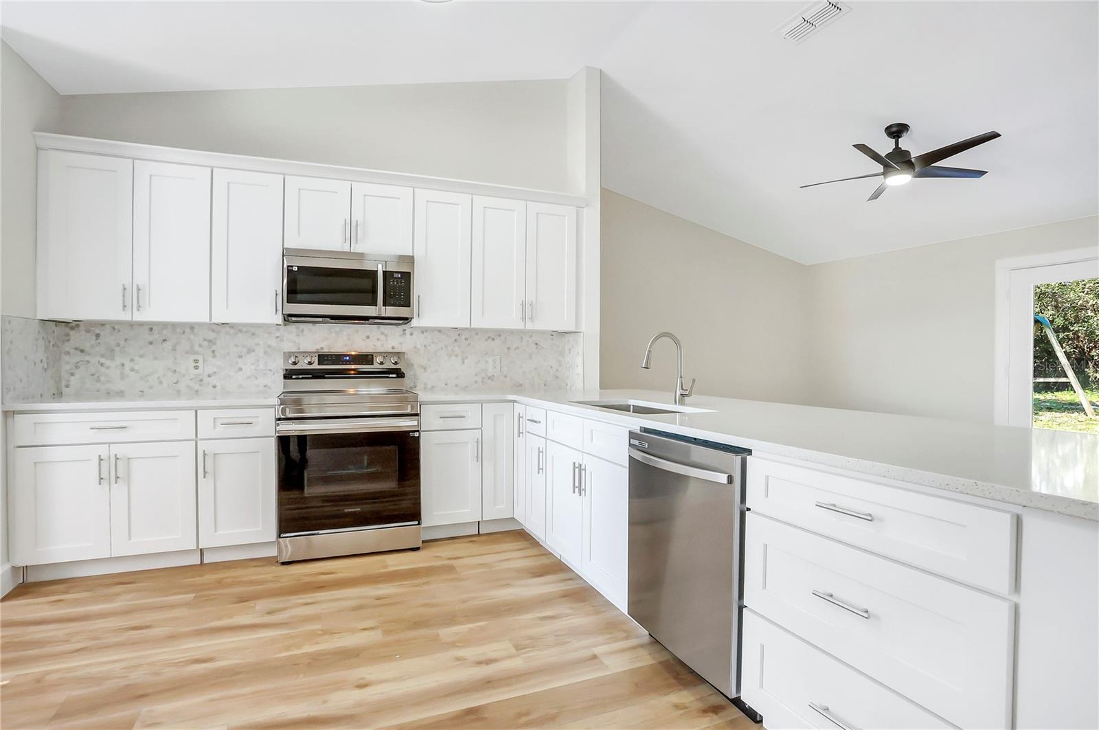 PRICE IMPROVEMENT! This fully renovated Deltona home is a perfect blend of modern elegance and comfort. The open floor plan is enhanced by luxury vinyl flooring throughout, creating a seamless and designer look. A custom-designed kitchen features sleek shaker cabinets, quartz countertops, and brand-new stainless steel appliances, large peninsula with bar seating, making it a true chef’s delight. The bathrooms have been beautifully remodeled with porcelain-tiled showers, new quartz vanities, and updated plumbing fixtures. New light fixtures add warmth and sophistication, while a brand-new December of 2024 roof provides lasting durability. The A/C system was updated in December-2024, and the windows were replaced in 2011 for added efficiency. Located near beautiful natural springs, scenic parks, and just a short drive from top Florida destinations, this home offers the best of both relaxation and adventure. New Smyrna Beach is just 30 minutes away, while Walt Disney World is only 45 minutes. Convenient access to I-4 makes commuting easy, connecting you to Daytona Beach, Orlando, and beyond. This property has NO HOA and is turn-key, ready for your family. Schedule your showing today!