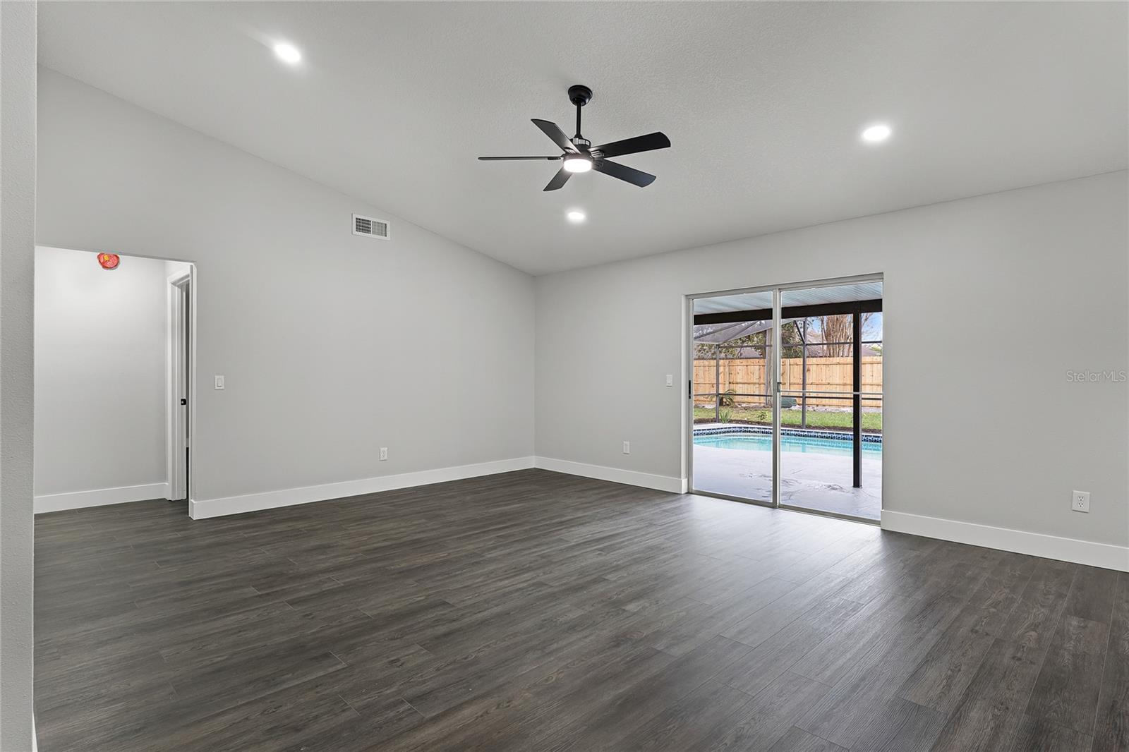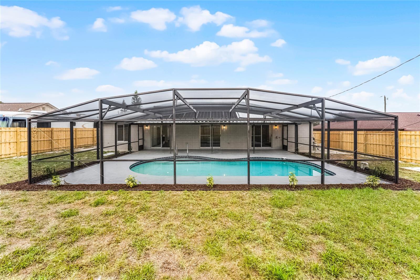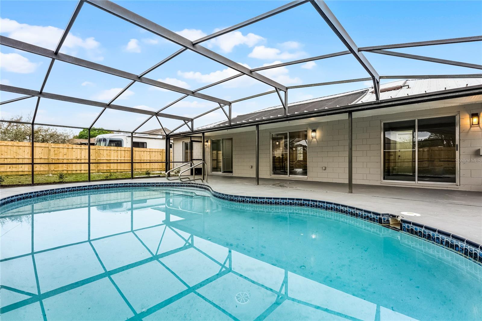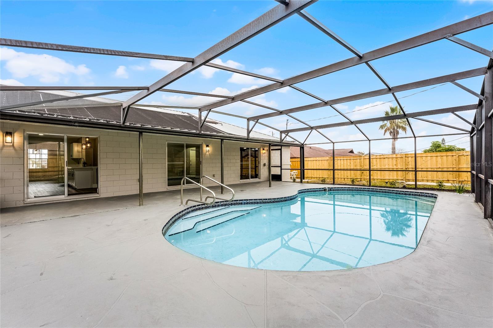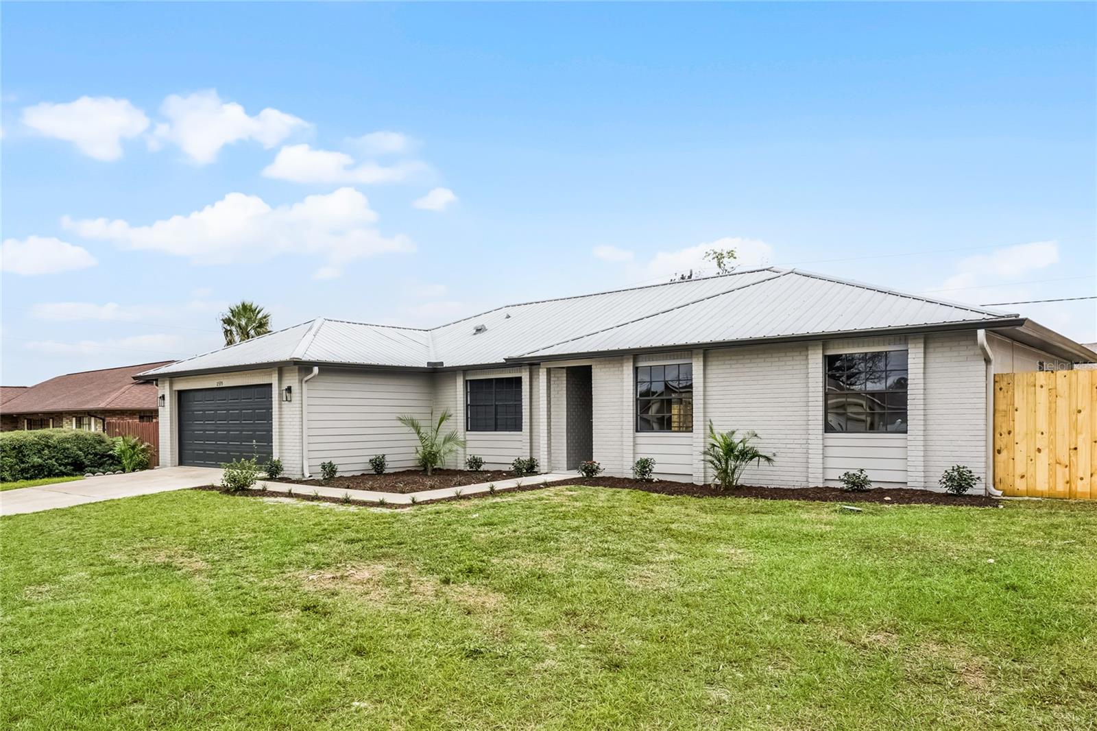 Stunningly Renovated Pool Home in Deltona Lakes! This beautifully upgraded home is designed for comfort, style, and entertaining. The spacious great room features expansive sliding patio doors that provide a breathtaking view of the sparkling pool, creating a seamless flow between indoor and outdoor living. The modern, open-concept kitchen is perfect for cooking and socializing, with easy access to the living room and direct sliding door access to the lanai and pool enclosure. Whether you’re relaxing by the pool or hosting family gatherings, this home offers the perfect space. The formal dining room provides ample space for hosting dinner parties, holidays, and celebrations. The kitchen also offers room for a cozy dinette table, while the large peninsula comfortably accommodates barstools for casual meals or chatting with guests. The serene primary bedroom is a private retreat, overlooking the pool and fenced backyard. It includes a spacious walk-in closet and a luxurious primary bathroom. The opposite side of the home, two additional bedrooms, serviced by a beautifully appointed guest bathroom. The fourth bedroom, located at the front of the home with double doors, is versatile enough to serve as a home office, den, or a guest bedroom. The expansive garage is an added bonus, complete with a washer and dryer, laundry tub, side door to the yard, and plenty of space for parking and storage. Upgrades & Renovations: This home boasts numerous upgrades, including a durable metal roof, brand new AC system with warranty, and all-new stainless steel appliances. The plumbing and electrical systems have been updated, and the entire home has been refreshed with new textures, interior and exterior paint, new 5.5 inch solid wood baseboards, and luxury waterproof vinyl plank flooring throughout. The kitchen features solid wood cabinets with quartz countertops, and the bathrooms have been updated with stylish vanities. Ceiling fans in every room, a new privacy wood fence, and fresh landscaping round out this move-in ready home. This property is a true gem and an ideal place to create lasting memories with your family. Don’t miss out—schedule a tour today!
