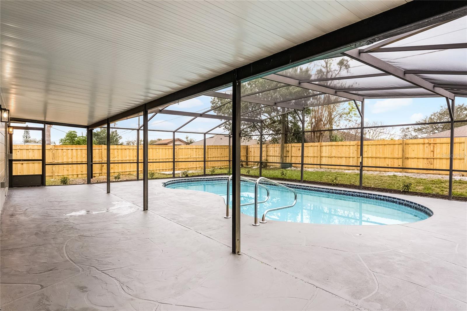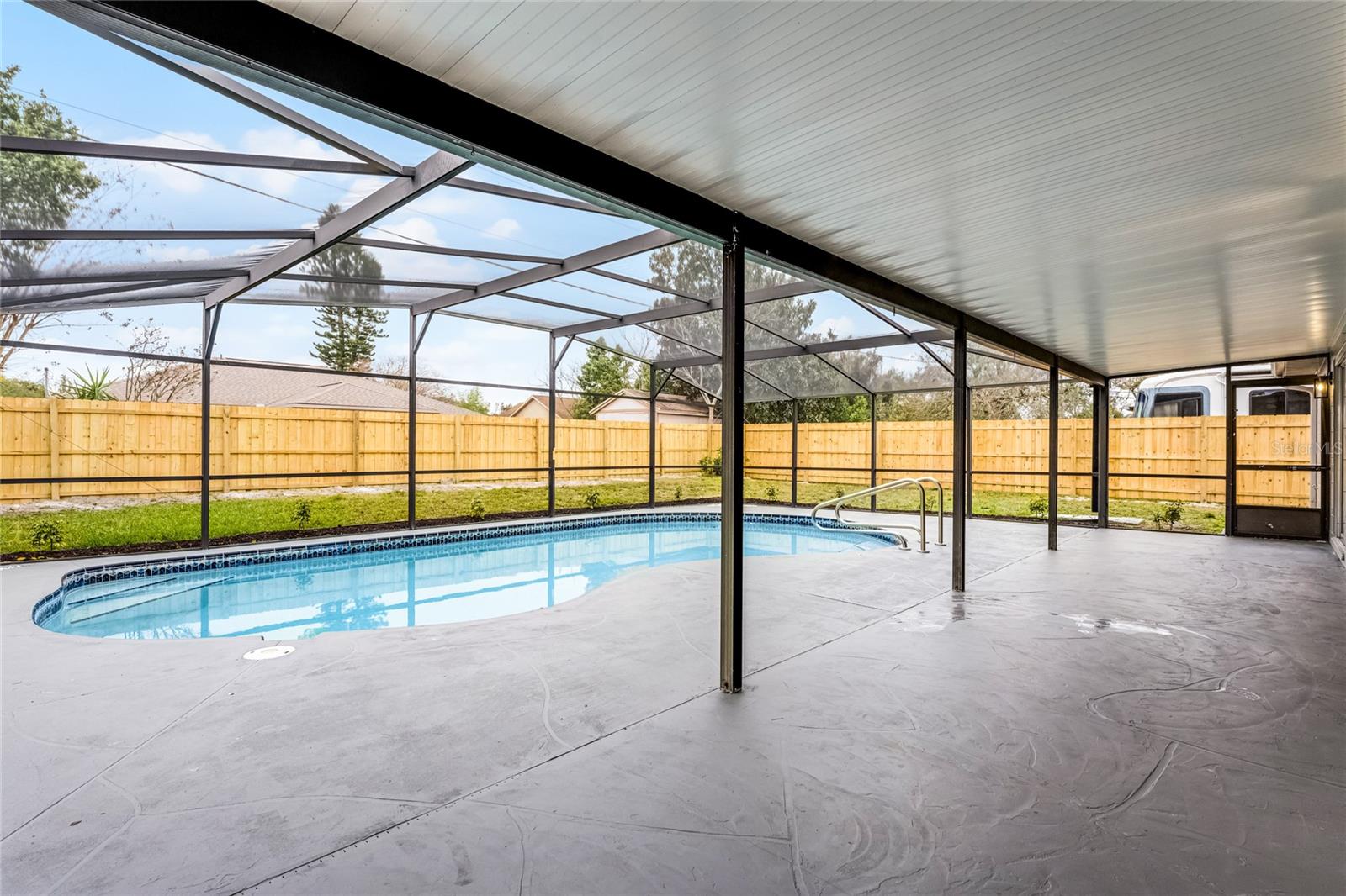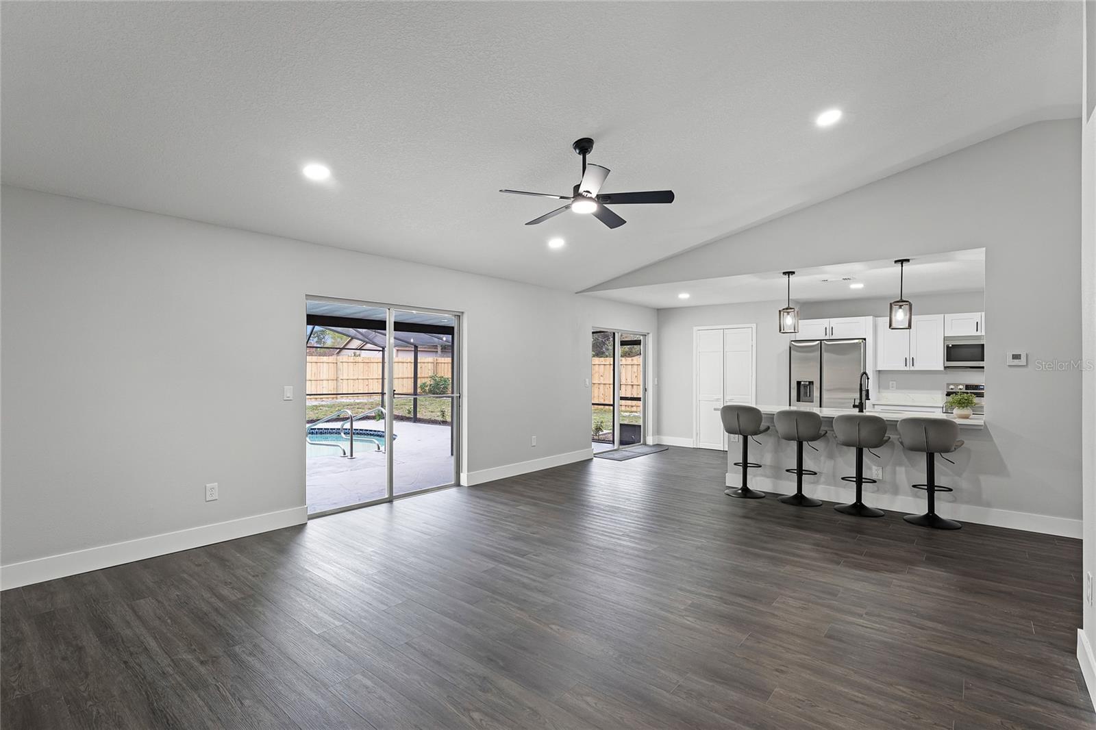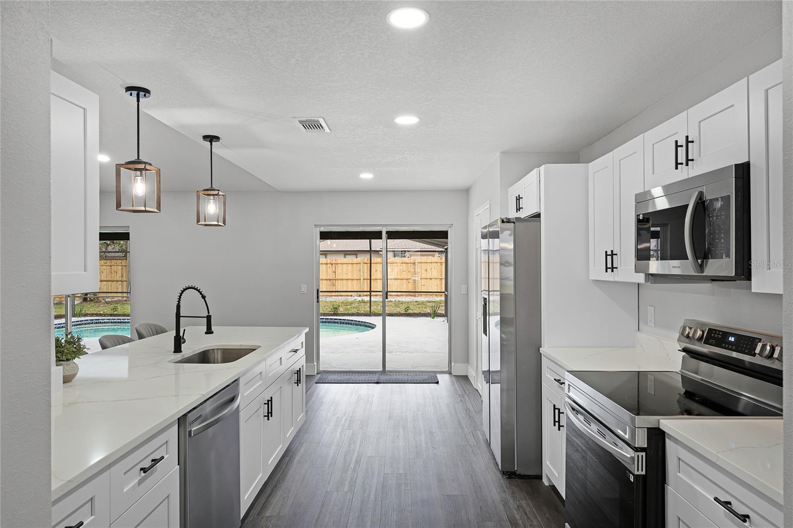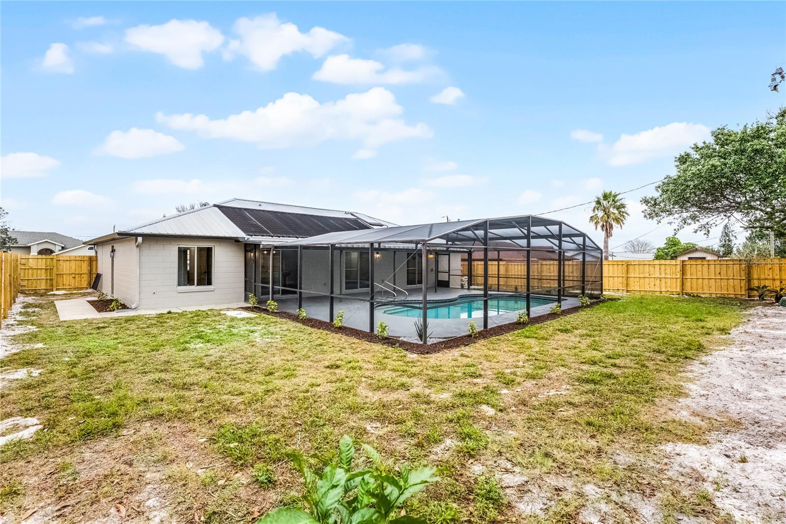 Stunningly Renovated Pool Home in Deltona Lakes! This beautifully upgraded home is designed for comfort, style, and entertaining. The spacious great room features expansive sliding patio doors that provide a breathtaking view of the sparkling pool, creating a seamless flow between indoor and outdoor living. The modern, open-concept kitchen is perfect for cooking and socializing, with easy access to the living room and direct sliding door access to the lanai and pool enclosure. Whether you’re relaxing by the pool or hosting family gatherings, this home offers the perfect space. The formal dining room provides ample space for hosting dinner parties, holidays, and celebrations. The kitchen also offers room for a cozy dinette table, while the large peninsula comfortably accommodates barstools for casual meals or chatting with guests. The serene primary bedroom is a private retreat, overlooking the pool and fenced backyard. It includes a spacious walk-in closet and a luxurious primary bathroom. The opposite side of the home, two additional bedrooms, serviced by a beautifully appointed guest bathroom. The fourth bedroom, located at the front of the home with double doors, is versatile enough to serve as a home office, den, or a guest bedroom. The expansive garage is an added bonus, complete with a washer and dryer, laundry tub, side door to the yard, and plenty of space for parking and storage. Upgrades & Renovations: This home boasts numerous upgrades, including a durable metal roof, brand new AC system with warranty, and all-new stainless steel appliances. The plumbing and electrical systems have been updated, and the entire home has been refreshed with new textures, interior and exterior paint, new 5.5 inch solid wood baseboards, and luxury waterproof vinyl plank flooring throughout. The kitchen features solid wood cabinets with quartz countertops, and the bathrooms have been updated with stylish vanities. Ceiling fans in every room, a new privacy wood fence, and fresh landscaping round out this move-in ready home. This property is a true gem and an ideal place to create lasting memories with your family. Don’t miss out—schedule a tour today!