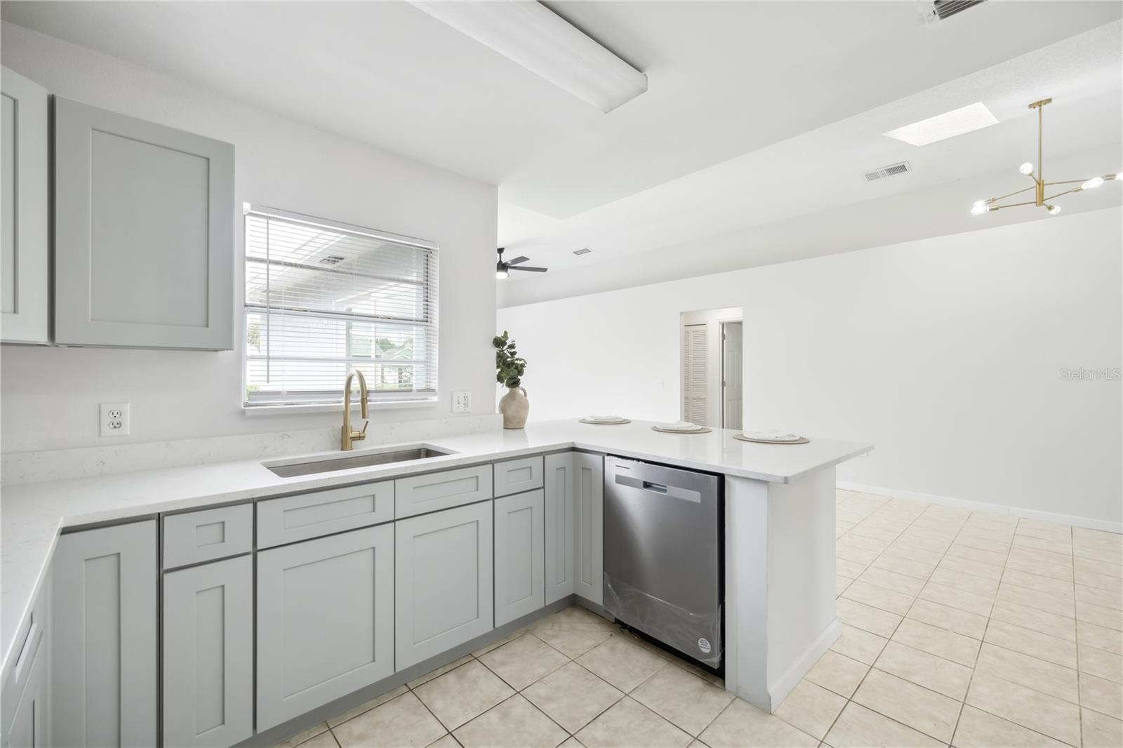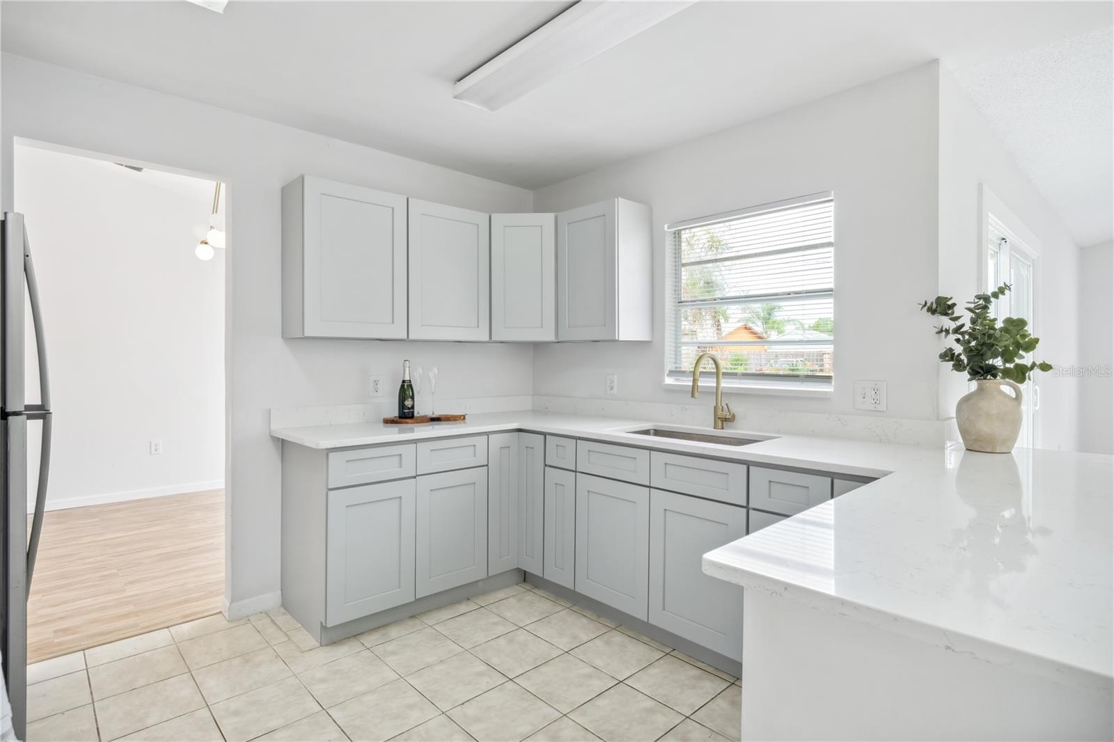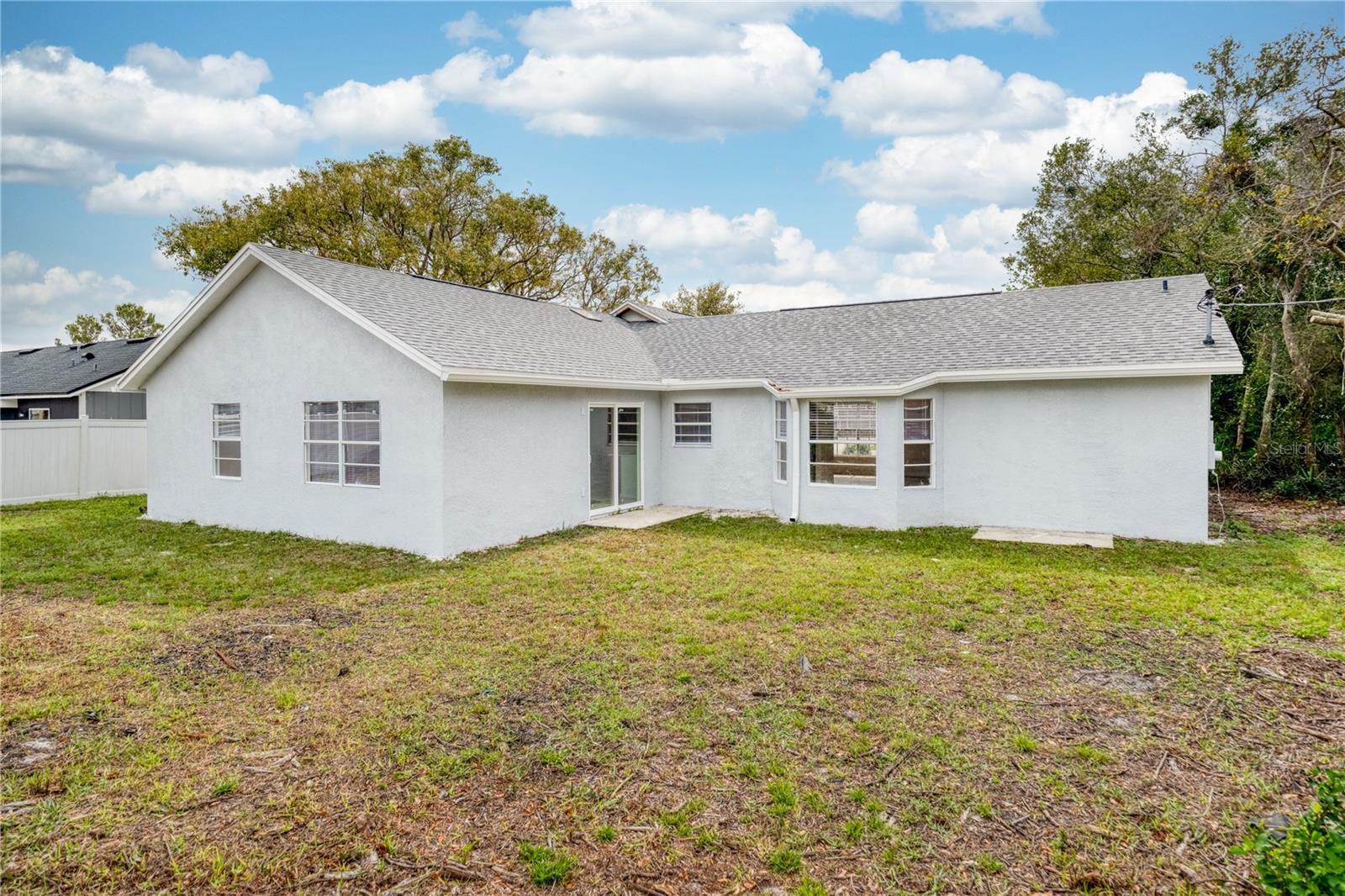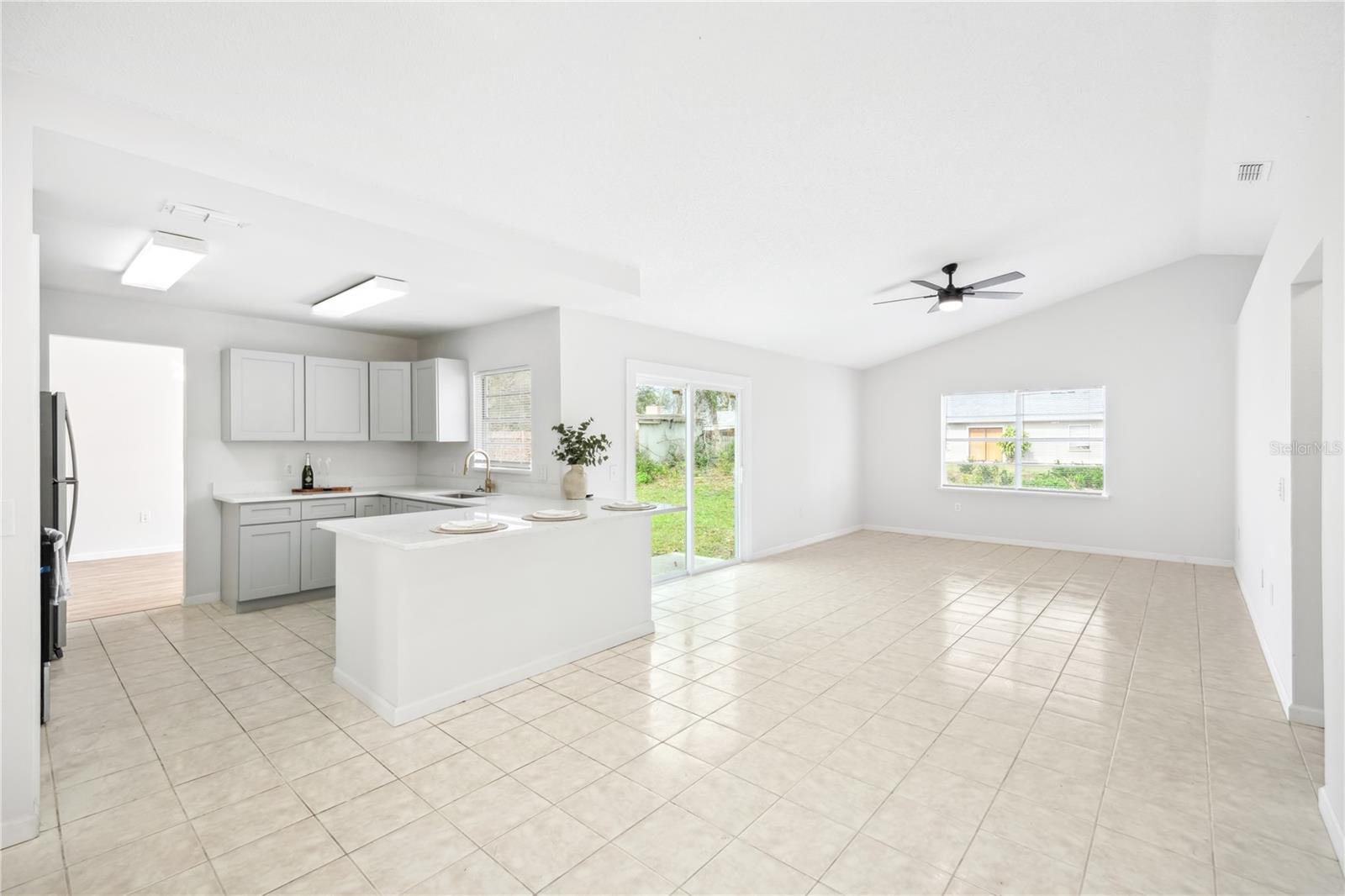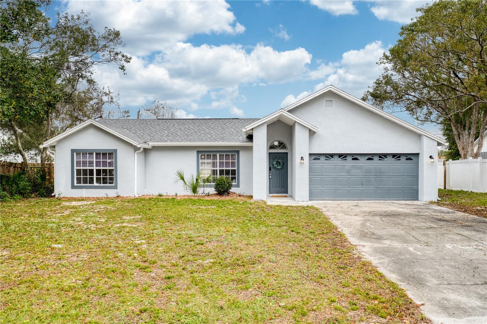 Welcome to this stunning move-in ready 3-bed, 2-bath home, thoughtfully updated with a New Roof (2023), New HVAC (2023), New water Heater (2024), New Washer & Dryer, New Flooring, and a completely Remodeled Kitchen (2024) featuring elegant shaker cabinets, quartz countertops, and brand-new appliances. Step inside to a spacious entryway leading to bright formal living and dining areas. The open-concept kitchen, complete with bar seating and an eat-in nook, flows seamlessly into the vaulted-ceiling family room with access to the large backyard. The split floor plan offers privacy, with a generous primary suite featuring a new double vanity, a soaking tub, separate shower, and walk-in closet. The two additional bedrooms are both great sizes and share an updated bathroom. Ideally located just 35 minutes to New Smyrna Beach, 20 minutes to Deland, and 30 minutes to Sanford, this beautifully renovated home is a must-see. Schedule your tour today!