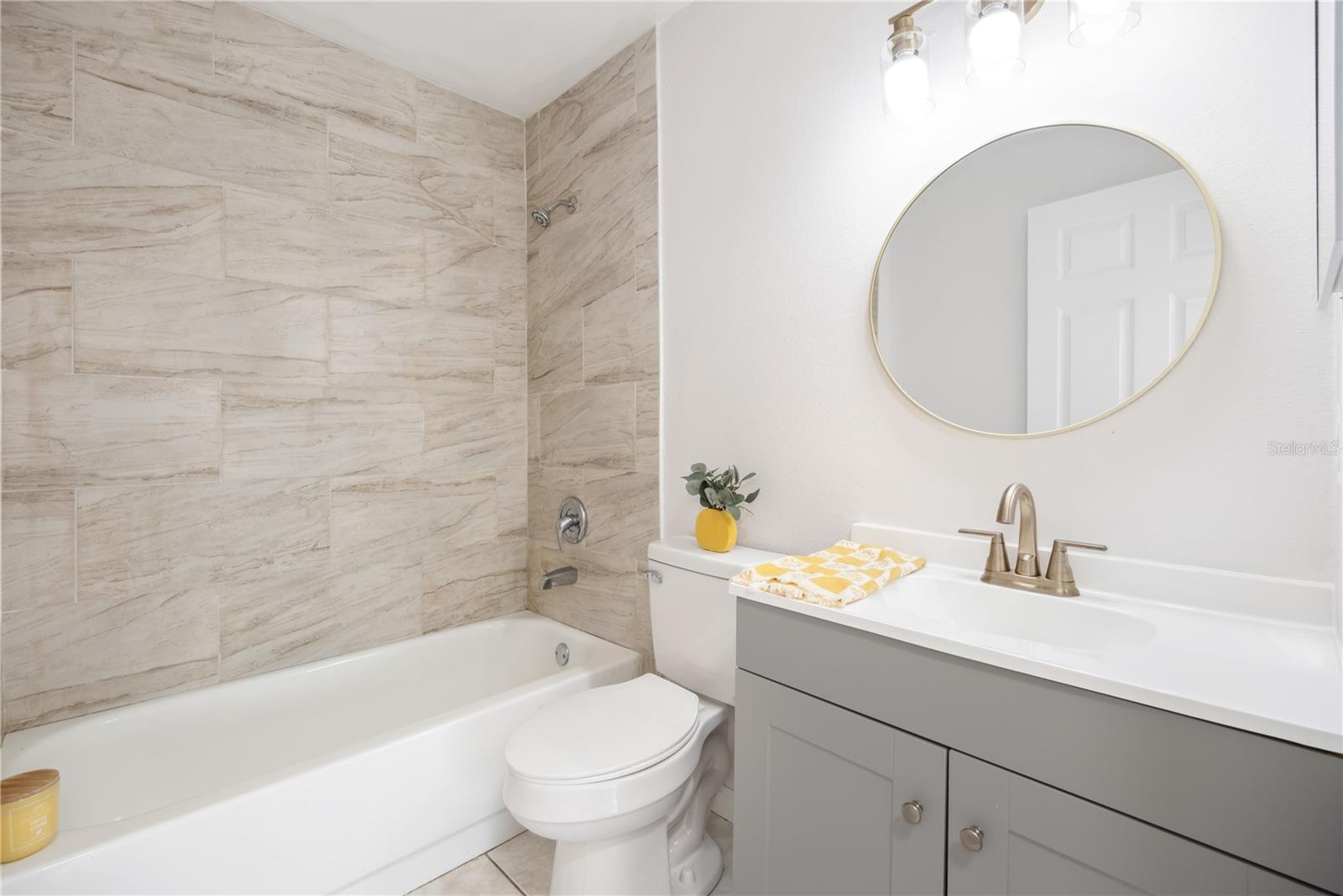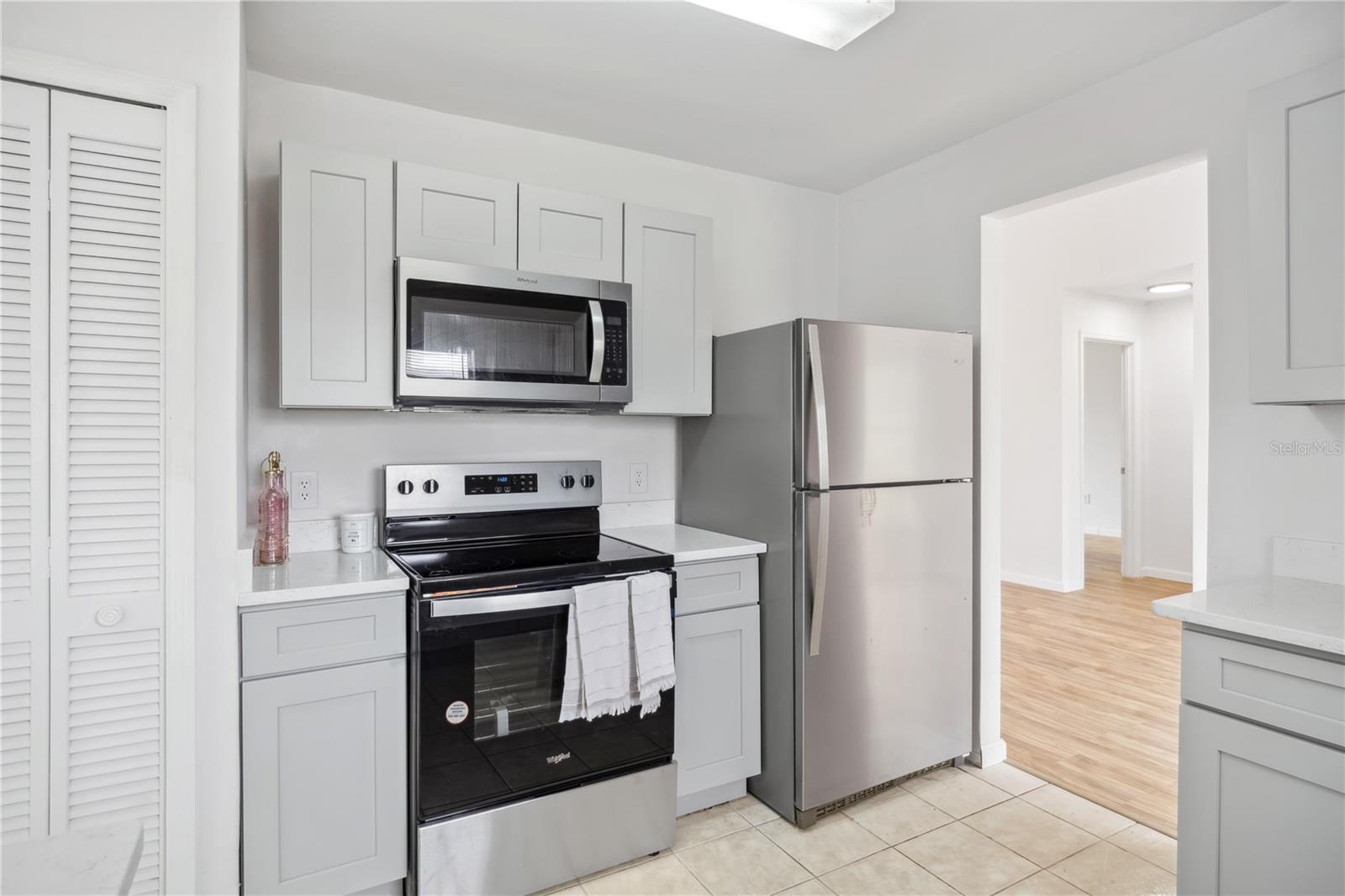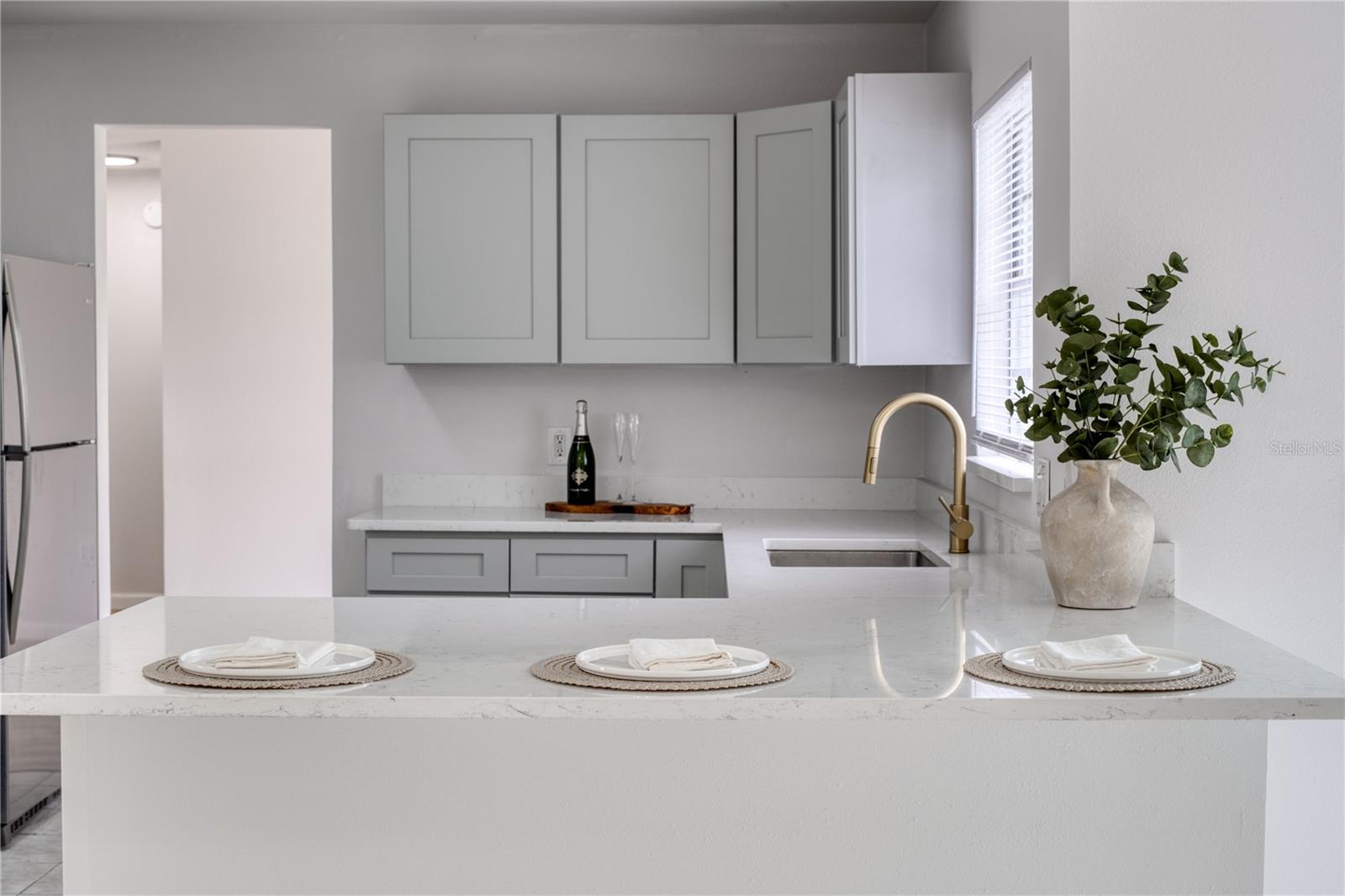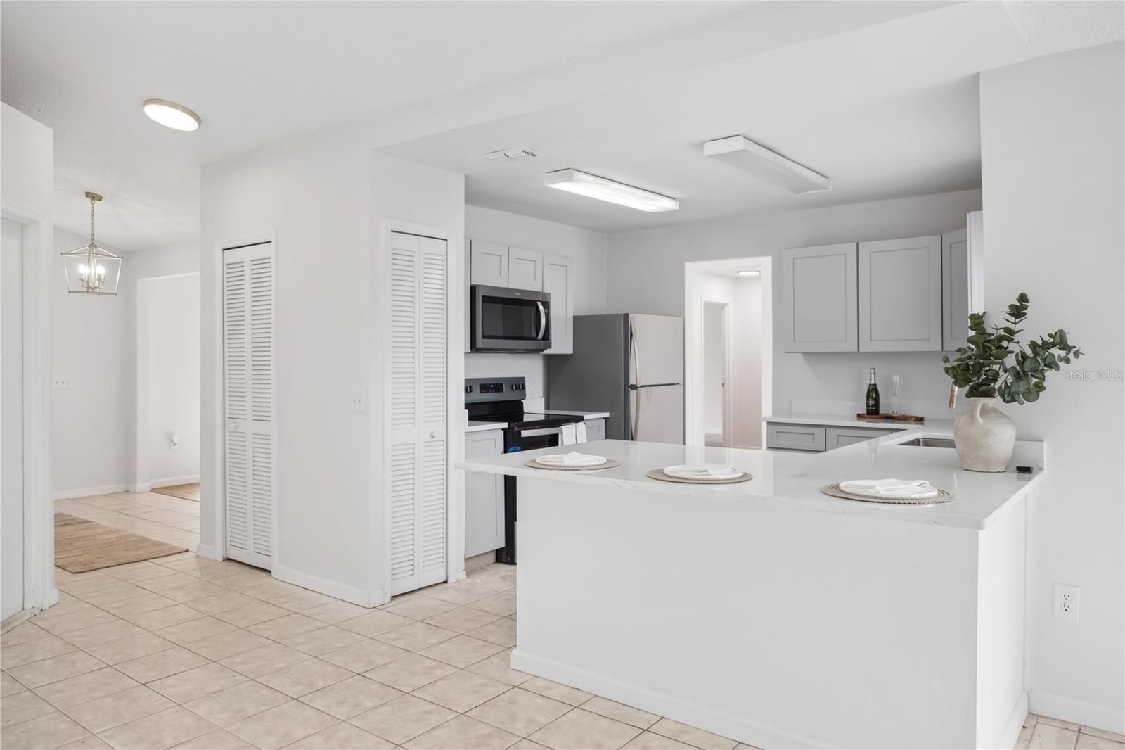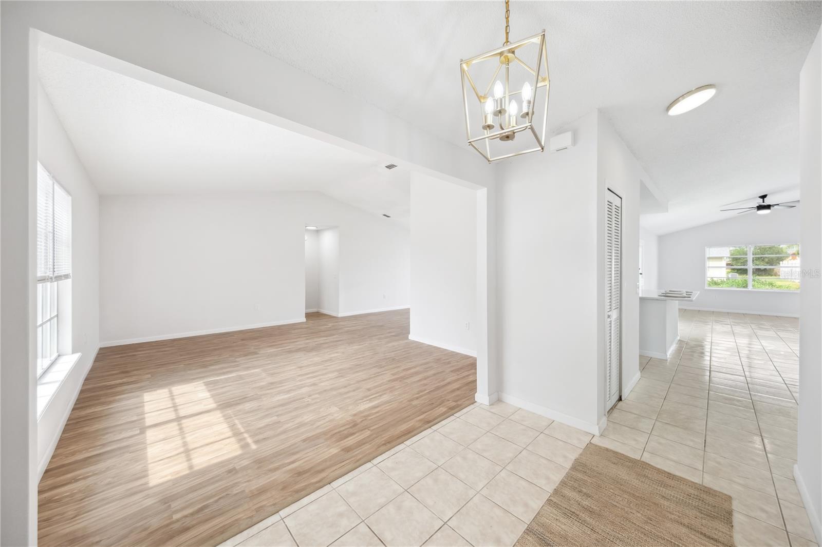 Welcome to this stunning move-in ready 3-bed, 2-bath home, thoughtfully updated with a New Roof (2023), New HVAC (2023), New water Heater (2024), New Washer & Dryer, New Flooring, and a completely Remodeled Kitchen (2024) featuring elegant shaker cabinets, quartz countertops, and brand-new appliances. Step inside to a spacious entryway leading to bright formal living and dining areas. The open-concept kitchen, complete with bar seating and an eat-in nook, flows seamlessly into the vaulted-ceiling family room with access to the large backyard. The split floor plan offers privacy, with a generous primary suite featuring a new double vanity, a soaking tub, separate shower, and walk-in closet. The two additional bedrooms are both great sizes and share an updated bathroom. Ideally located just 35 minutes to New Smyrna Beach, 20 minutes to Deland, and 30 minutes to Sanford, this beautifully renovated home is a must-see. Schedule your tour today!