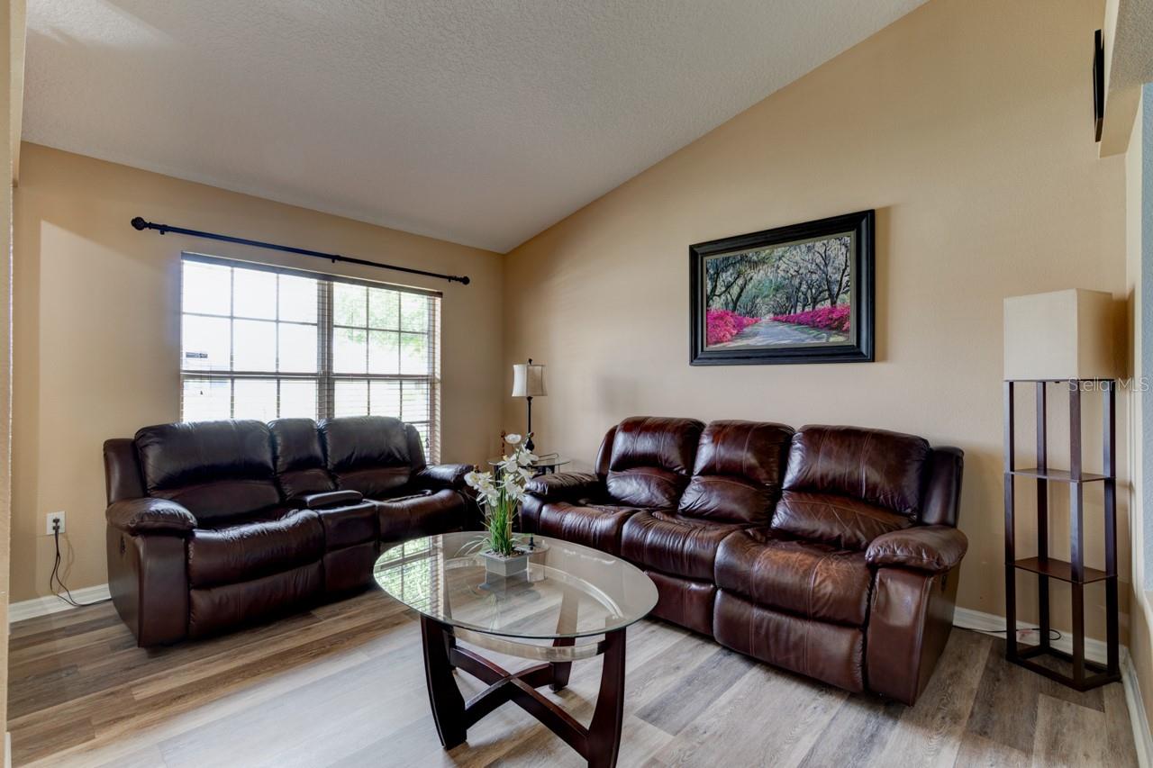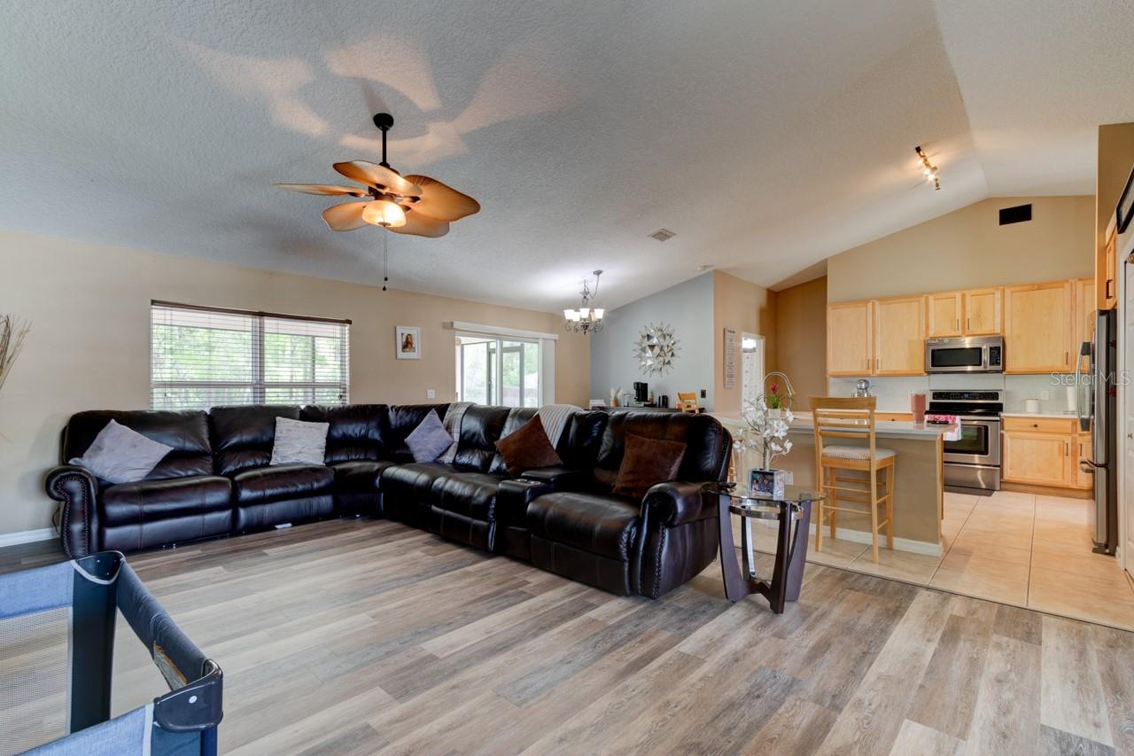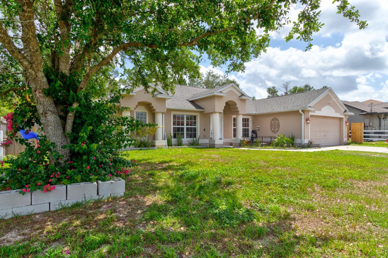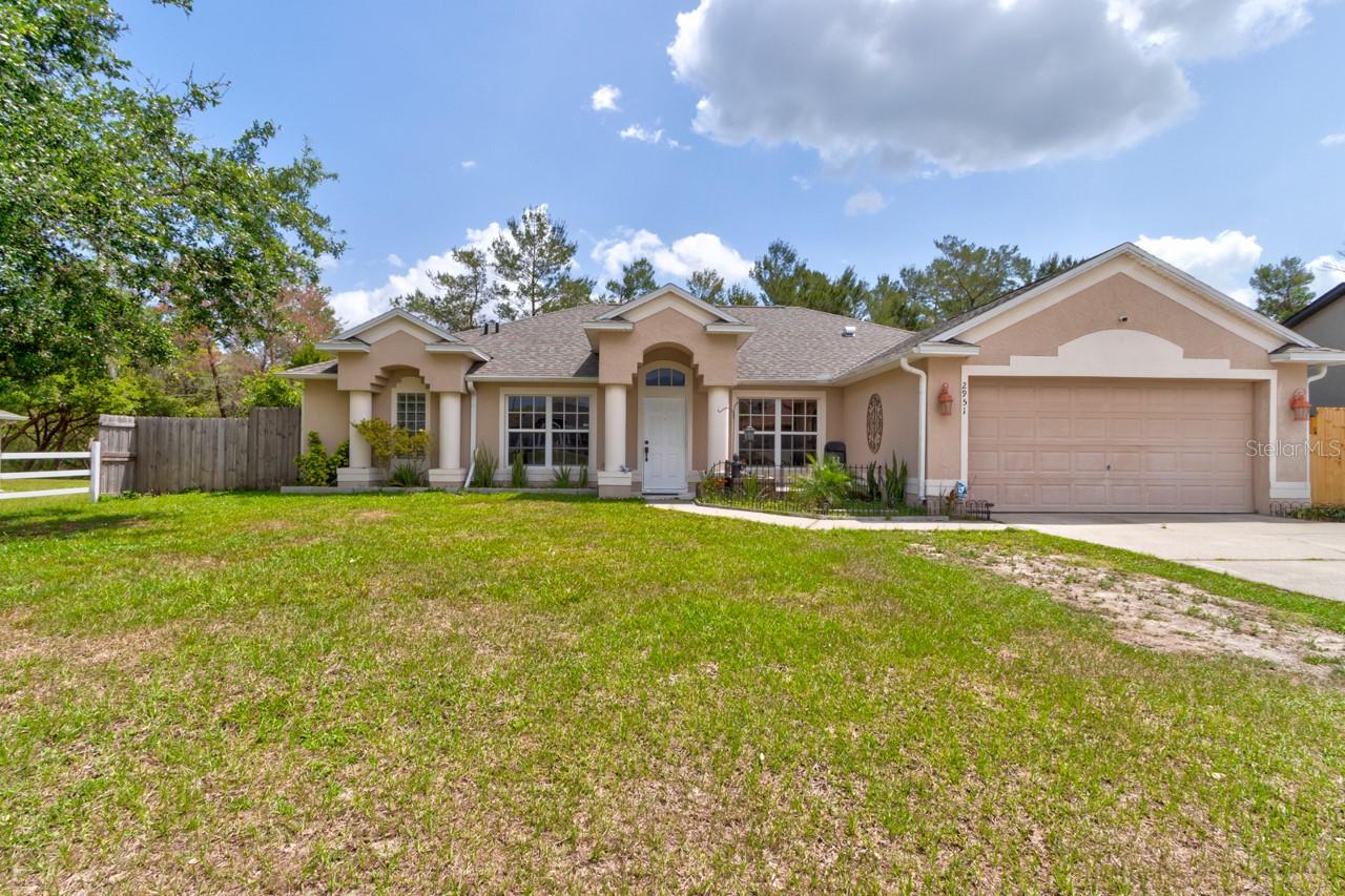 Buyers financing fell through, back on the market !! Welcome to this beautifully maintained 3-bedroom, 2-bath, 2 car garage, single-family home located in the desirable Deltona Lakes community. As you step inside, you’ll be greeted by soaring vaulted 14-foot ceilings that create a bright and spacious atmosphere. To your left you’ll find a formal living room and to your right is a separate formal dining area—perfect for entertaining. The heart of the home is the spacious family room, which flows seamlessly into the kitchen. The kitchen features elegant quartz countertops, stainless steel appliances, ample cabinet storage, and generous counter space. There’s also a cozy dinette area for casual meals, which opens out to the back patio and backyard. The home’s open, split floor plan offers privacy and functionality. The spacious primary suite includes sliding glass doors that lead to the backyard, filling the room with natural light. The en-suite bathroom boasts dual quartz vanities, a soaking tub, a separate walk-in shower, and a private water closet. On the opposite side of the home, you'll find two additional bedrooms and a full bathroom—perfect for guests or family members. A separate laundry room with washer and dryer, conveys with the house. Enjoy outdoor living in the expansive backyard, complete with a fire pit and plenty of space for gatherings. Recent updates include: Brand-new roof installed in January 2025 Water heater and AC unit installed in 2017 Septic system (located in the front yard) pumped in 2024 This home has been lovingly cared for, and the owner takes pride in its upkeep. Don’t miss the opportunity to make it yours!