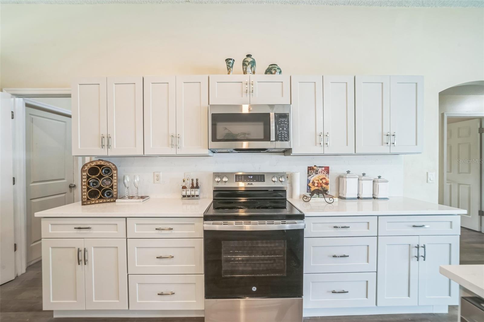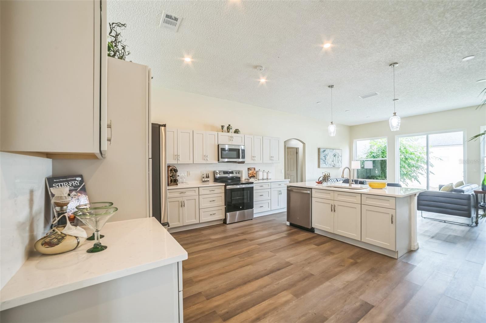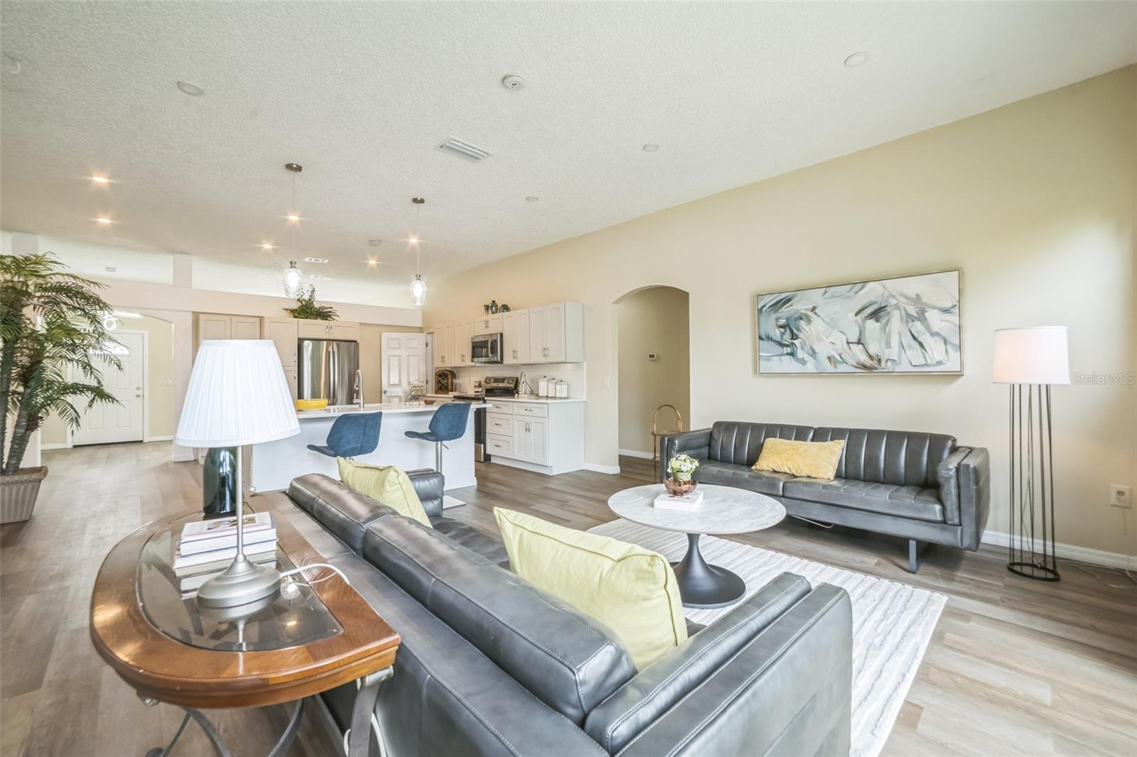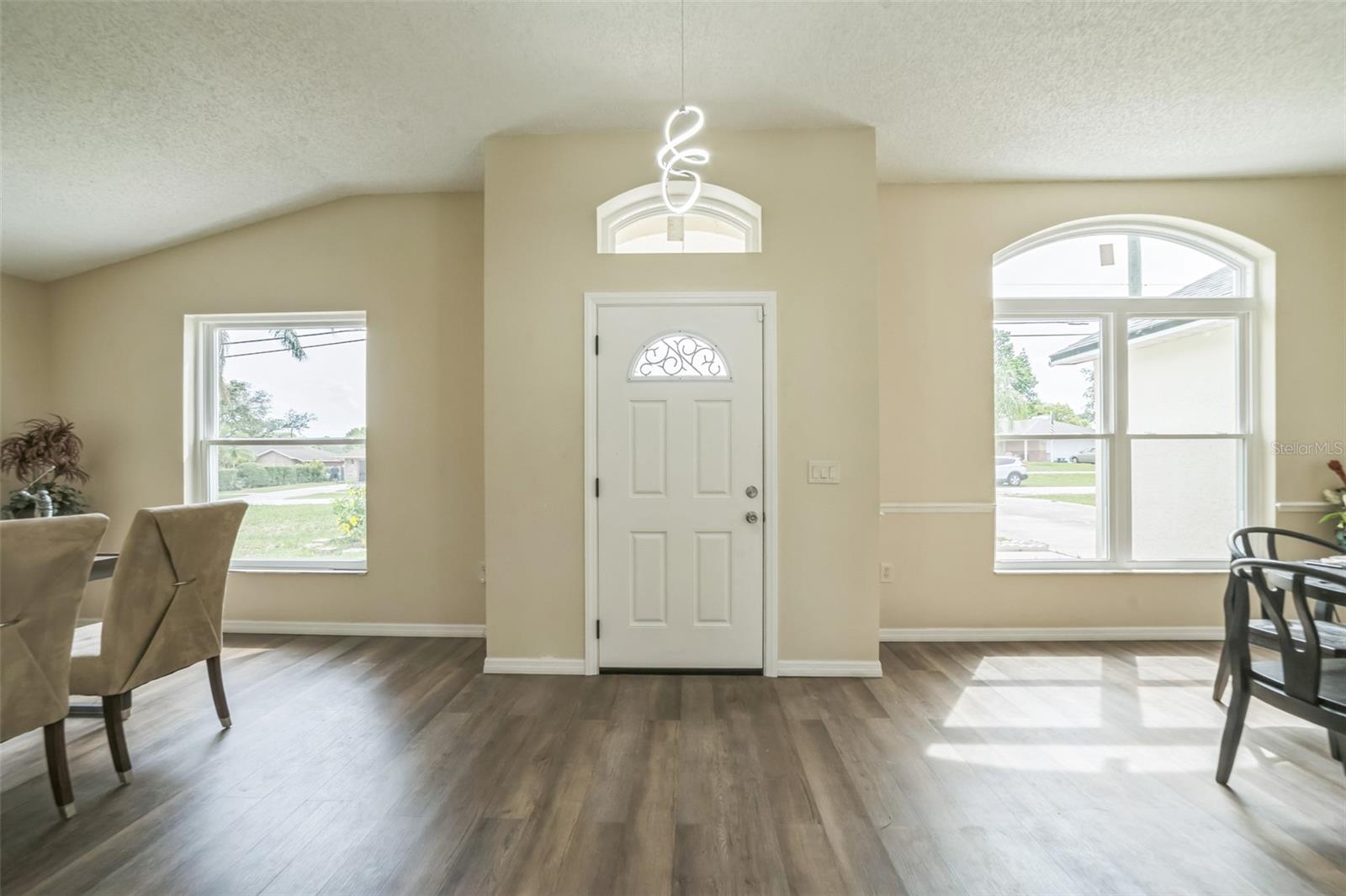 <<<"MOTIVATED SELLER"!!!! Seller concessions towards buyers closing cost.>>> Absolutely Gorgeous!!! This newly upgraded 4 bedroom 2 bathroom home is located in Deltona Lakes and is awaiting it's new owner. All you need to do is move in and enjoy the comfort and space this home has for you. The elegant features of this home boast a formal living and dining room as you enter through the front door. The dining room has chair rails that defines this room from all the others in the rest of the house. The floor has waterproof vinyl throughout the home with the exception of the bathrooms which has porcelain tiles both in the primary and second bathrooms. The primary bathroom has a porcelain tiled shower with frameless glass surround and a hinged shower glass door that swings in and out of the shower for ease of access into the shower. A jacuzzi tub with porcelain surround tiles invites you for a tranquil bath and total relaxation. LED lights are hung above both vanities (his and hers) and a recessed light is added lighting over the jacuzzi tub. The primary bedroom has two walk-in closets (him and hers). The kitchen is totally upgraded with quartz countertops and backsplash and custom made cupboards and cabinets with brush nickel handles. The kitchen is equipped with stainless steel appliances (refrigerator, stove, microwave, and dishwasher) and an island with quartz countertop, stainless steel sink, and brushed nickel kitchen faucet. The island can sit three to four bar stools and defines the kitchen from the family room. Two pendulum lights hangs over the island for additional lighting. All windows throughout the home are brand new double hung windows and the roof is brand new!!! The HVAC system was installed May, 2017. Don't miss out on this one, so bring your buyers. They will love it!!!