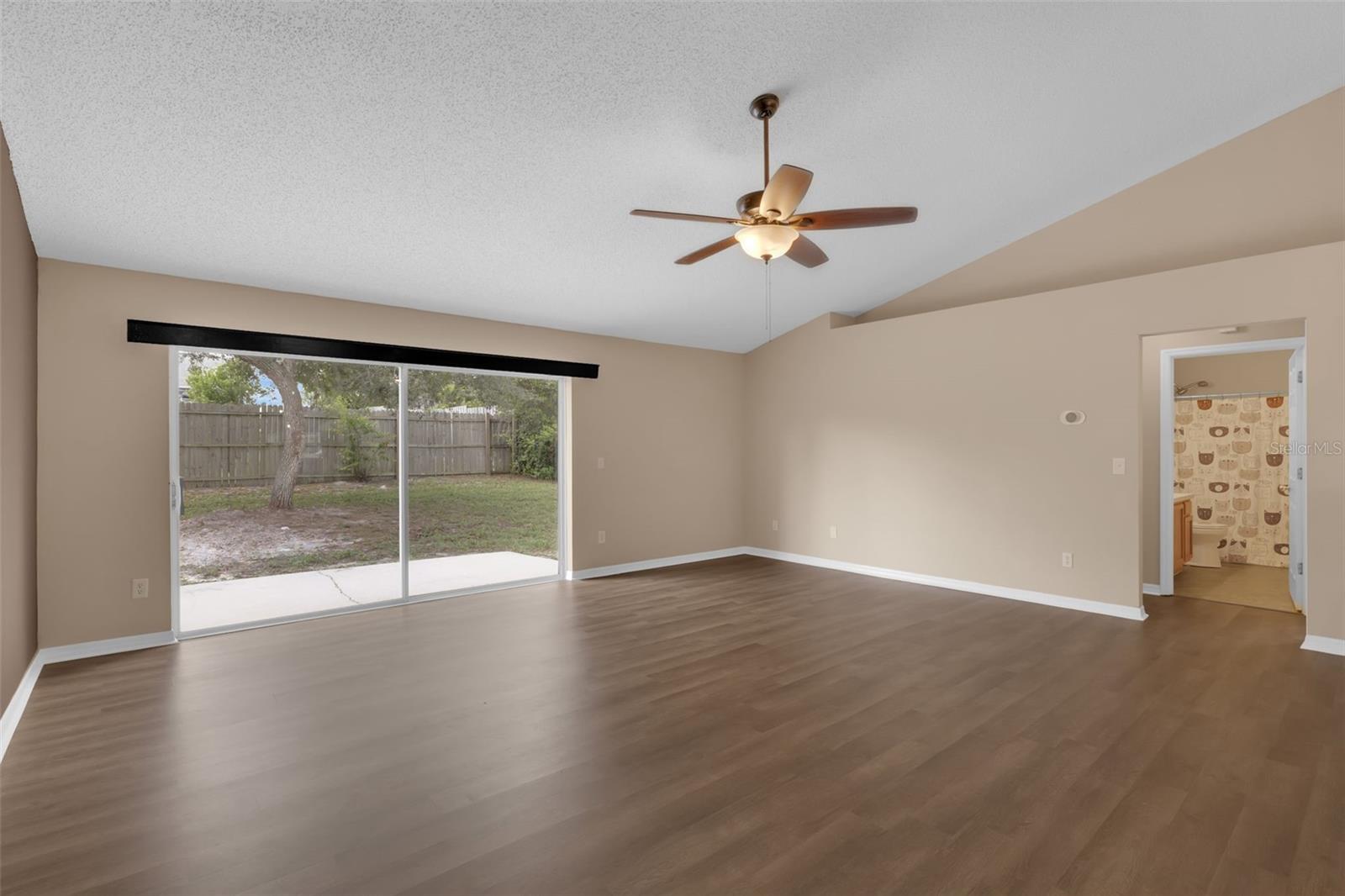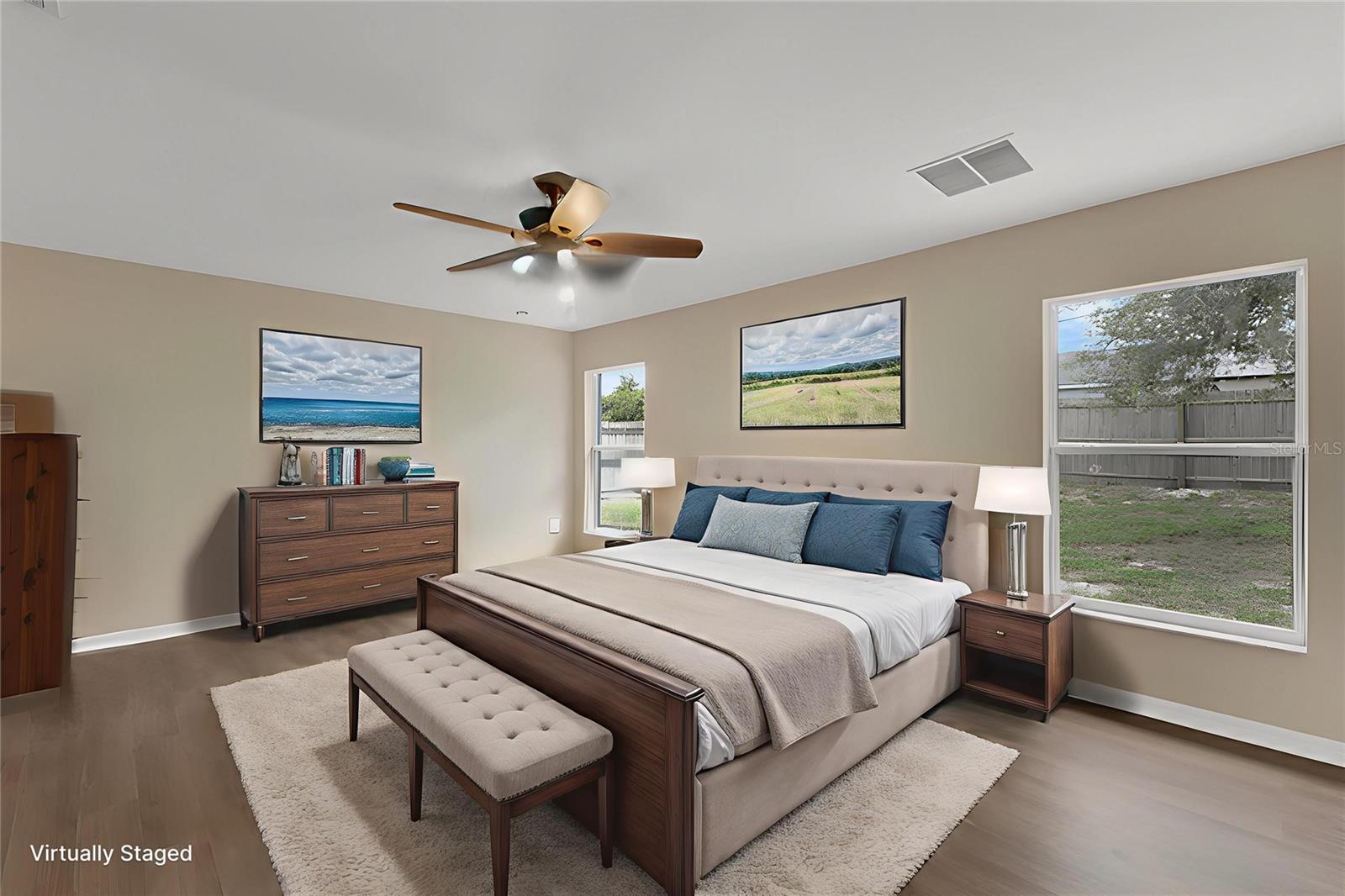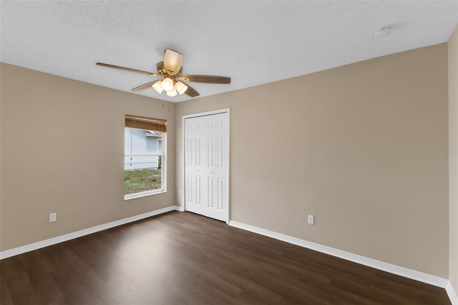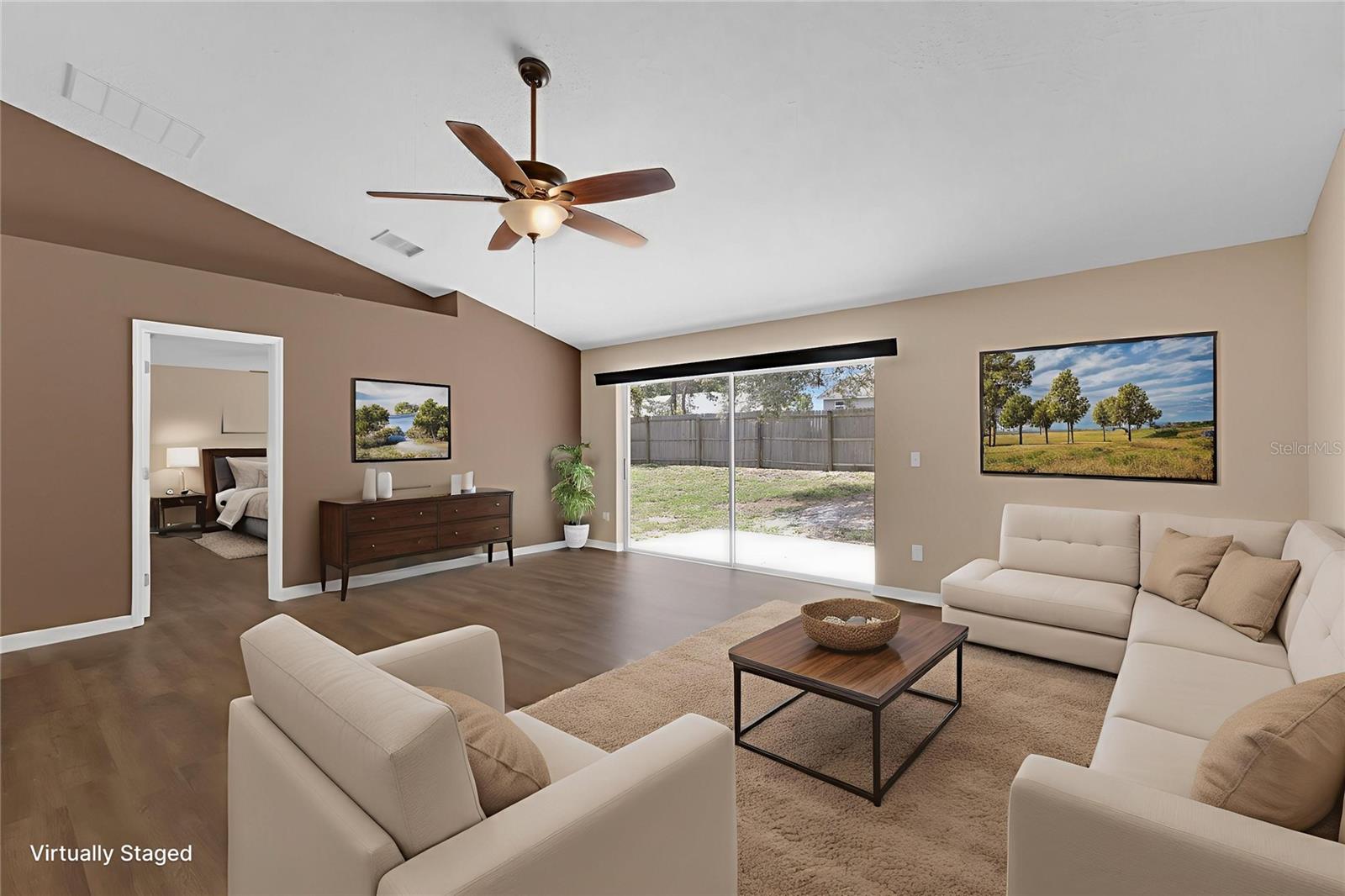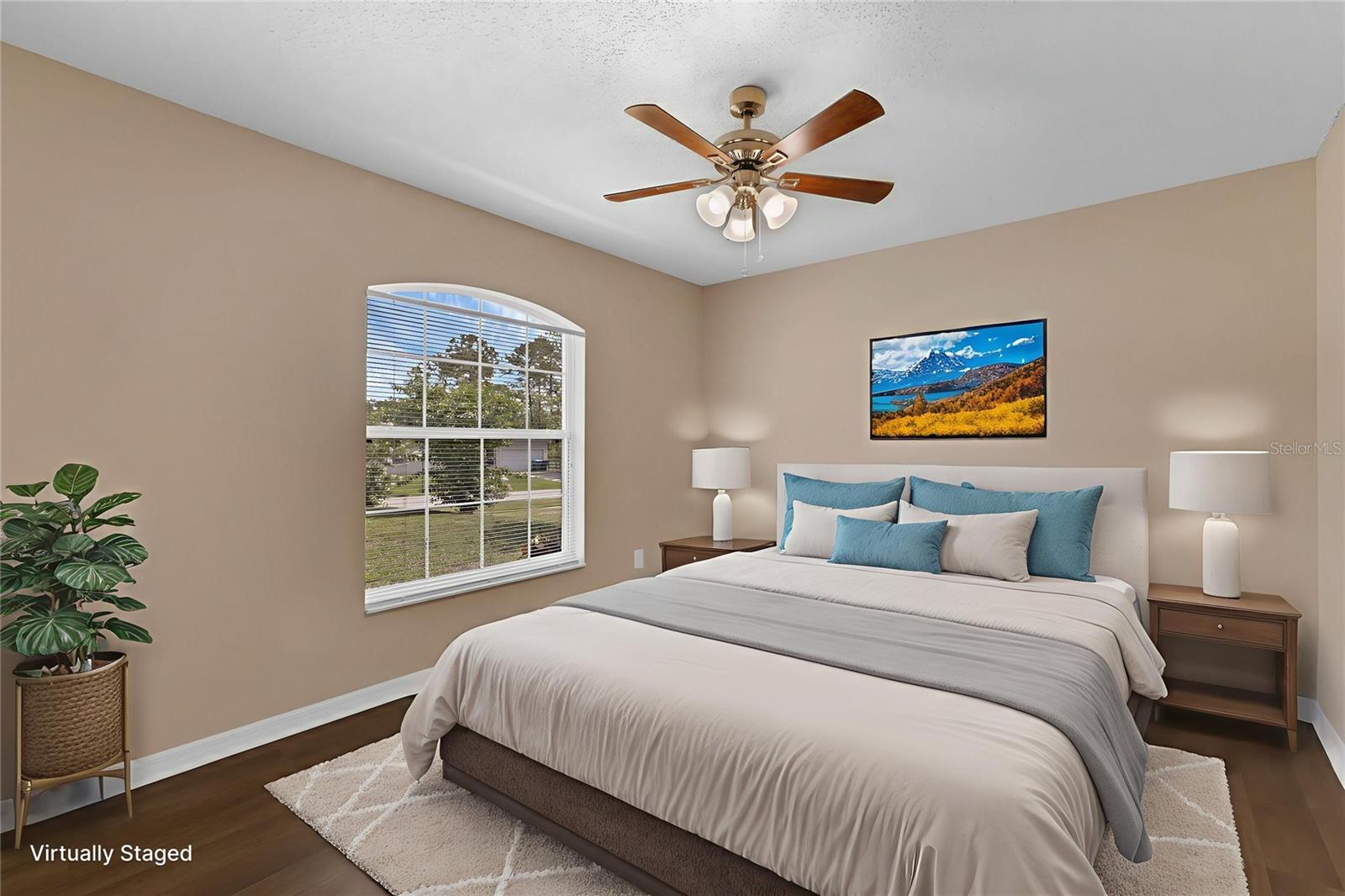 One or more photo(s) has been virtually staged. Welcome home to this cozy and inviting 4-bedroom, 2-bathroom gem nestled in the back of a quiet community near the peaceful Deep Creek Preserve, just moments from the Lake Helen border in north Deltona. Enjoy carefree living with brand-new laminate flooring, a 1-year-old roof, and a 3-year-old AC unit, all complemented by freshly painted exteriors. No HOA restrictions mean freedom and flexibility, while the spacious backyard boasts a picturesque shade tree—perfect for a swing and endless relaxation. Inside, discover a generous 18'x20' great room ideal for gatherings, and the impressive 13'x18' primary bedroom comfortably accommodates a king-sized bed and additional furniture. The cozy ensuite features dual sinks, a spacious garden tub, separate standing shower, water closet, and ample elbow room. Convenience is key with included washer and dryer, a coat closet, and a practical eat-in kitchen complete with breakfast bar. Additional peace of mind comes from recently pumped septic (last year), a 2019 water heater, and well-maintained appliances (6 years old). Low monthly bills ($230-250 for power, $30-40 for water) make this move-in-ready home as economical as it is welcoming!