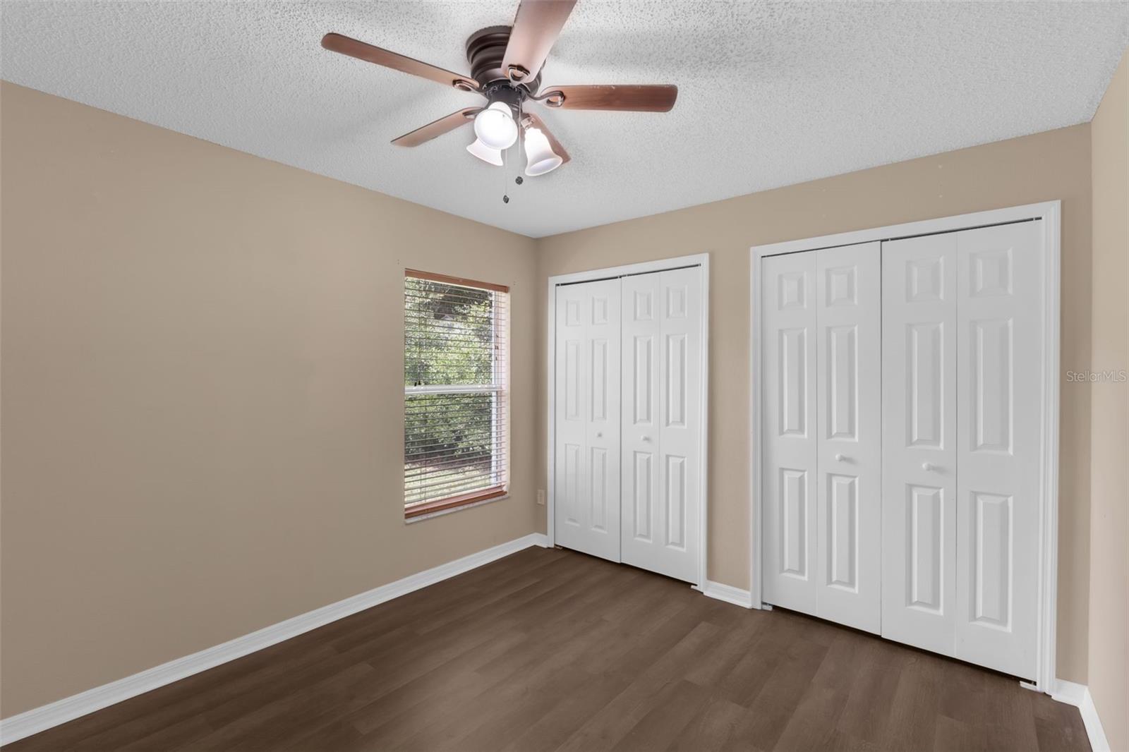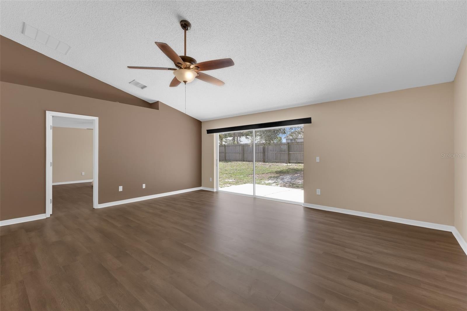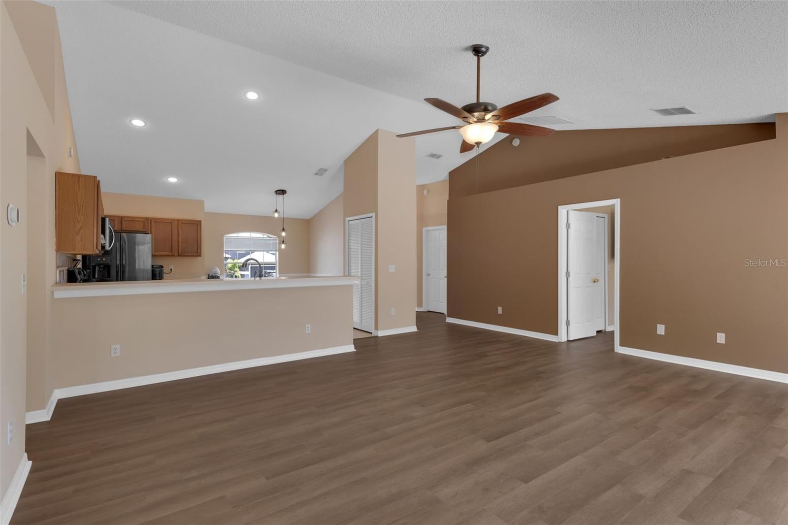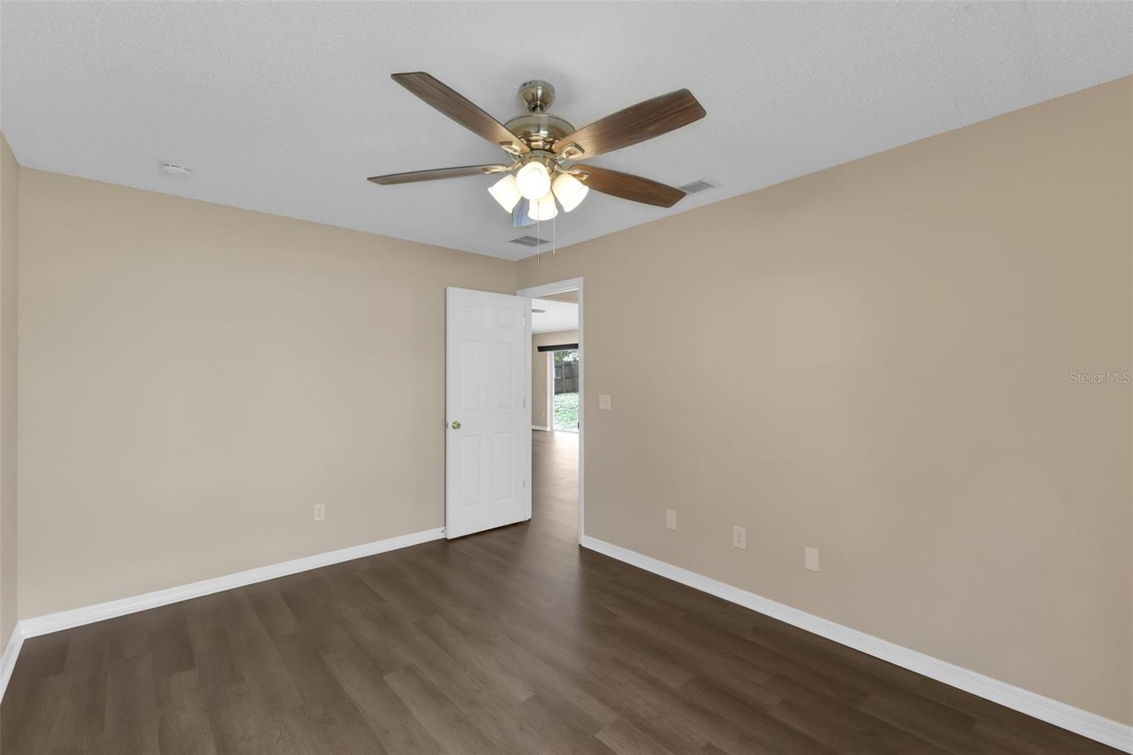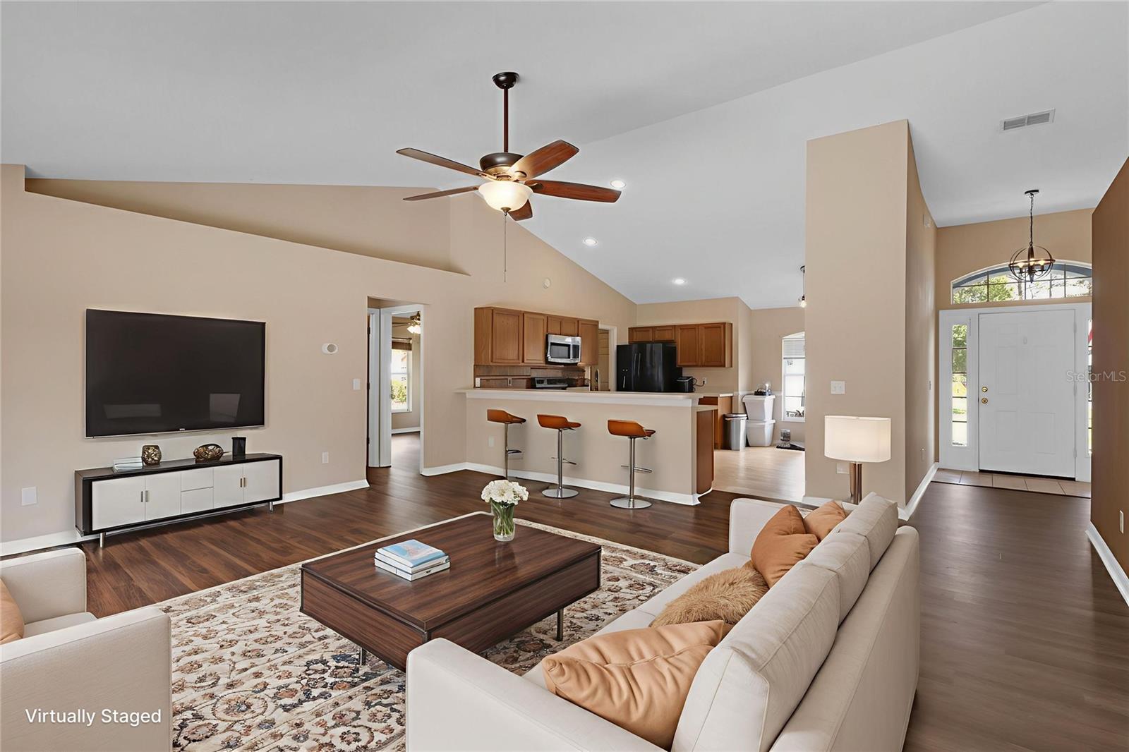 One or more photo(s) has been virtually staged. Welcome home to this cozy and inviting 4-bedroom, 2-bathroom gem nestled in the back of a quiet community near the peaceful Deep Creek Preserve, just moments from the Lake Helen border in north Deltona. Enjoy carefree living with brand-new laminate flooring, a 1-year-old roof, and a 3-year-old AC unit, all complemented by freshly painted exteriors. No HOA restrictions mean freedom and flexibility, while the spacious backyard boasts a picturesque shade tree—perfect for a swing and endless relaxation. Inside, discover a generous 18'x20' great room ideal for gatherings, and the impressive 13'x18' primary bedroom comfortably accommodates a king-sized bed and additional furniture. The cozy ensuite features dual sinks, a spacious garden tub, separate standing shower, water closet, and ample elbow room. Convenience is key with included washer and dryer, a coat closet, and a practical eat-in kitchen complete with breakfast bar. Additional peace of mind comes from recently pumped septic (last year), a 2019 water heater, and well-maintained appliances (6 years old). Low monthly bills ($230-250 for power, $30-40 for water) make this move-in-ready home as economical as it is welcoming!