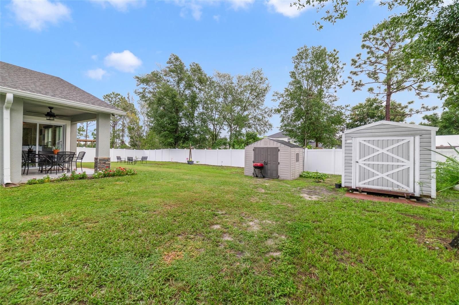 **Seller may consider buyer concessions if made in an offer**Welcome to this BEAUTIFULLY MAINTAINED 3-bedroom, 2-bath single-story home in Deltona Lakes, built in 2018 and showing LIKE NEW. Set on nearly ¼ ACRE, the home has been thoughtfully updated with NEW STUCCO and EXTERIOR PAINT (2025), added gutters, and a FULLY VINYL-FENCED backyard with two gated entries for privacy and convenience. Step inside to an inviting OPEN FLOOR PLAN, enhanced by ceramic tile flooring throughout, giving the home a fresh and modern feel. The Kitchen features GRANITE COUNTERTOPS, modern appliances, and ample cabinetry, opening seamlessly to the Dining and Living spaces, perfect for gatherings. Sliding glass doors in the Dining area lead to a covered patio overlooking the SPACIOUS backyard, complete with TWO SHEDS for extra storage. The primary suite is a PRIVATE RETREAT with an en suite bath featuring dual sinks, a step-in shower, a private water closet, and a generous walk-in closet. Two additional bedrooms and a full bath provide flexibility for family, guests, or a home office. Everyday tasks are a breeze with the convenience of an INDOOR LAUNDRY ROOM, complete with washer and dryer. Best of all, this home comes with NO HOA, giving you the freedom to truly make it your own. Tucked into the heart of DELTONA LAKES, this home places everyday conveniences like shopping, dining, and schools right at your fingertips, while NEARBY TREASURES such as Dupont Lakes Park, Lake Monroe, and Green Springs Park invite you to spend your weekends outdoors. And when adventure calls, EASY ACCESS to I-4, SR 415, and the SunRail station means you can be soaking up the sun in DAYTONA or NEW SMYRNA BEACH, or enjoying the vibrant dining and entertainment of Downtown Orlando in no time at all. With its like-new condition, modern finishes, and SPACIOUS LOT, this Deltona Lakes home is MOVE-IN READY and waiting for you. Schedule your private tour TODAY!
