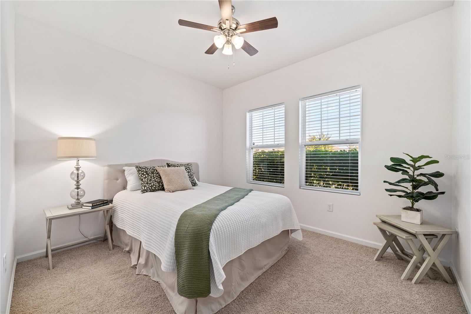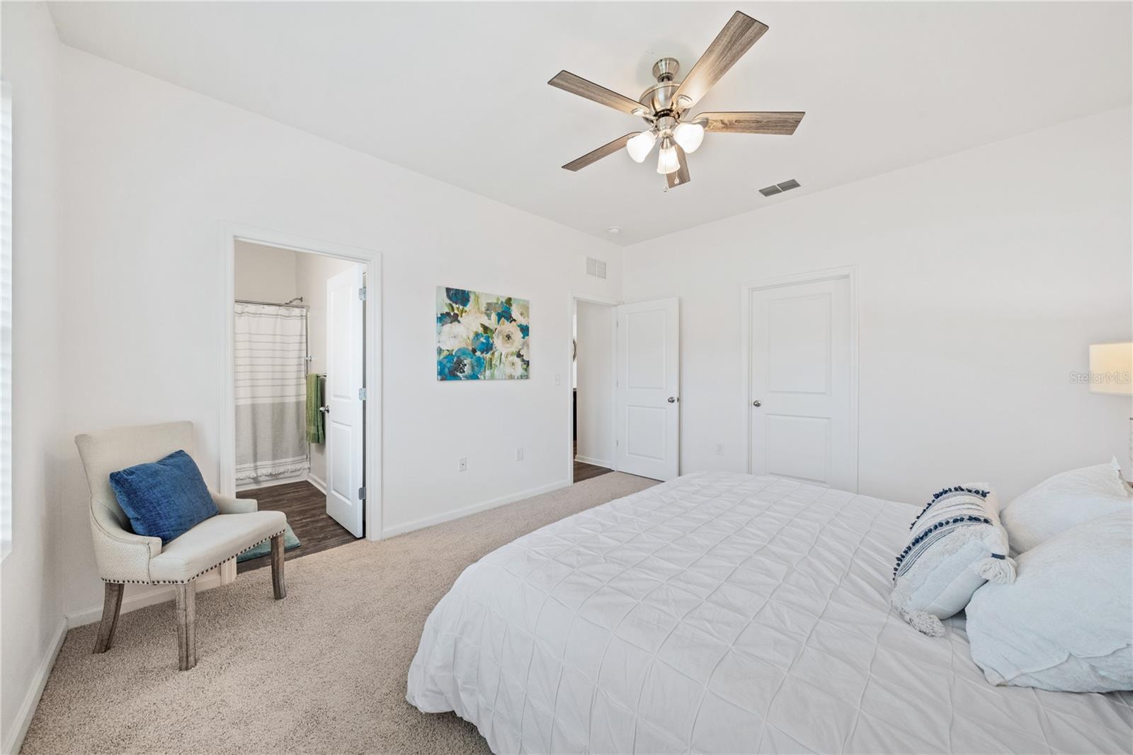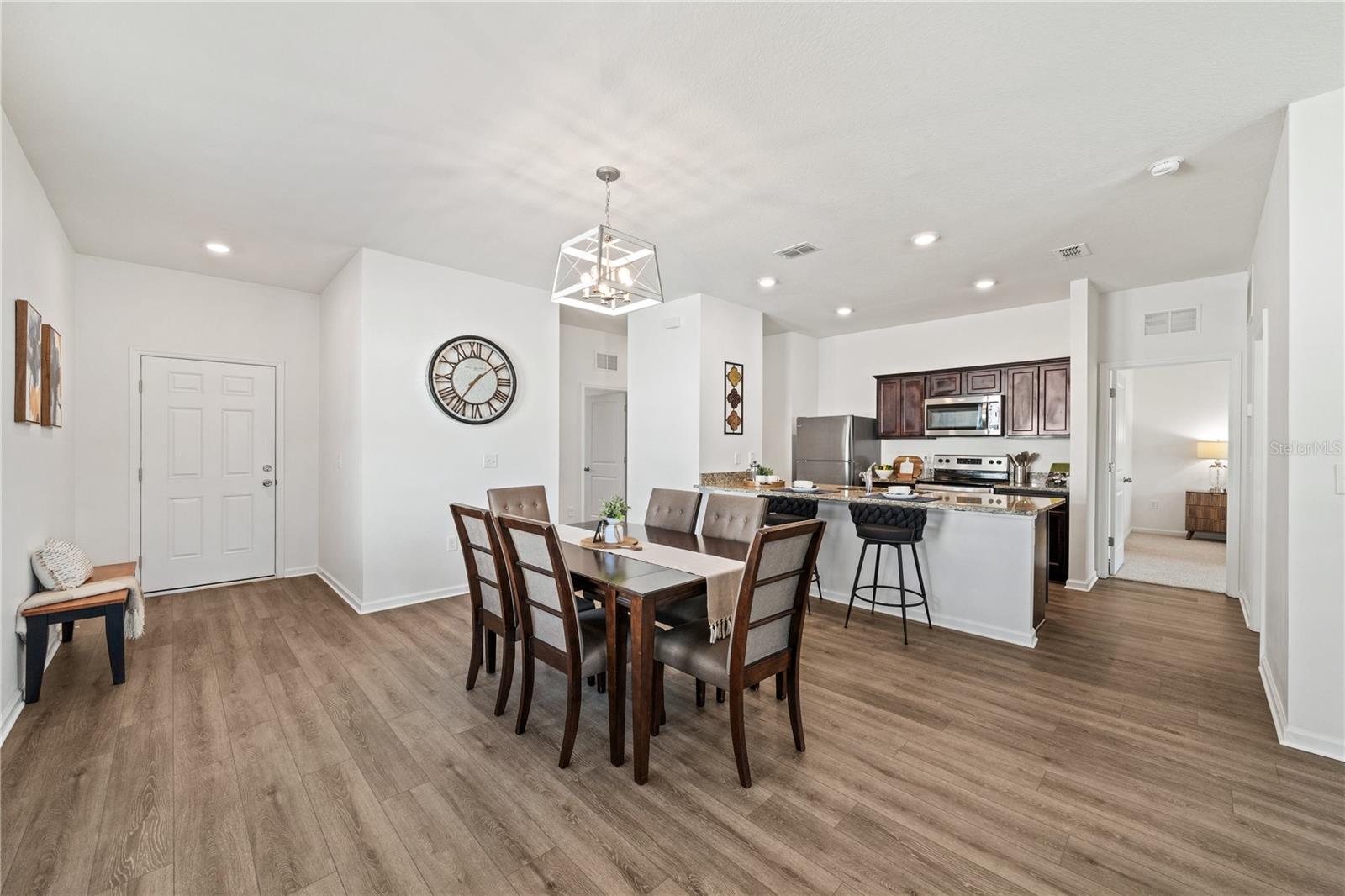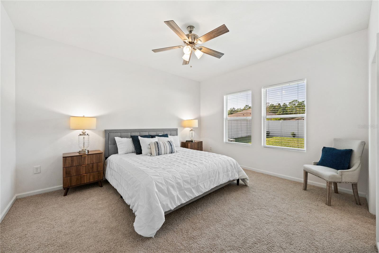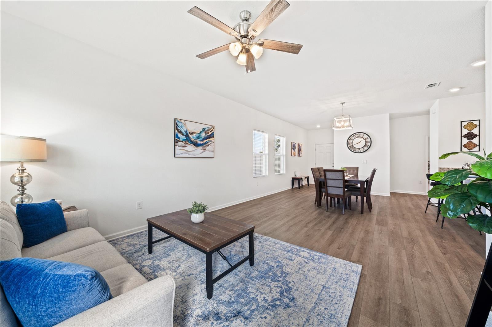 This move-in-ready 3-bedroom, 2-bath home designed for comfortable, modern living with an open floor plan that flows effortlessly from the kitchen through the dining and living areas, all highlighted by luxury vinyl flooring throughout the main spaces and new carpet in the bedrooms. The kitchen features granite countertops, a center island with breakfast bar, stainless steel appliances, and a seamless connection to the heart of the home, while multiple windows fill the interior with natural light and showcase the neutral palette and clean, contemporary finishes. The spacious primary bedroom offers a private ensuite bath and an immense walk-in closet, thoughtfully separated from the two front bedrooms in a split-bedroom layout that adds flexibility and privacy. Additional highlights include a dedicated laundry room, ample storage throughout, a covered entryway, irrigation system, and attractive curb appeal. Out back, enjoy a fully fenced yard with vinyl fencing, perfect for everyday use, along with access to a community pool. Centrally located near shopping, dining, and major highways, this home offers easy access to Sanford, Orlando, Daytona Beach, and all the best of Central Florida, including world-class beaches and iconic theme parks.