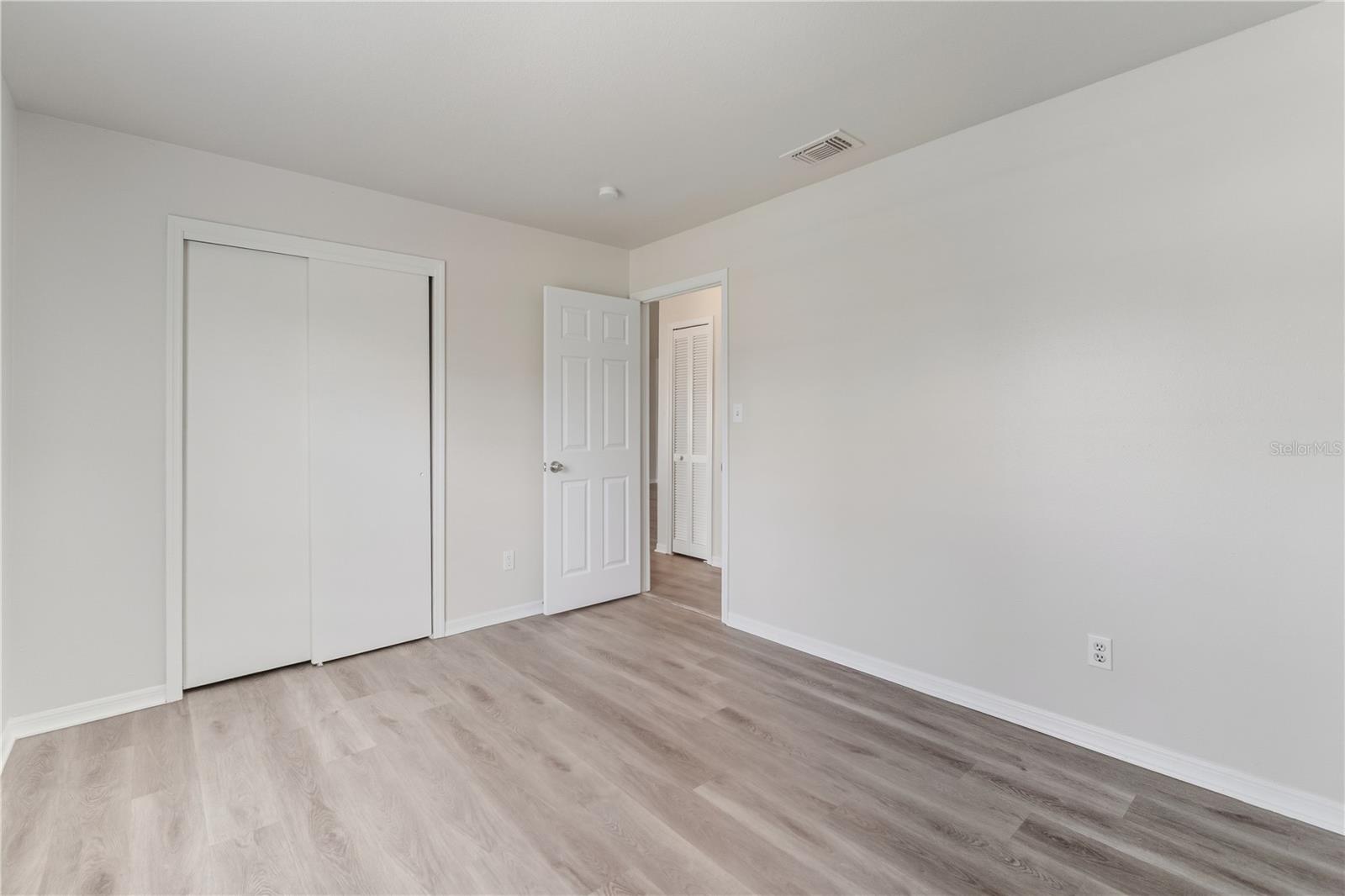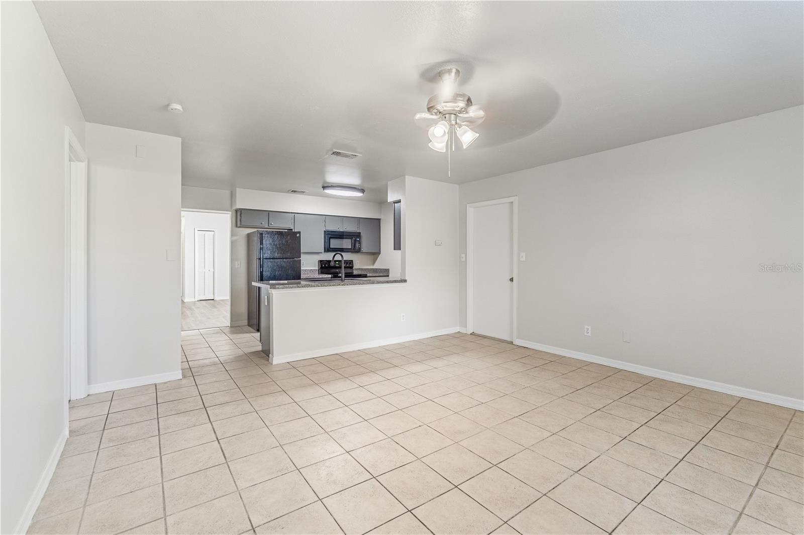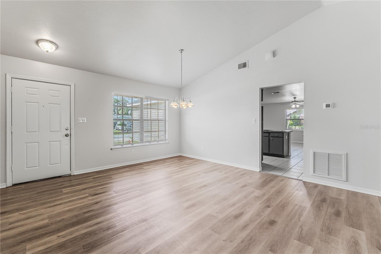 Tucked in Deltona Lakes with easy access to local amenities, this single-level home delivers a well-balanced layout designed for everyday ease and indoor-outdoor connection. Inside, a vaulted ceiling adds depth to the oversized living room, while natural light flows through to the adjacent dining space and screened patio beyond. The home’s kitchen is thoughtfully arranged with bar seating, dark appliances, and durable counters that transition smoothly into a tile-clad family room—ideal for casual living or entertaining. Three bedrooms are split for privacy, including a generous primary suite with a walk-in closet and private bath. Luxury vinyl plank flooring brings a unified aesthetic to the living areas and secondary bedrooms, while both bathrooms maintain a clean, functional design. Outside, a 53-foot screened patio overlooks the backyard, providing plenty of room for alfresco relaxation or weekend fun. A two-car garage, indoor laundry, and a fully fenced yard enhance day-to-day convenience. Situated on a 0.23-acre lot in a flood zone X, this home is just minutes from schools, parks, shopping, and commuter routes.