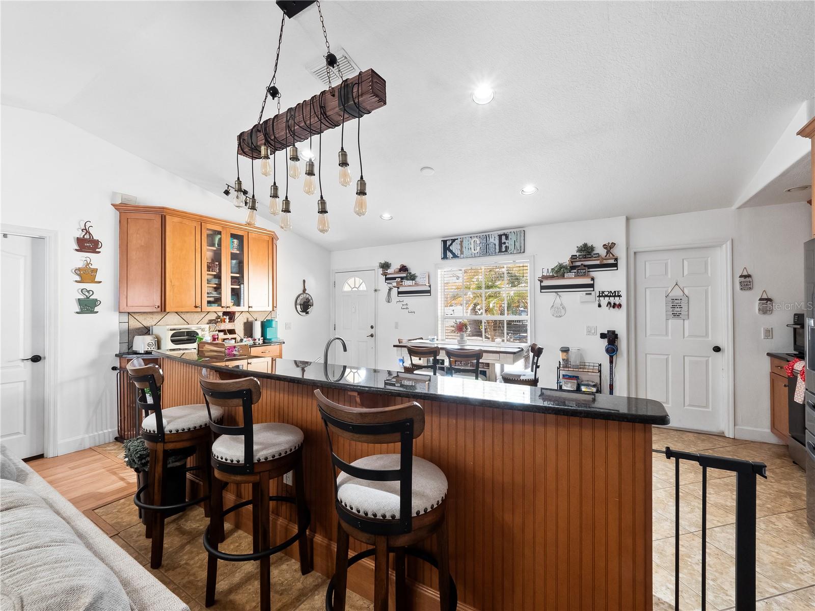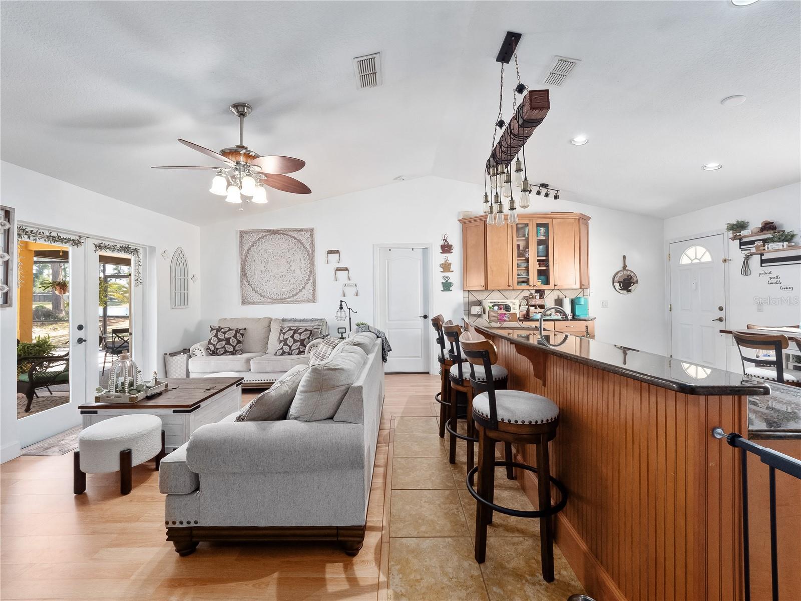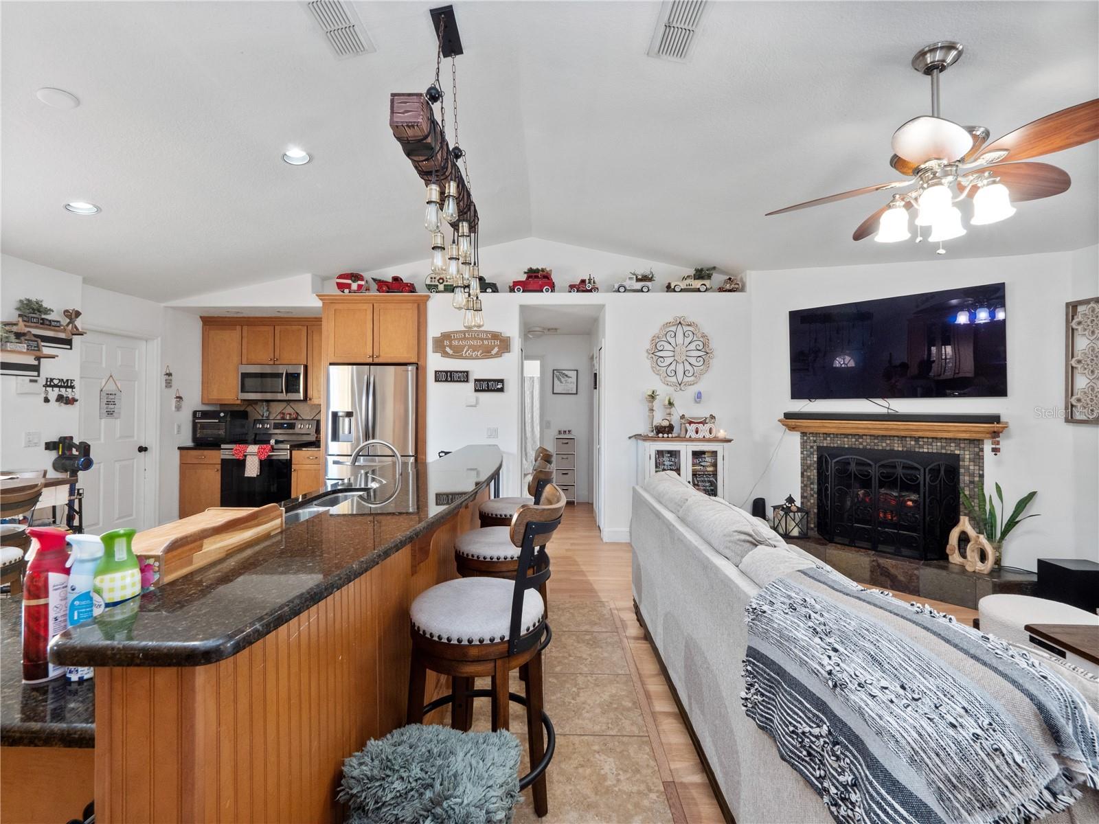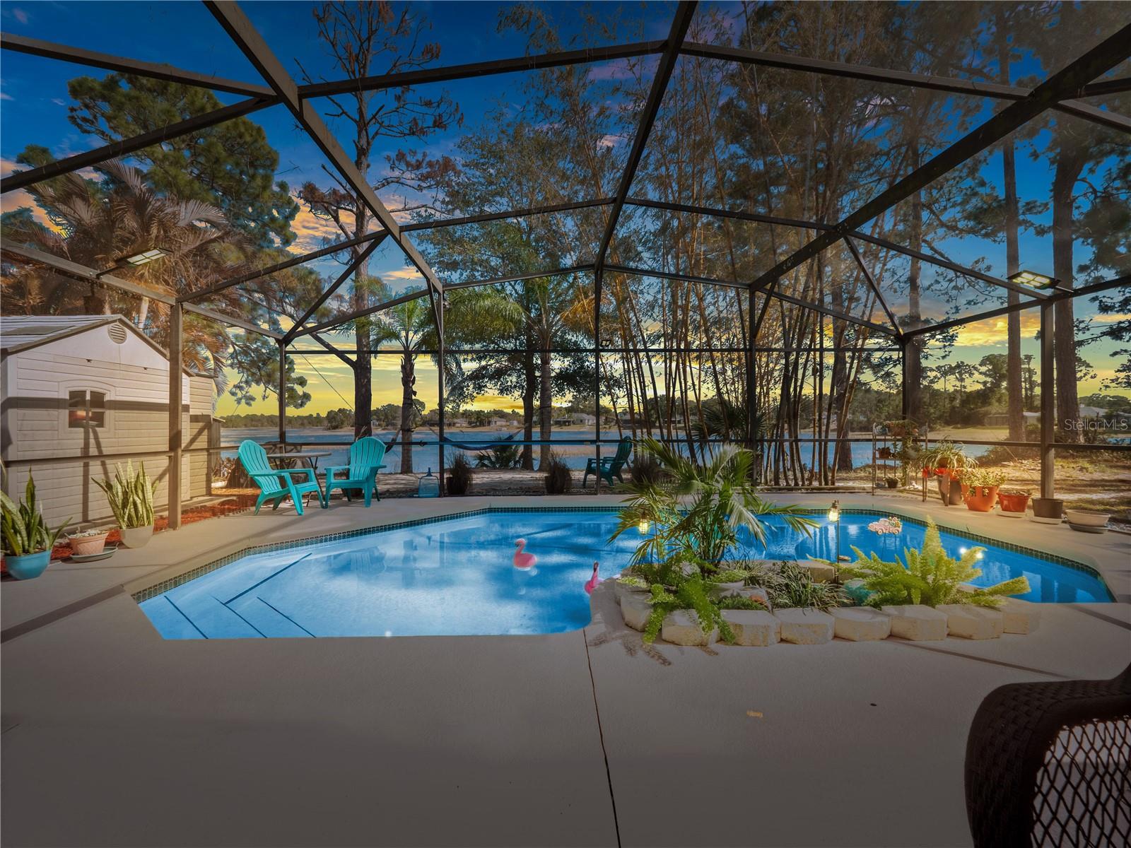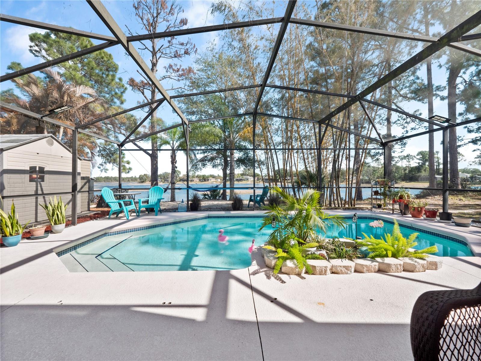 HGTV-ready LAKEFRONT oasis sitting on over a third of an acre in the heart of Deltona, with NO HOA! From the moment you arrive, this 3-bedroom, 2-bath tropical pool home feels like a true escape. With a metal roof, GENERAC whole-home GENERATOR, and lush surroundings, it honestly feels like your own slice of heaven. Step inside to magnificent tile flooring gracefully flowing, soaring vaulted ceilings, and a bright, open layout that is perfect for entertaining. The remodeled kitchen is a showstopper, featuring real wood cabinetry, GRANITE countertops, and a massive island that opens seamlessly to the living room, perfect for entertaining, family gatherings, or casual nights at home. The home was professionally painted just two years ago and it truly shows like a model. The living room offers warm laminate flooring, a tropical ceiling fan, and a stunning fireplace, perfect for cozy evenings and making memories with the family. The split floor plan offers great privacy, with the primary suite tucked away and sized just right. It includes a large walk-in closet and a jaw-dropping en-suite bathroom, REMODELED less than two years ago with a farmhouse-chic, HGTV-worthy design. Simply beautiful. The two guest bedrooms are generously sized, each with ceiling fans and ample natural light. The guest bathroom has also been updated with a new vanity. Step outside and this is where the home truly shines. Enjoy your private tropical backyard oasis complete with a covered porch for entertaining, a hot tub to unwind after a long day, and a screened-in pool overlooking Louise Lake. Surrounded by bamboo and lush tropical landscaping, it genuinely feels like a peaceful island retreat. Additional highlights include a 220V outlet (perfect for RV hookup), excellent insulation for low electric bills, and a home that is truly move-in ready from top to bottom. This one is special, lakefront, private, beautifully updated, and designed for both everyday living and unforgettable moments. Just moments from SR 415, with quick access to I 95, SR 417, and I 4, you’ll enjoy an easy commute to Orlando, Daytona, and Sanford. Everyday conveniences such as Publix, Walmart Supercenter, Dunkin’, McDonald’s, and additional dining and shopping are minutes away.