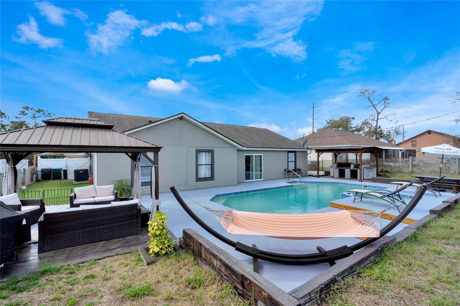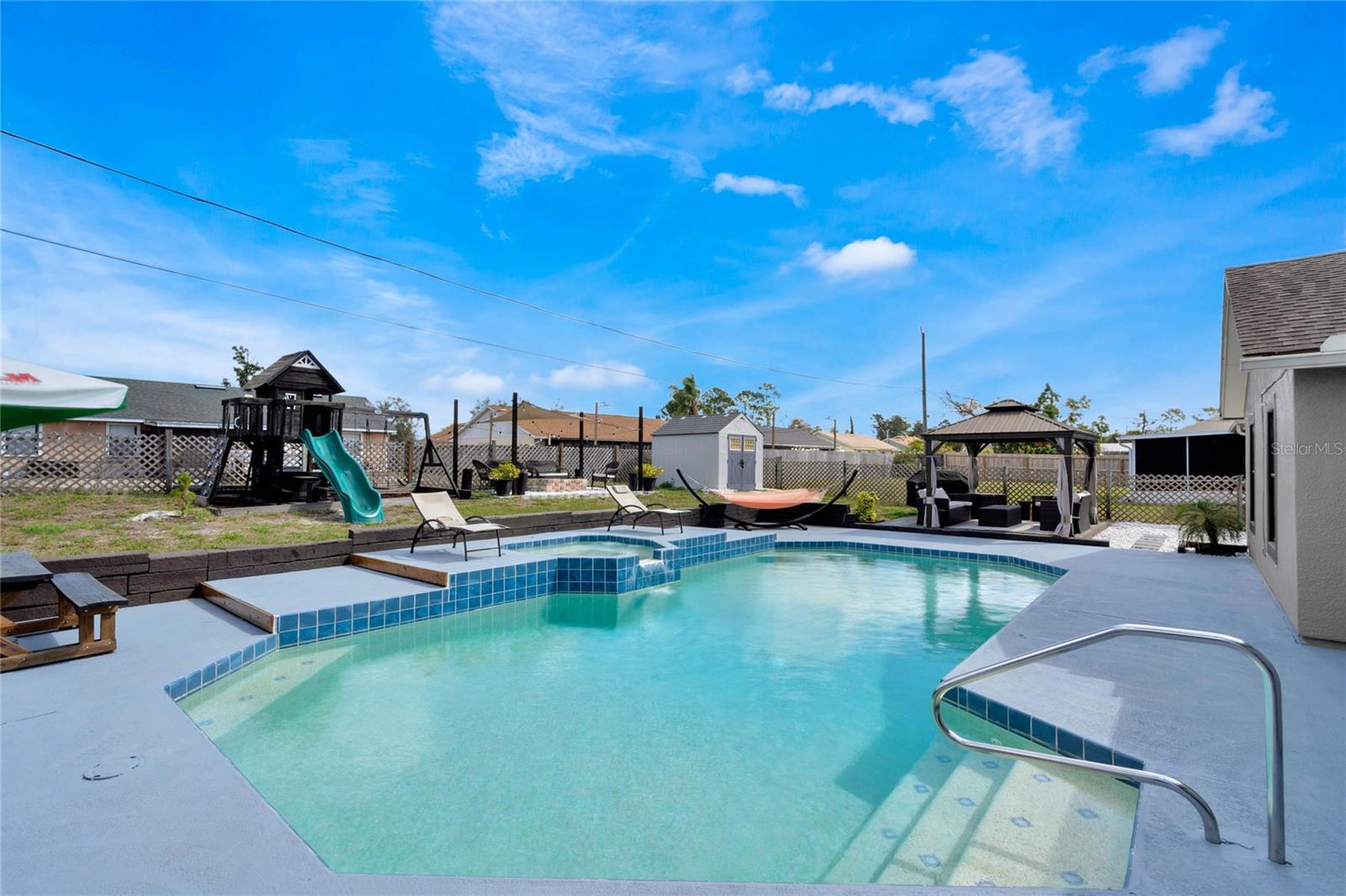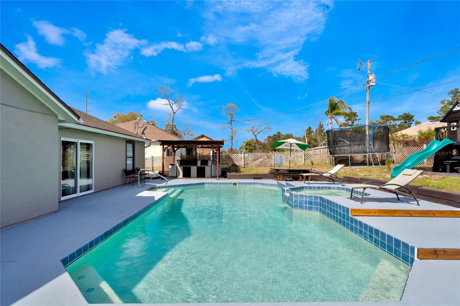 Your Private Florida Oasis – No HOA, All the Freedom Step into a stunning tropical retreat where comfort, style, and entertainment come together. Whether you're hosting lively gatherings, unwinding by the pool, or enjoying the thoughtfully designed outdoor space, this home offers the perfect blend of relaxation and functionality. Key Features: Freshly Painted Inside and Out – Enjoy the crisp, clean look of a home that feels brand new with fresh interior and exterior paint, creating a bright and welcoming atmosphere throughout. Resort-Style Pool & Jacuzzi – Enjoy a beautifully maintained pool with an integrated jacuzzi, perfect for year-round enjoyment. Expansive Backyard Designed for Entertainment – This fully fenced outdoor space includes a gazebo, pergola with a built-in grill and picnic area, a fire pit, a trampoline, a children’s play area, a basketball hoop, and a mini soccer field with synthetic turf. Spacious and Functional Layout – A well-designed split floor plan offers four bedrooms, two bathrooms, a living room, a family room, and a game room, providing ample space for both relaxation and entertaining. Recent Upgrades for Peace of Mind – A brand-new air conditioning system with a 10-year warranty, a 2017 roof, a newer hot water tank, smart lighting throughout social areas, and new ceiling fans enhance both efficiency and comfort. A Suncast 8'x10' storage shed provides additional storage solutions. Prime Location – Conveniently located in Deltona with easy access to I-4 and 415, placing you between Orlando’s world-renowned attractions and Florida’s beautiful beaches. Schools, shopping, and dining options are just minutes away. A Home That Offers More Whether you are a first-time homebuyer, an investor, or searching for the perfect Florida home, this property delivers. Its combination of space, style, and outdoor living makes it a rare find.