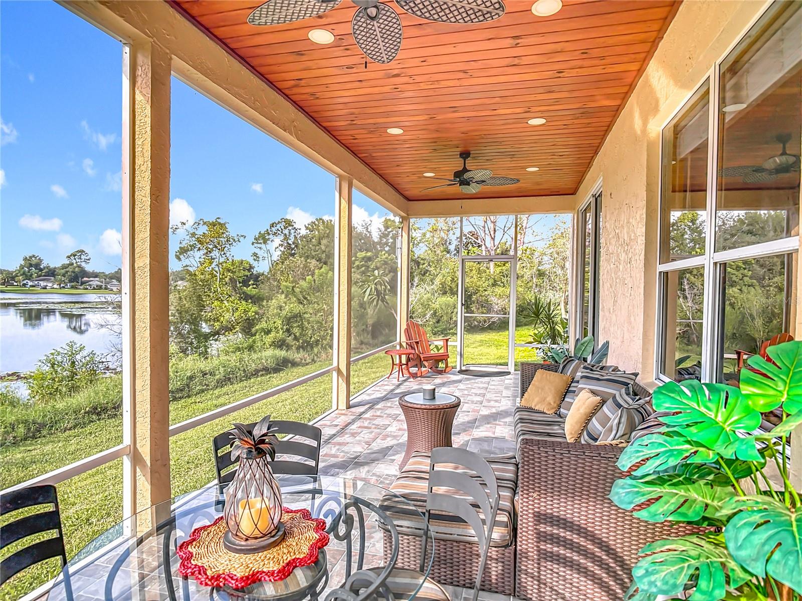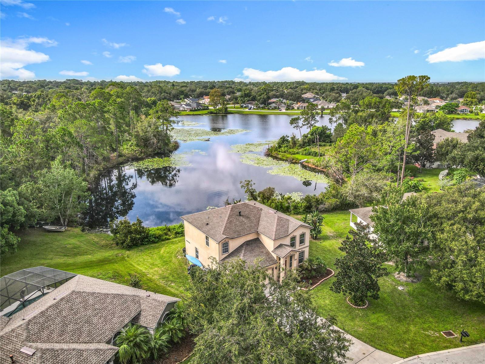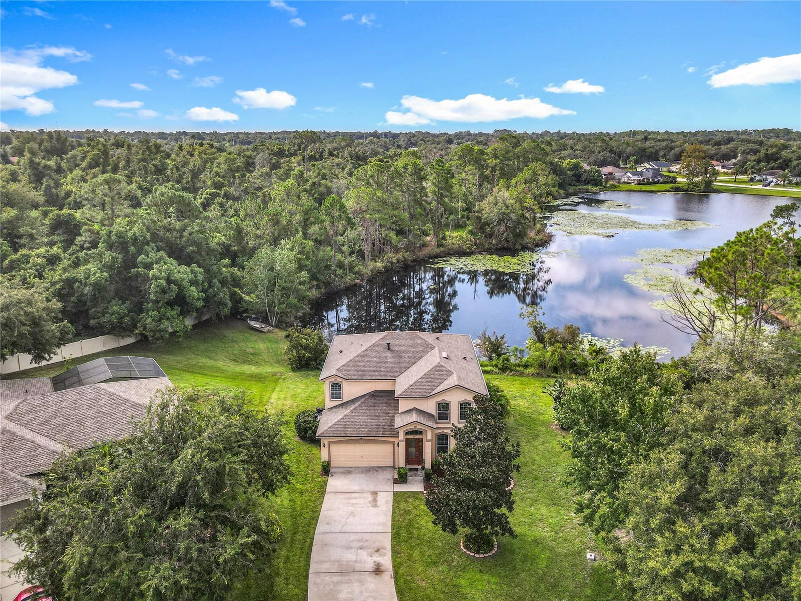 Lakefront Living – 4 Bedrooms + Office – Gated Community – Cul-de-Sac Lot tucked away on a quiet cul-de-sac in a gated neighborhood, this lakefront home offers incredible views and plenty of room to live and entertain. The large, landscaped lot provides wide side yards—perfect for everyone, pets, and outdoor fun. Step inside through the beautiful 8’ leaded-glass front door and into a bright living room with soaring 19’ ceilings and lots of windows. The main level features two separate living areas, a full bedroom and bath, a spacious kitchen and dining area, plus a private office/bonus room with elegant glass pocket doors. The heart of the home is the 540 SF open kitchen, family, and dining space. With a new gas range, dining bar, and direct access to the screened lanai, it’s an ideal gathering place. The lanai offers serene lake and nature preserve views, tile floors, ceiling fans, and a wood tongue-and-groove ceiling—true Florida living indoors and out. Upstairs you’ll find a versatile loft, the primary suite, and two additional bedrooms with a full bath. The primary suite features coffered ceilings, lake views, a private hall leading to an oversized 11’ walk-in closet with natural light, and a large ensuite with double vanities, soaking tub, and separate shower. All guest rooms are generously sized with ample closet space. RECENT UPGRADES & FEATURES: ROOF (5 years), AC UNIT (1 year), NEW WATER HEATER, decked attic for storage, natural gas for stove/dryer/water heater, and reclaimed water for irrigation. The private gated neighborhood is location centric, convenient to I4, shopping, and restaurants.