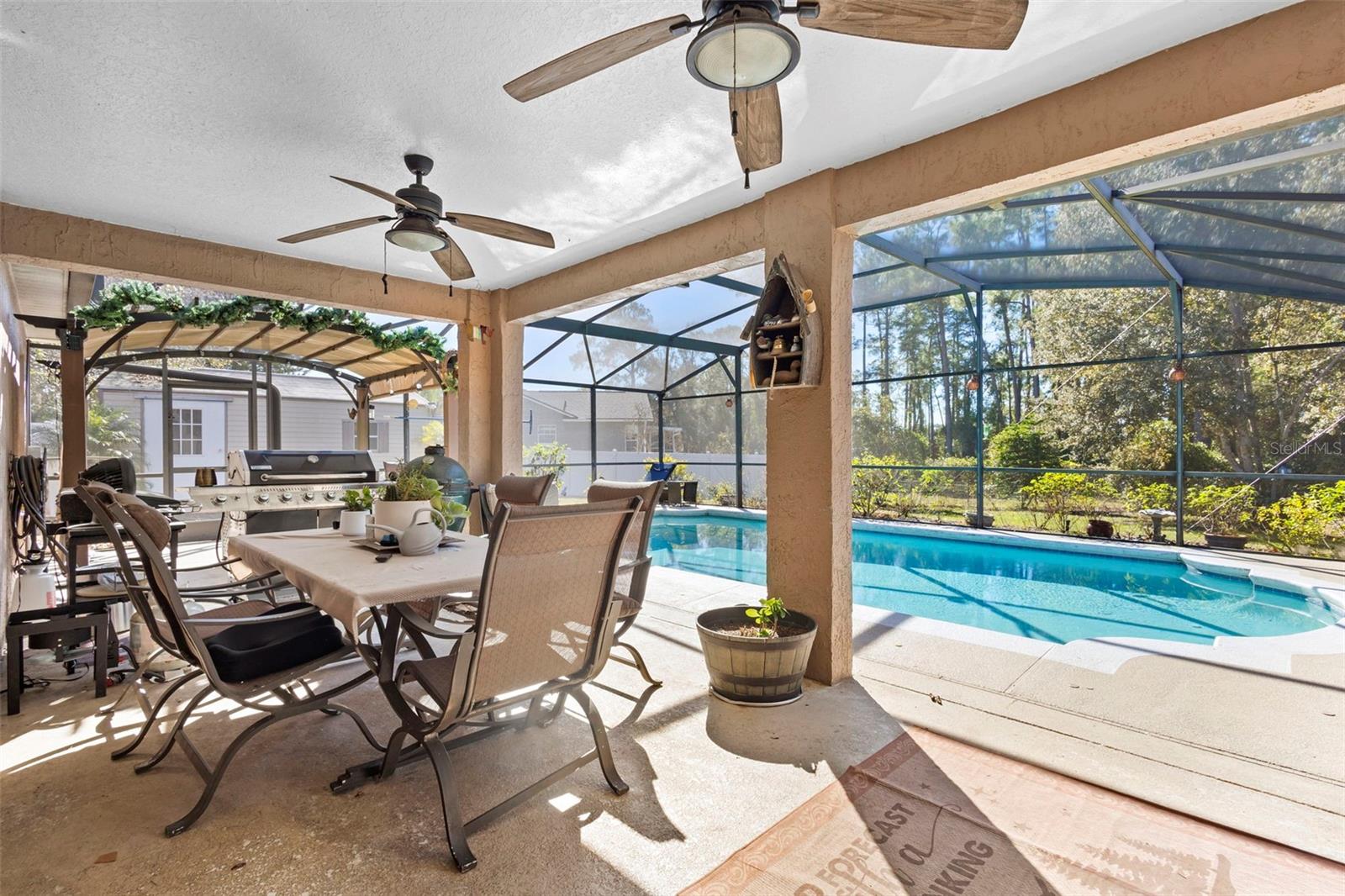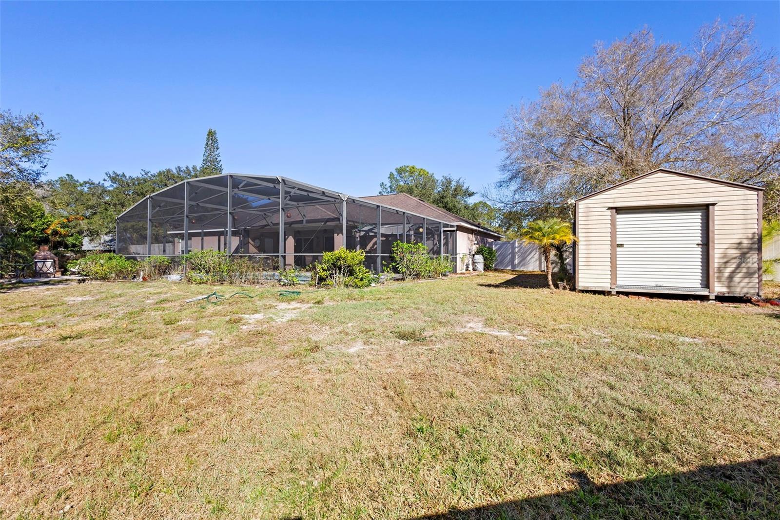 Welcome to a Beautiful well-maintained home that sits on almost a half-acre corner lot, room for all your toys! No HOA and no rear neighbors. The under-truss Lani overlooks the pool enclosure, rescreened in 2025 also the pool pump replaced in 2025. This 4-bedroom 2 bath has a split floorplan with high ceilings and an open concept layout. The front living room would make a great office or media room while the kitchen has stainless steel appliances with a breakfast bar open to the Dinette area and large family room. The sliding doors open out to the Lani and pool area. Outside the pool is a large fire pit, great for gatherings and entertaining! Inside Laundry room - Roof replaced in 2018 - A/C replaced in 2024. A 12'x20' storage shed!! Minutes from St Rd 415 and I-4