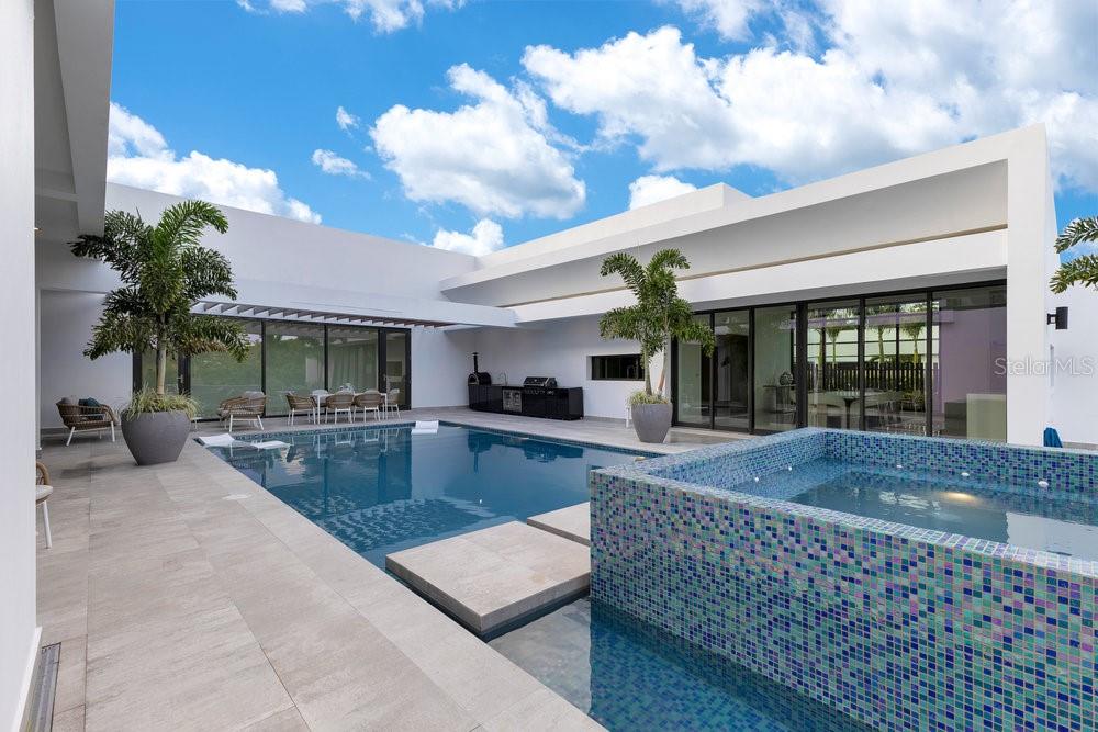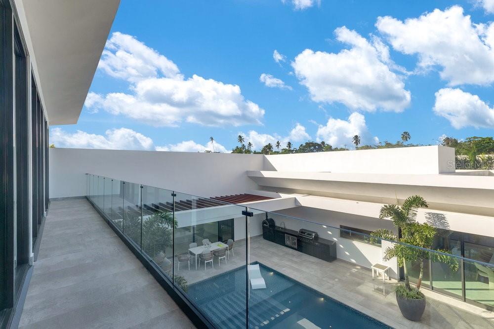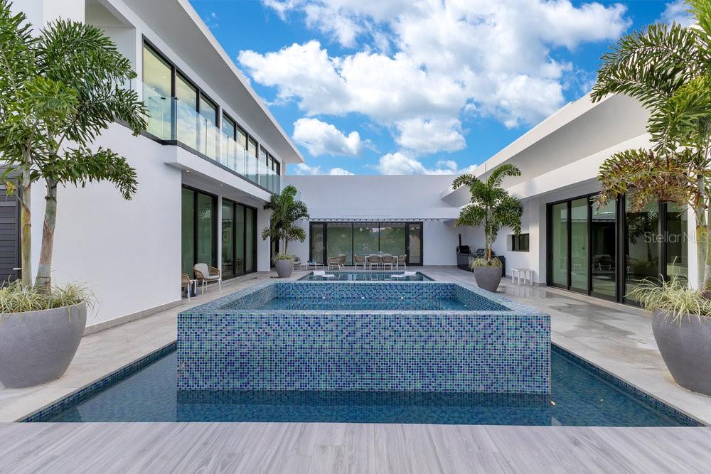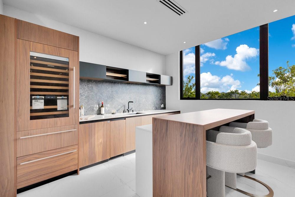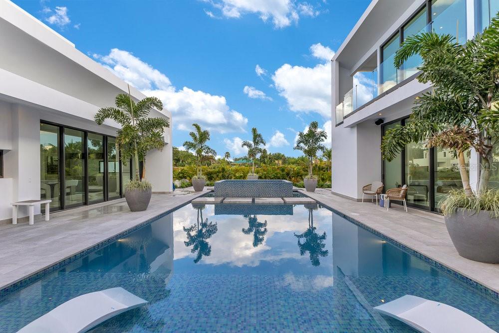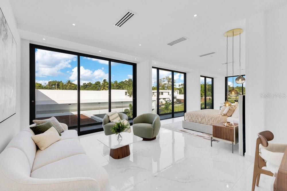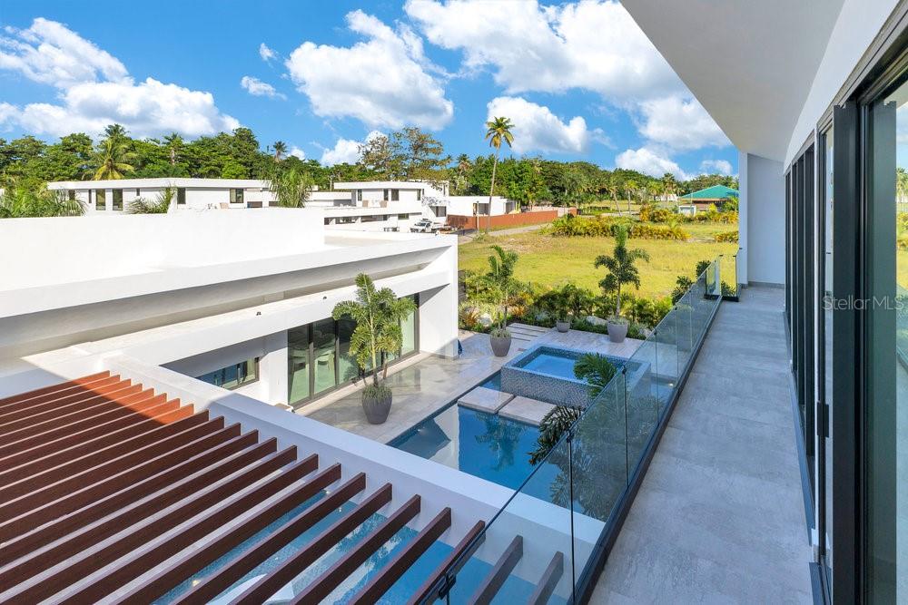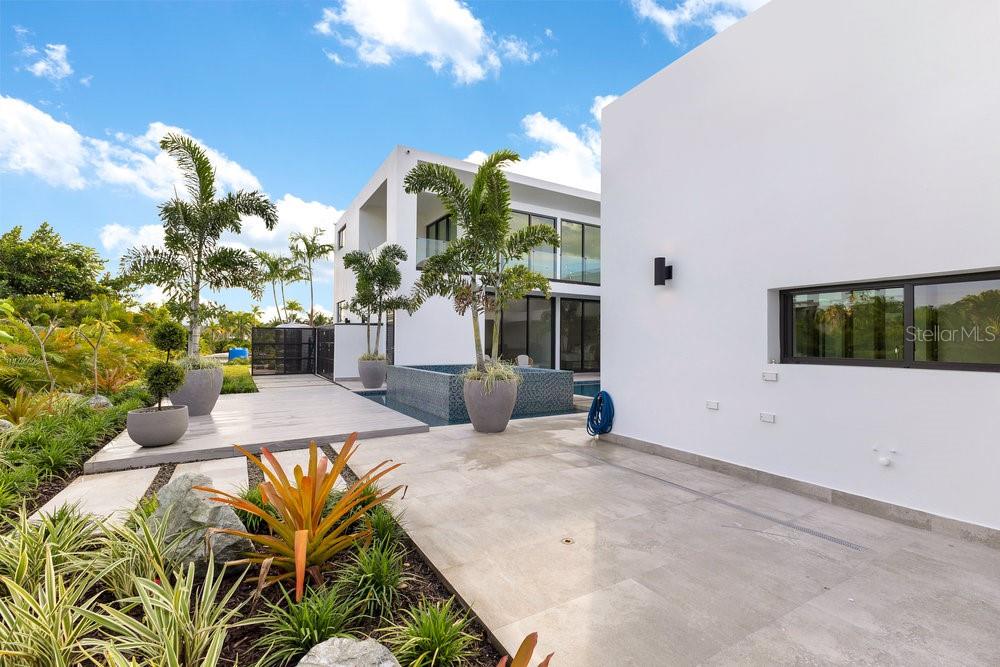Situated in one of Dorado Beach's most desirable neighborhoods, known for exceptional value in custom homes, this 10,385 sq. ft. estate exudes serene luxury. A tranquil courtyard pool with a cascading waterfall sets the tone for resort-style living. The home features six spacious bedrooms, including four on the main floor with ensuite baths and custom closets. Upstairs, a cozy living area features a bar equipped with a Sub-Zero wine fridge, refrigerator, and ice maker. The expansive primary suite boasts a sitting area, custom Italian walk-in closet, and a spa-like bath with dual showers and a freestanding tub. Additional highlights include an exterior BBQ kitchen with a pizza oven, a wet bar by the dining room, and a hidden pantry.