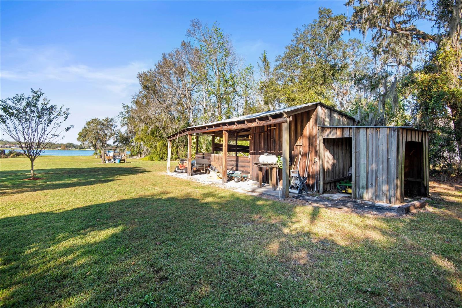 MOVE IN READY! Come Check it out today!!! Jeffrey-Built Home with NINE ACRES and Direct LAKE FRONTAGE on Stearns Lake! Welcome to this extraordinary property offering nine acres of land, over 300 feet of lake frontage, and endless opportunities! This unique compound includes a three-bedroom, two-bath home, a 19-run air-conditioned dog kennel, and a one-stall horse barn with a tack room—all nestled in a serene, no HOA, no CDD -This spacious 2,552 sq. ft. single-level home boasts an inviting open floor plan with cathedral ceilings, a wood-burning fireplace, and breathtaking views of Stearns Lake. Master Suite: A tranquil retreat featuring a large walk-in closet and serene lake views. The en-suite bath includes dual vanities, a garden tub, and a separate walk-in shower. Kitchen: Bright and functional with ample cabinet space, a breakfast nook, and an open flow to the family room, perfect for entertaining. Living Spaces: Formal dining room, a large bonus room with panoramic lake views, and a cozy enclosed porch for year-round enjoyment. Additional Bedrooms: Two spacious rooms offering flexibility and comfort. Exterior and Land: The property sits on a gorgeous lakefront lot with nearly 33 acres of Stearns Lake. Enjoy over 300 feet of private lake frontage with endless possibilities—build your dream dock, launch your small electric trolling boat, or simply soak in the stunning sunsets. Outdoor Living: A huge private fenced backyard invites you to relax, host BBQs, or enjoy evenings by the lake. Additional Features: Two-car garage, covered carport, and a well/septic system Kennel and Barn:19-Run Dog Kennel: Fully equipped with air conditioning, running water, a grooming area, and its own private fenced yard. Perfect for a home business, boarding facility, or grooming center with significant income potential. Horse Barn: Includes one stall and a tack room, ideal for horse lovers or additional storage. Updates: Roof: 2014. A/C System: Approximately 4 years old. Location: Situated on a quiet dead-end street, this property provides a peaceful sanctuary while still being close to everything! Convenience: Minutes from Downtown Tampa, MacDill AFB, major highways (HWY 60, I-75, I-275, I-4, Selmon Expressway), Tampa International Airport, shopping, schools, golf courses, and restaurants. From the moment you arrive, you’ll feel the peace and tranquility of this stunning lakefront property. Whether you’re seeking a personal sanctuary, an investment opportunity, or a combination of both, this home has it all. Call today for your private tour of this one-of-a-kind home! Front door does not convey and will be replaced with similar door. Measurements are approximate buyer to verify.