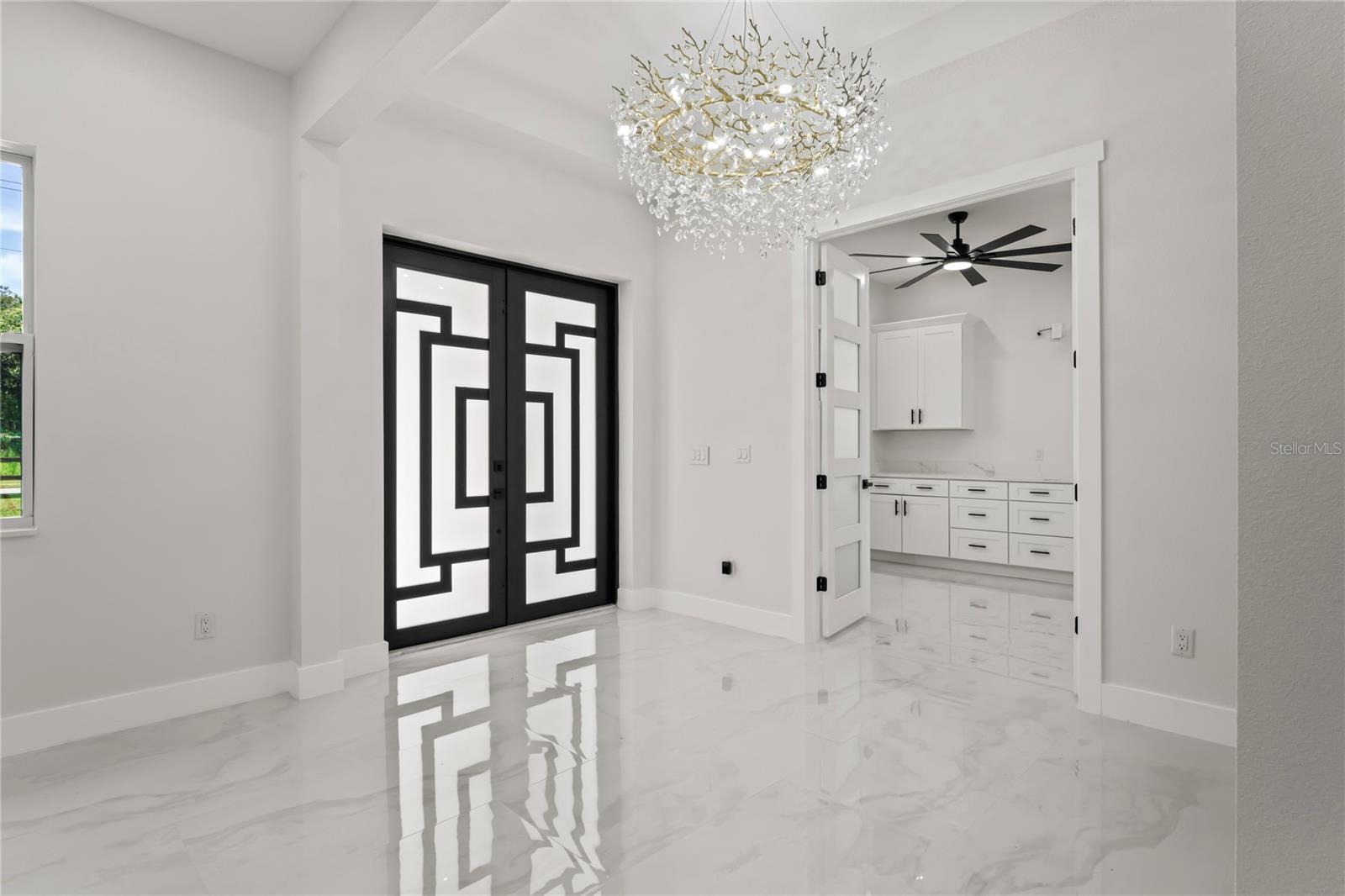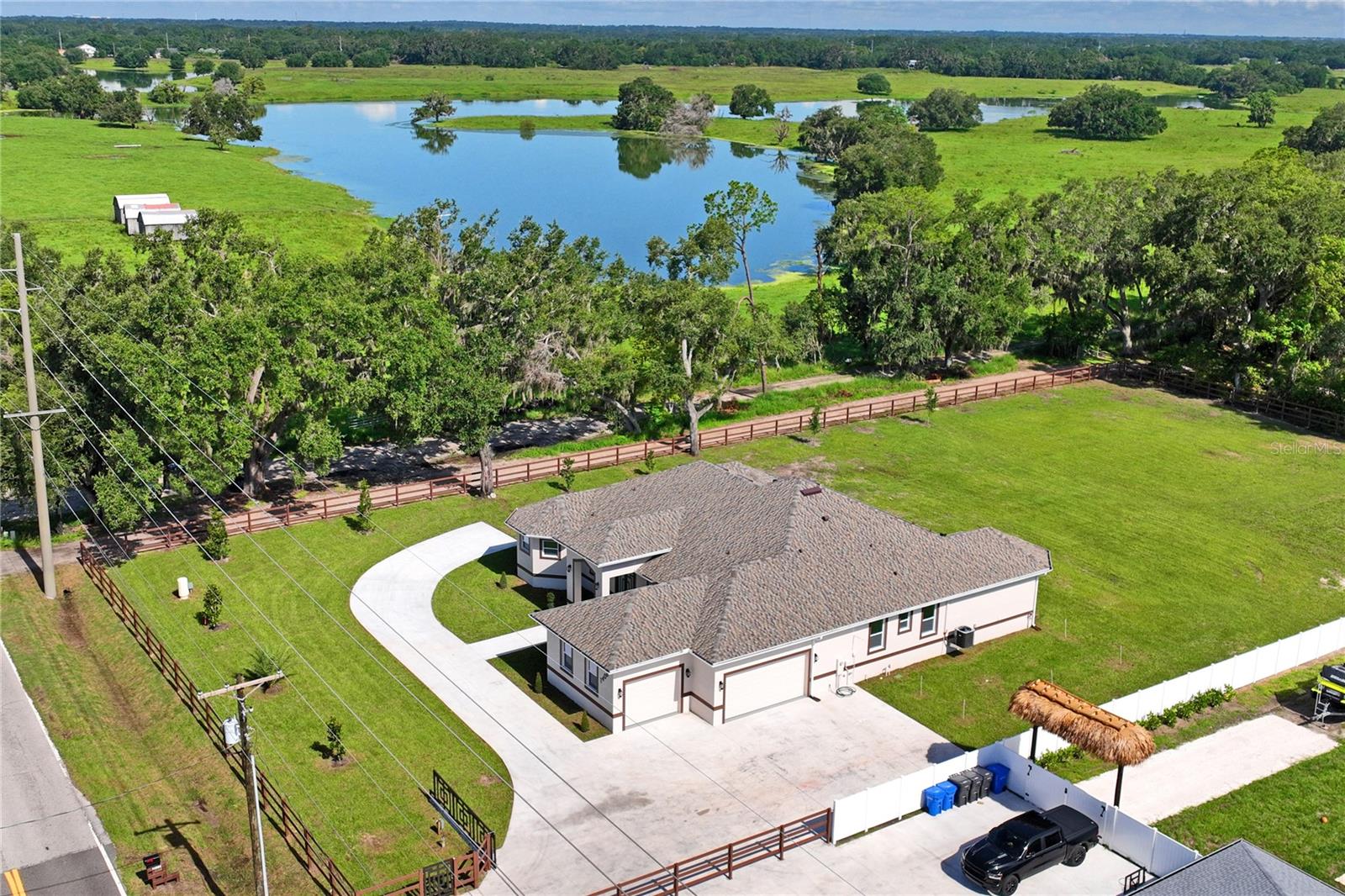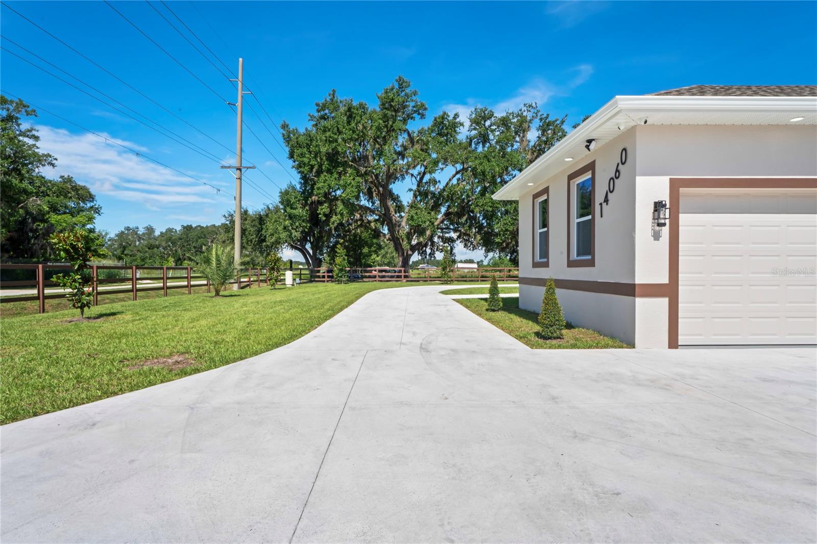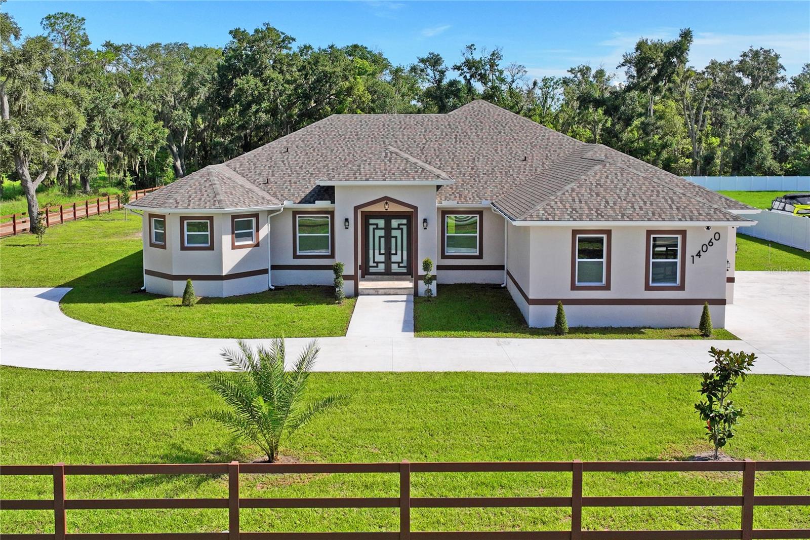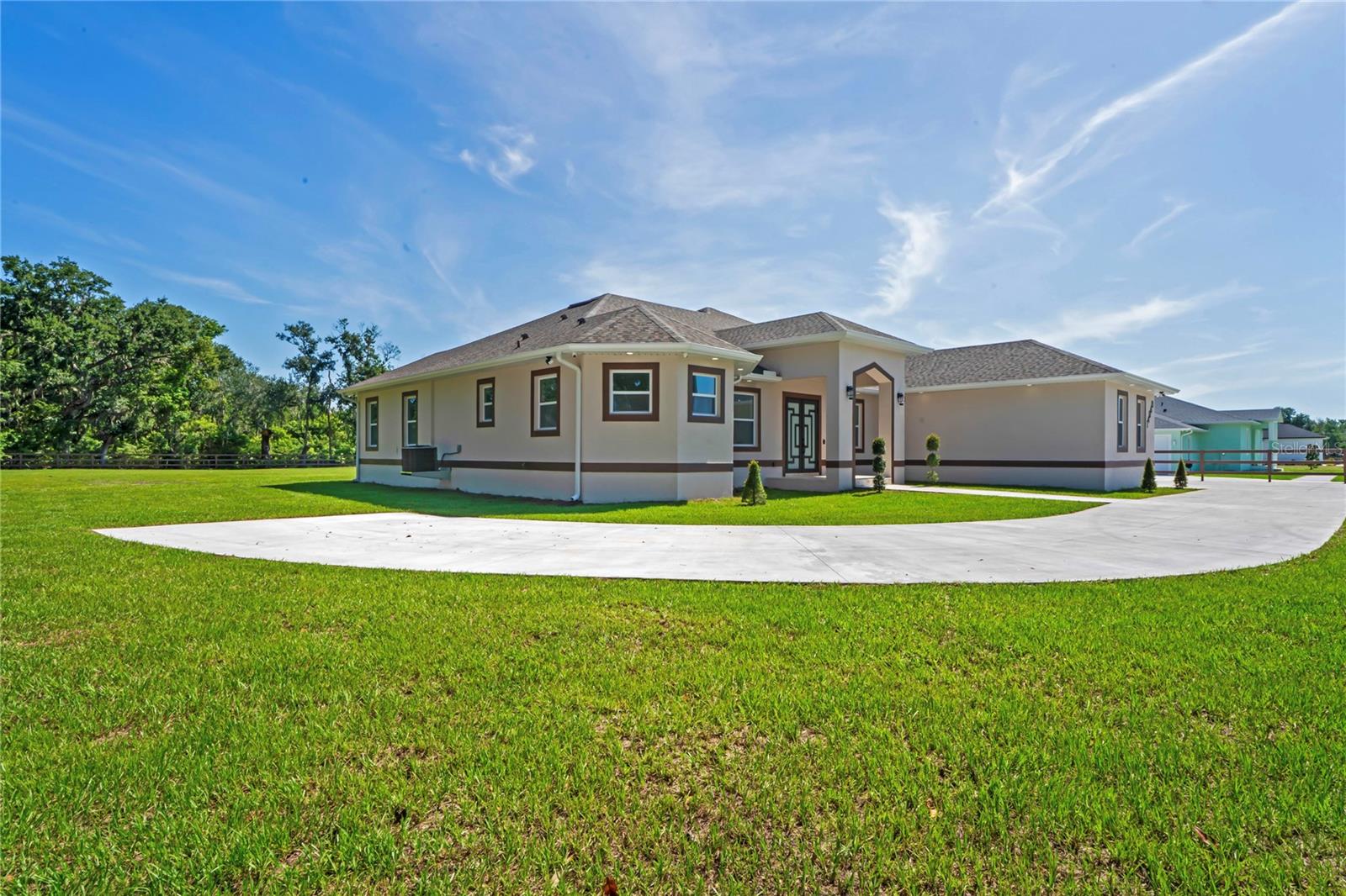 Welcome to Your Florida Home! Newly built in 2025, this stunning modern block home sits on a cleared, fully fenced 1.05-acre lot — beautifully sodded with lush grass, stately palm trees, and a few charming pines for that Florida touch. Step inside through an impressive 9-foot dual door entryway crowned with an elegant chandelier that welcomes you into over 4,600 total square feet of refined living space — including 3,375 sq ft under air with 4 spacious bedrooms and 3.5 luxurious baths. The expansive master suite is truly a private retreat featuring a large his-and-hers walk-in closet, a spa-like bathroom with double vanities, a soaking tub, and a stunning walkthrough triple shower. A second bedroom offers its own ensuite bathroom and walk-in closet, while two additional bedrooms share a convenient Jack-and-Jill bathroom layout — perfect for family or guests. Designed for entertaining, the open floor plan flows seamlessly from the formal living room to a dedicated office with built-in cabinetry, and into the grand family room and gourmet kitchen. The chef’s kitchen boasts an impressive 12’ x 6’ quartz island, extensive white cabinetry, and a complete set of premium KitchenAid stainless steel appliances, including a glass cooktop and sleek range hood. Outside, you’ll love the oversized 3-car garage and expansive wrap-around driveway, providing plenty of parking for family and guests. This is modern Florida living at its finest — spacious, stylish, and move-in ready!