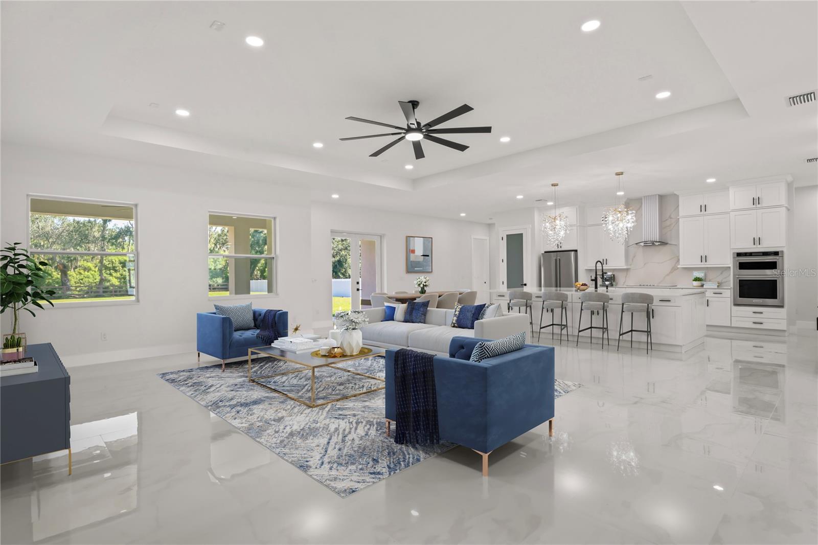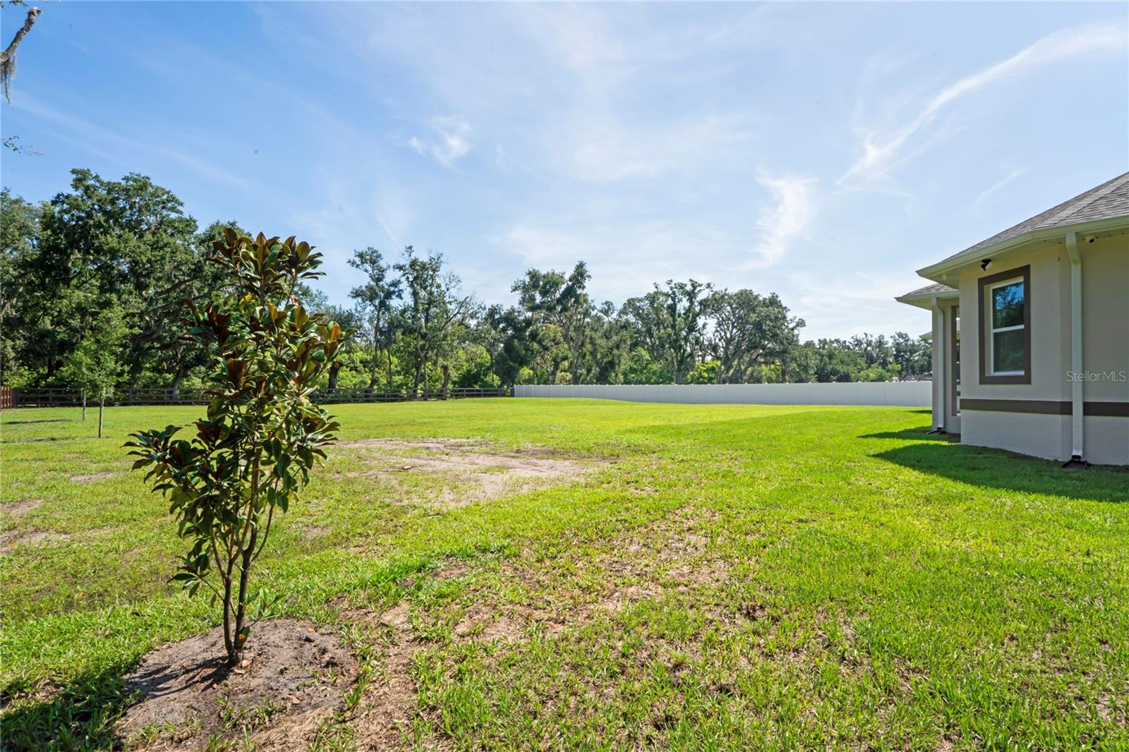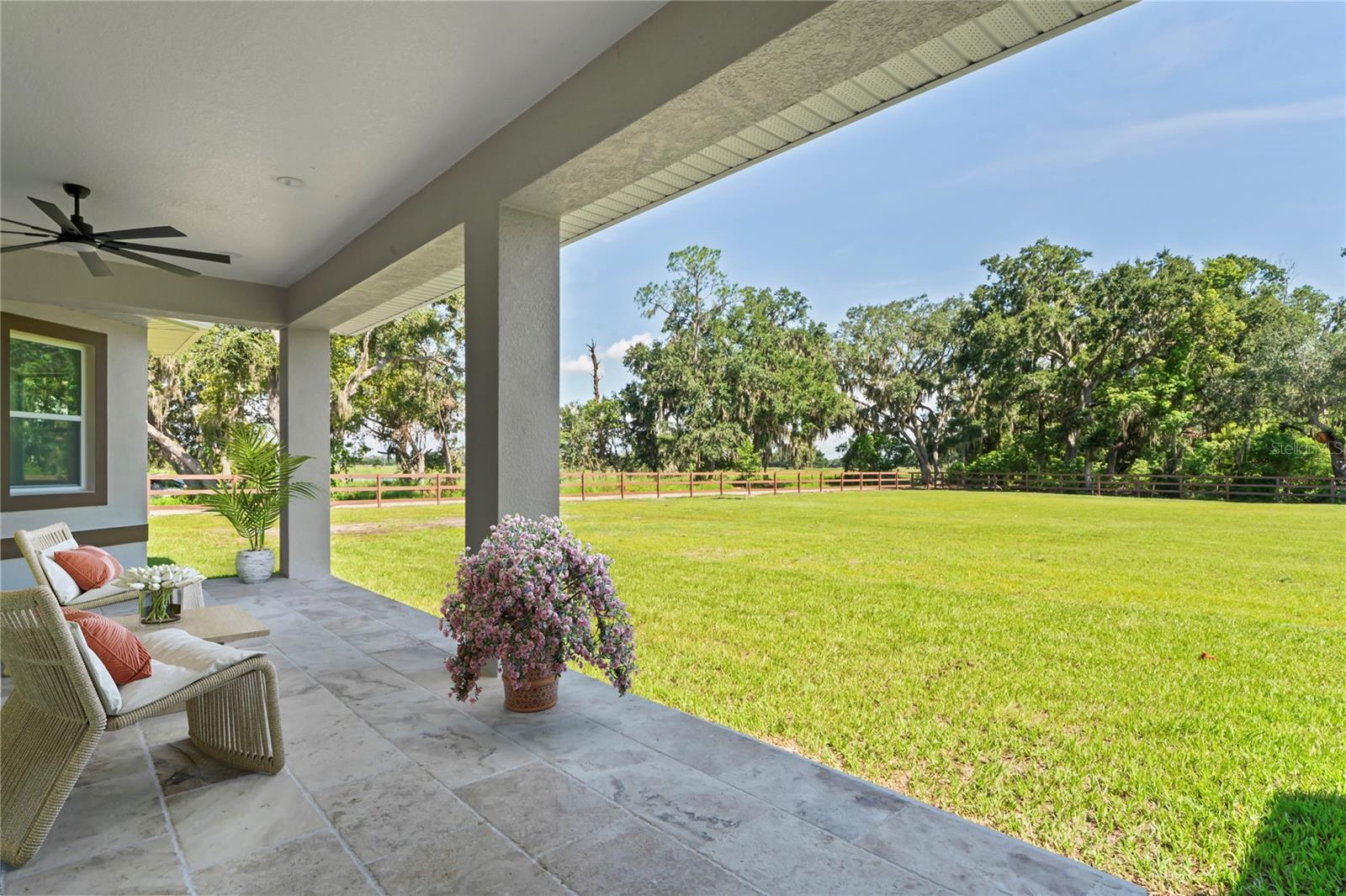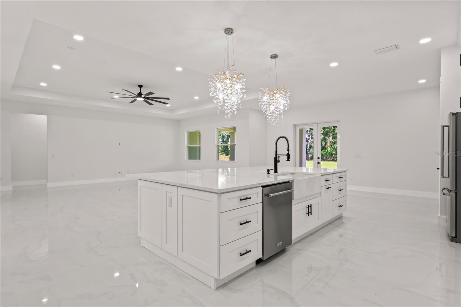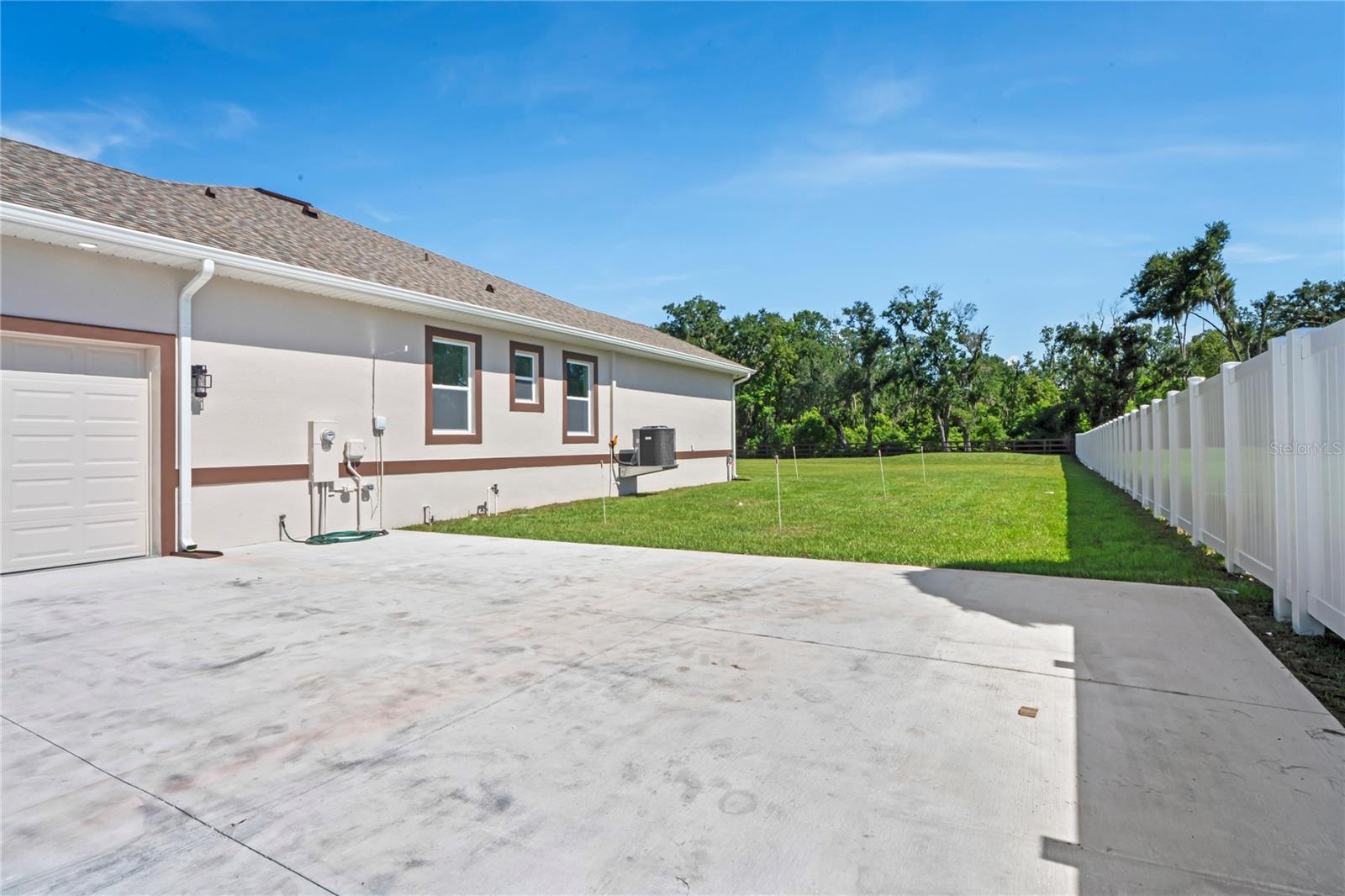 Welcome to Your Florida Home! Newly built in 2025, this stunning modern block home sits on a cleared, fully fenced 1.05-acre lot — beautifully sodded with lush grass, stately palm trees, and a few charming pines for that Florida touch. Step inside through an impressive 9-foot dual door entryway crowned with an elegant chandelier that welcomes you into over 4,600 total square feet of refined living space — including 3,375 sq ft under air with 4 spacious bedrooms and 3.5 luxurious baths. The expansive master suite is truly a private retreat featuring a large his-and-hers walk-in closet, a spa-like bathroom with double vanities, a soaking tub, and a stunning walkthrough triple shower. A second bedroom offers its own ensuite bathroom and walk-in closet, while two additional bedrooms share a convenient Jack-and-Jill bathroom layout — perfect for family or guests. Designed for entertaining, the open floor plan flows seamlessly from the formal living room to a dedicated office with built-in cabinetry, and into the grand family room and gourmet kitchen. The chef’s kitchen boasts an impressive 12’ x 6’ quartz island, extensive white cabinetry, and a complete set of premium KitchenAid stainless steel appliances, including a glass cooktop and sleek range hood. Outside, you’ll love the oversized 3-car garage and expansive wrap-around driveway, providing plenty of parking for family and guests. This is modern Florida living at its finest — spacious, stylish, and move-in ready!
