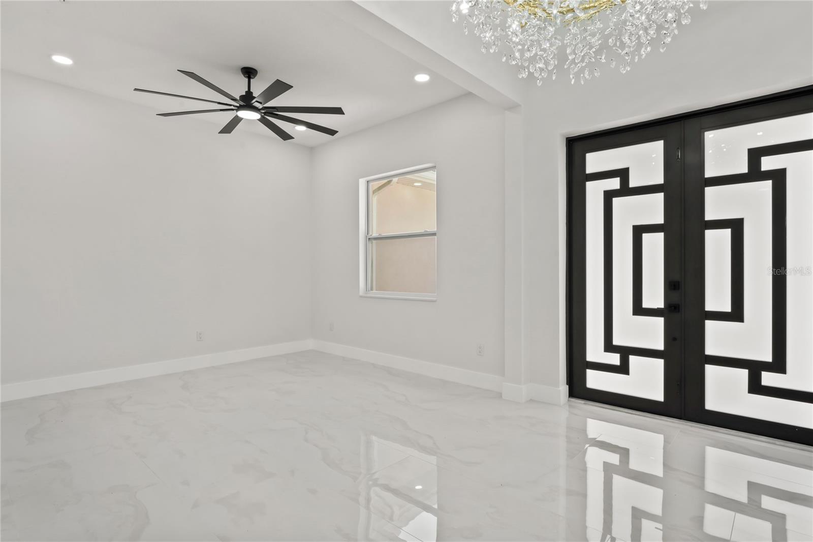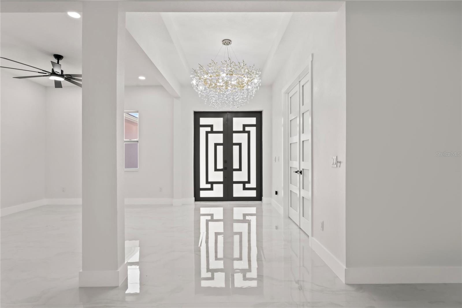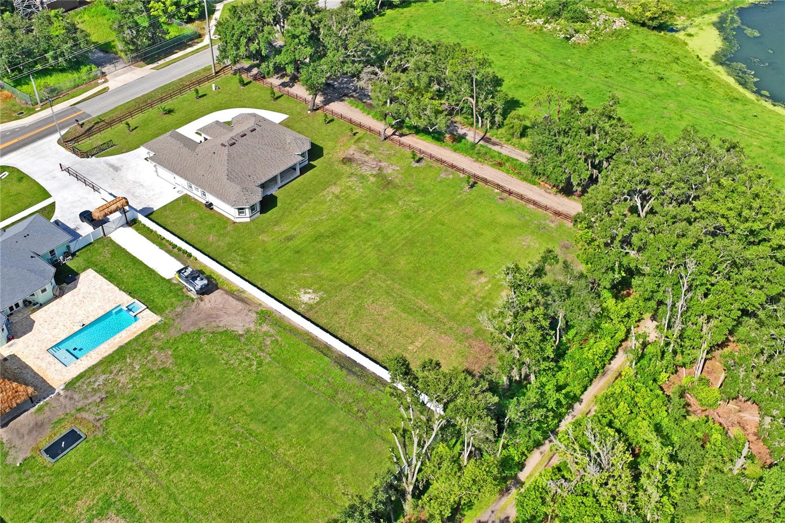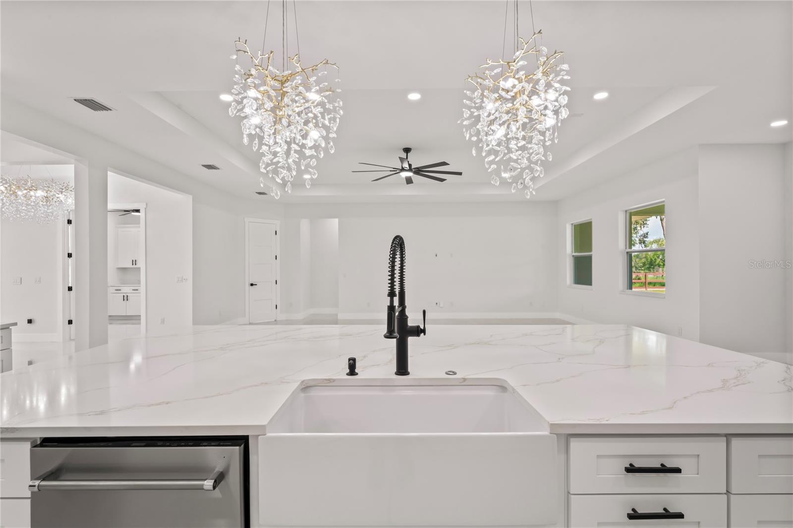 Welcome to Your Florida Home! Newly built in 2025, this stunning modern block home sits on a cleared, fully fenced 1.05-acre lot — beautifully sodded with lush grass, stately palm trees, and a few charming pines for that Florida touch. Step inside through an impressive 9-foot dual door entryway crowned with an elegant chandelier that welcomes you into over 4,600 total square feet of refined living space — including 3,375 sq ft under air with 4 spacious bedrooms and 3.5 luxurious baths. The expansive master suite is truly a private retreat featuring a large his-and-hers walk-in closet, a spa-like bathroom with double vanities, a soaking tub, and a stunning walkthrough triple shower. A second bedroom offers its own ensuite bathroom and walk-in closet, while two additional bedrooms share a convenient Jack-and-Jill bathroom layout — perfect for family or guests. Designed for entertaining, the open floor plan flows seamlessly from the formal living room to a dedicated office with built-in cabinetry, and into the grand family room and gourmet kitchen. The chef’s kitchen boasts an impressive 12’ x 6’ quartz island, extensive white cabinetry, and a complete set of premium KitchenAid stainless steel appliances, including a glass cooktop and sleek range hood. Outside, you’ll love the oversized 3-car garage and expansive wrap-around driveway, providing plenty of parking for family and guests. This is modern Florida living at its finest — spacious, stylish, and move-in ready!